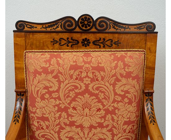 Lo schienale imbottito è sovrastato da una cimasa mistilinea con intarsi a racemi e fiori.