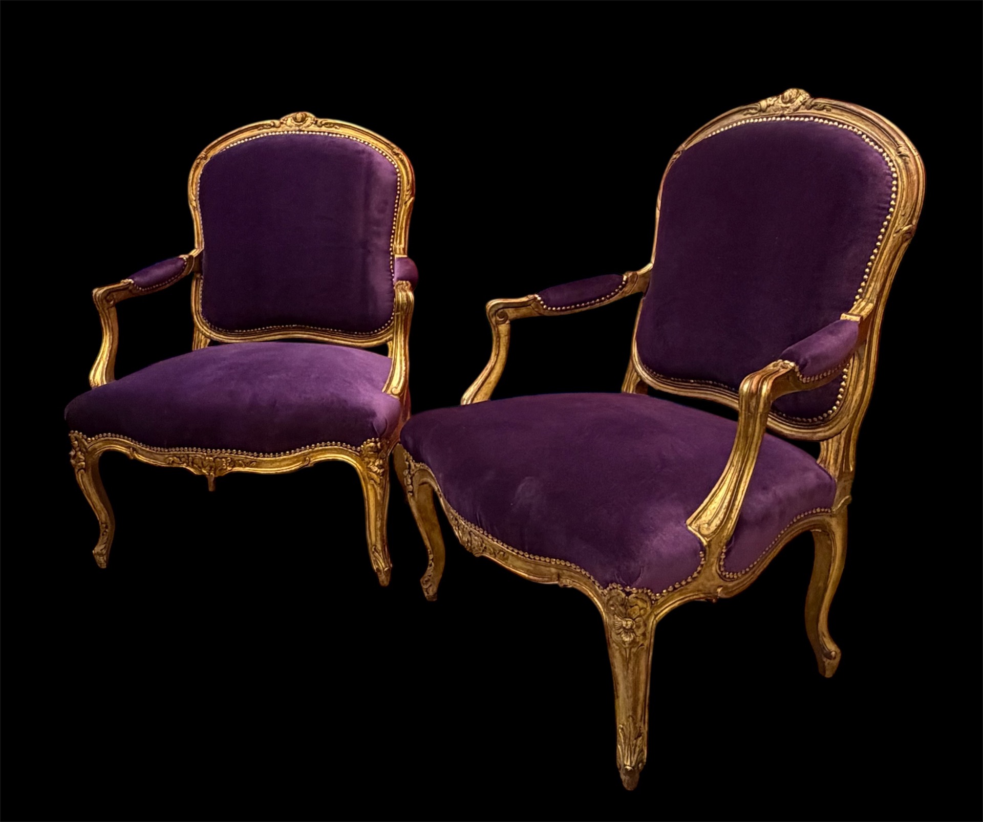 Coppia di poltrone in legno intagliato e dorato , stile Luigi XV con tappezzeria in velluto viola in perfette condizioni