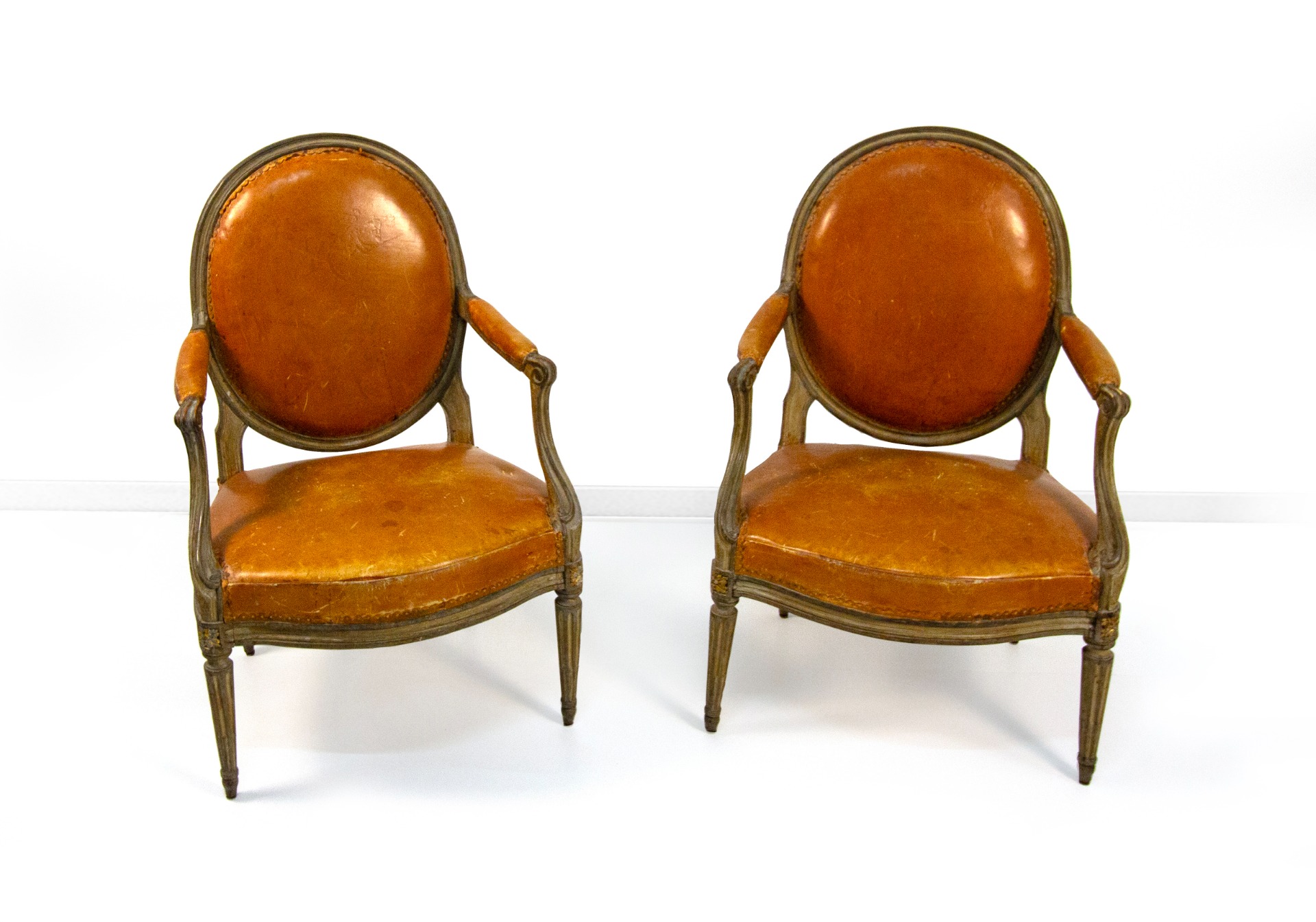Coppia di poltrone in legno laccato, Georges Jacob, Parigi, fine del XVIII secolo, schienale ovale raccordato da braccioli imbottiti su montanti sagomati, cintura diritta e gambe troncoconiche scanalate; schienale e sedile imbottiti e rivestiti in pelle. Recano la stampigliatura: “Georges Jacob”, cm 100x67x61