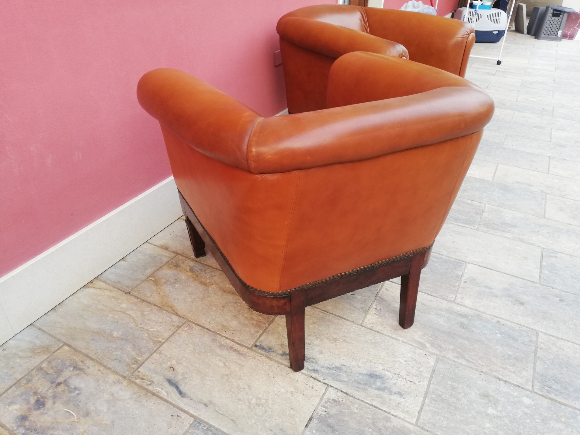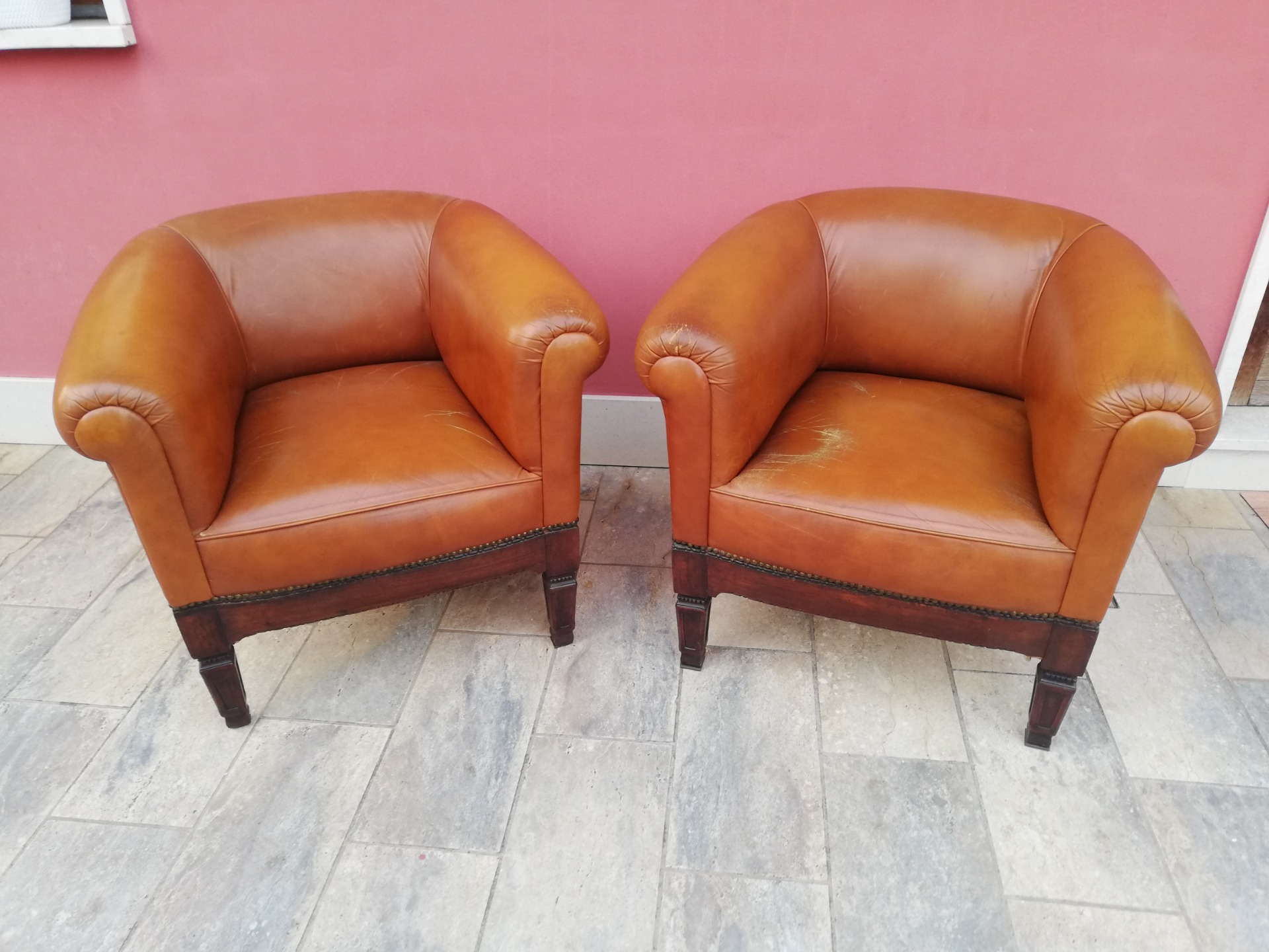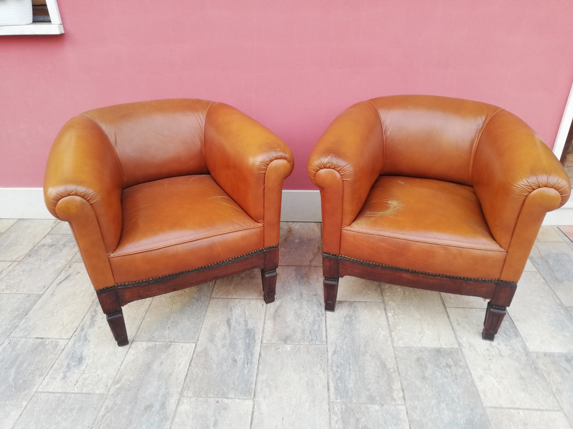 Bellissima questa coppia di poltrone in pelle. Anni 40, minime usure con possibilità di sistemazione pelle nel nostro laboratorio.Siamo a vostra disposizione per foto o domande cell 3282493057.