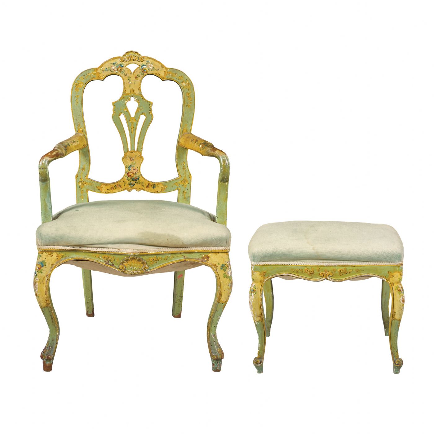 Poltrona e panchetto in legno intagliato e laccato. Venezia, XIX-XX secolo. 50 x 60 x h 94 cm la poltrona, 35 x 50 x h 44 cm il panchetto. Realizzati interamente in legno intagliato, laccato e dipinto. Decorazioni floreali di gusto Rococò su fondo color giallo e verde, con sedute in tessuto...