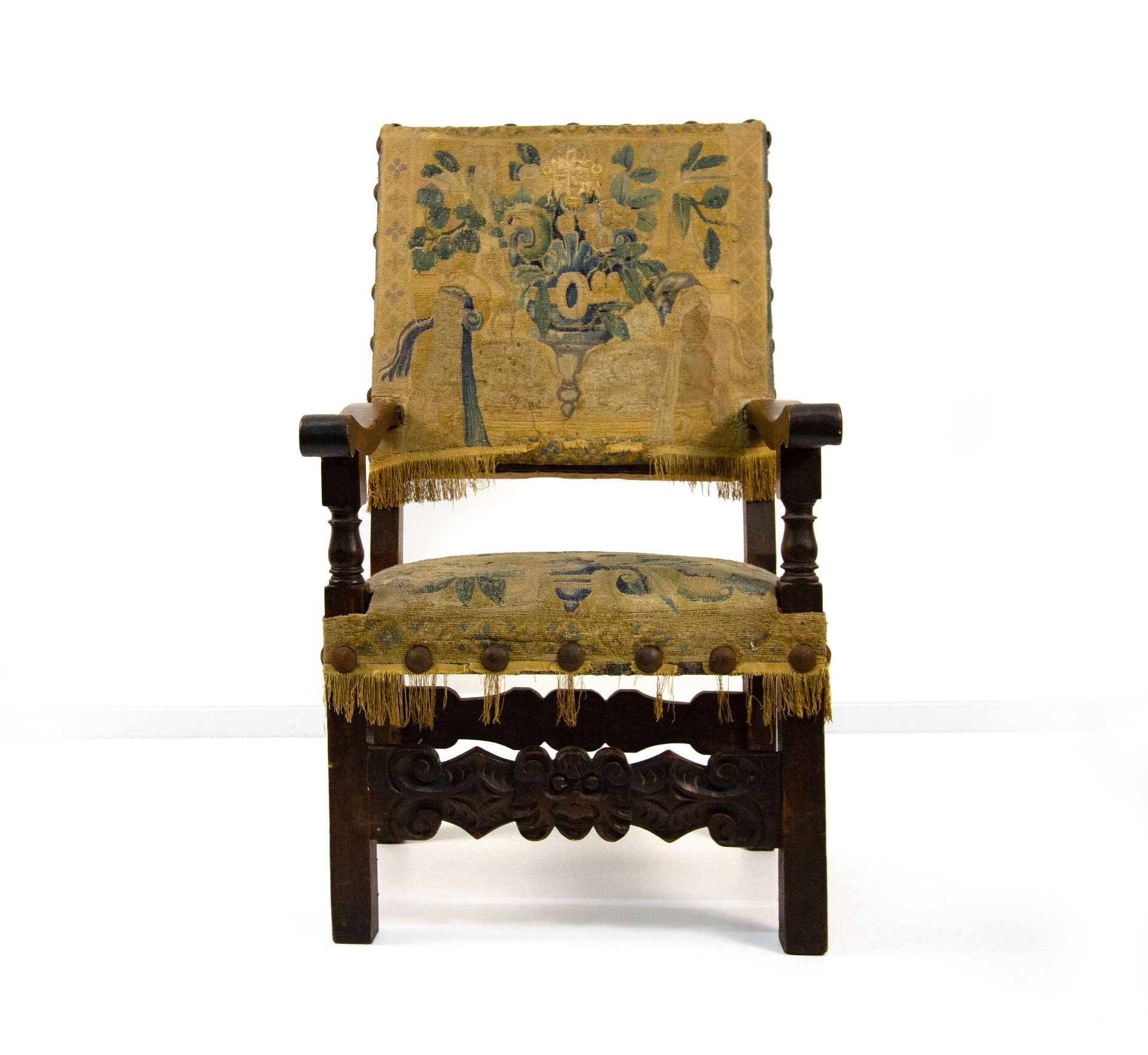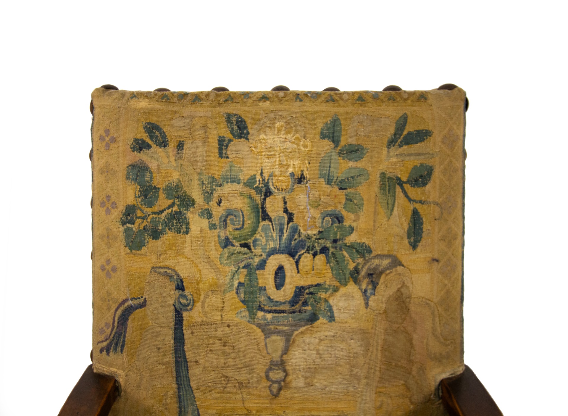 Poltrona in noce, XVII secolo, braccioli lievemente sagomati su montanti torniti a fuso; gambe quadrangolari raccordate da una fascia scolpita e intagliata a volute. Schienale e sedile imbottiti e rivestiti in tessuto ad arazzo coevo, cm 112x66x62, altezza seduta cm 49