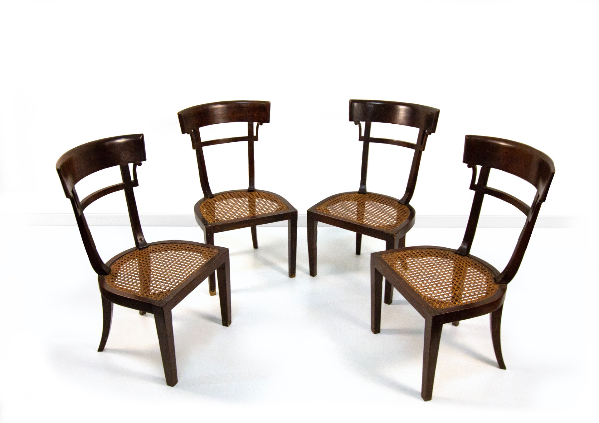 Quattro sedie in mogano, XIX secolo, schienale a giorno con fascia superiore avvolgente, sedile incannucciato e gambe a sciabola, cm 86x48x42, altezza seduta cm 39 2025.59.43 Ad integrazione delle descrizioni, la galleria “Antichità Giglio” rende disponibili, a richiesta, condition report sullo stato di conservazione dei propri beni e preventivi di trasporto nazionali ed internazionali.