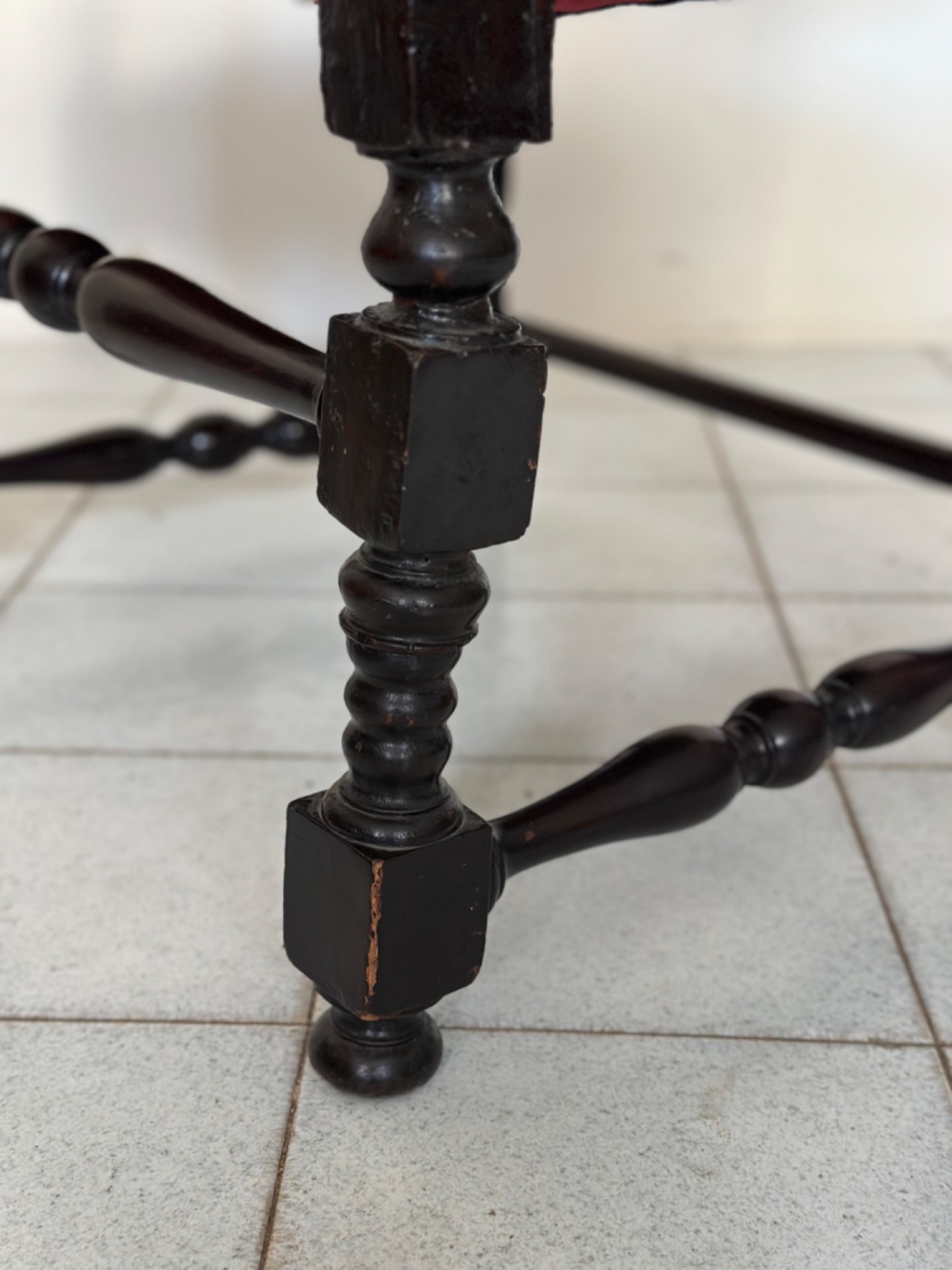Trono seggiolone in noce epoca prima metà del’ 700 di area emiliana ( Bologna ) con braccioli sagomati a ricciolo sostegni anteriori e traverse tornite