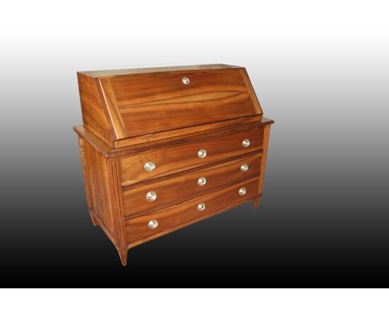 Grande comò francese di fine 1700, stile Luigi XVI, in legno di ciliegio. Presenta corpo superiore a ribalta con internamente cassettini e piano scrittoio, corpo inferiore dotato di 3 grandi cassetti, le maniglie in bronzo e i piedini a piramide rovesciata completano questo mobile antico di pregiata fattura