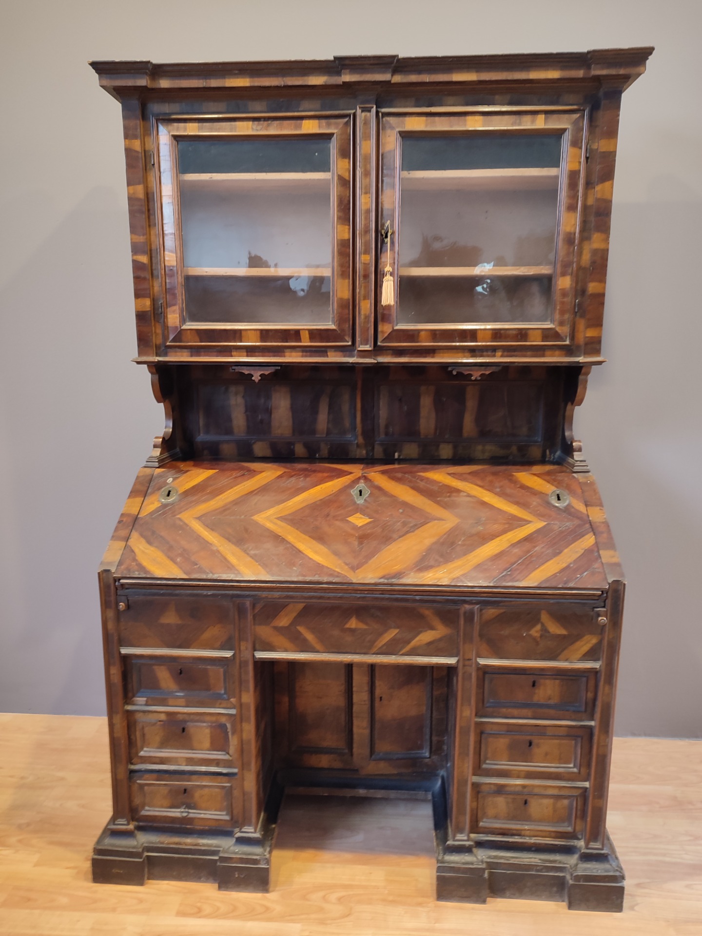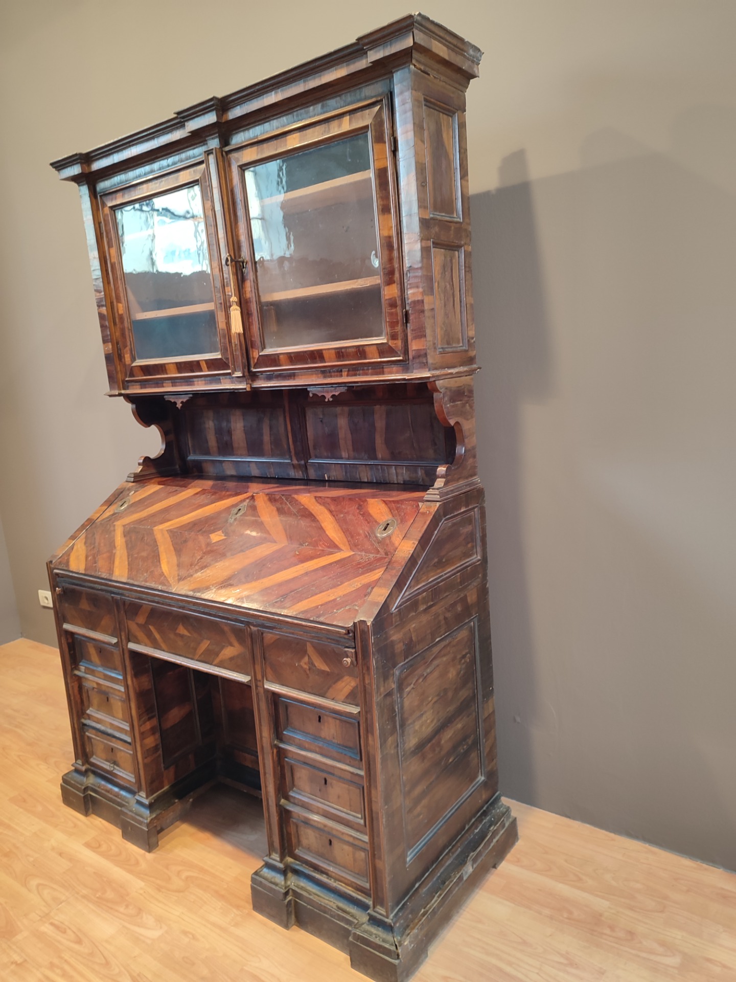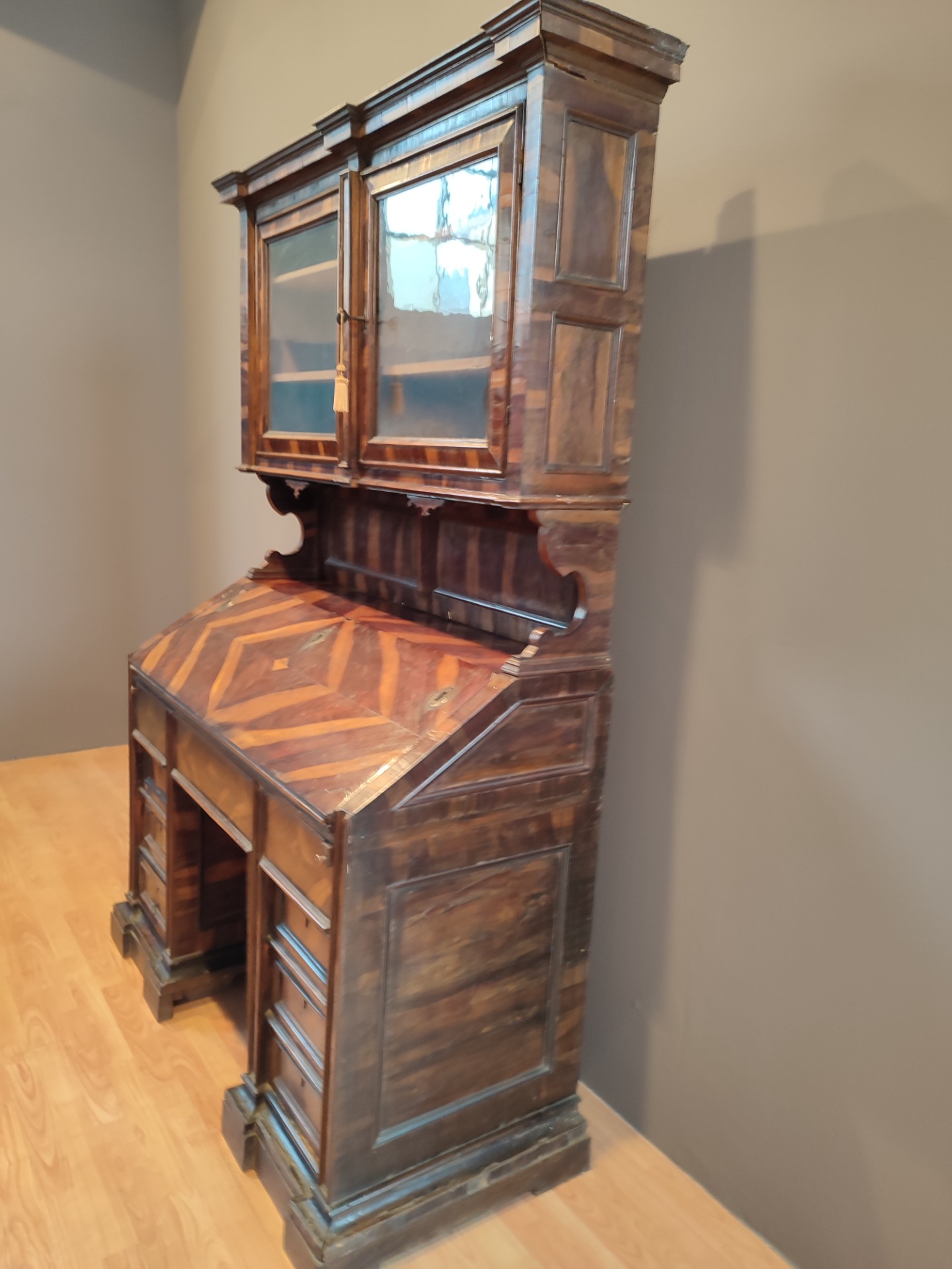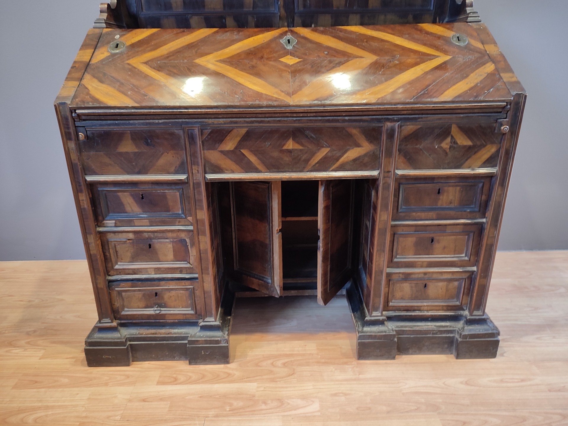 Sicuramente commissionata questa ribalta con alzata ,l'astronauta in essenza di carrubo.Epoca Luigi XIV Venezia.