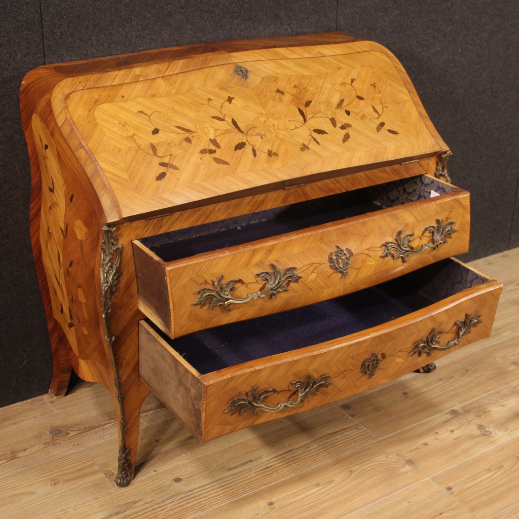 Ribalta francese della metà del XX secolo. Mobile mosso e bombato intarsiato con decori floreali in legni di bois de rose, acero, noce, ciliegio e legni da frutto. Ribalta munita di due cassetti esterni di ottima capacità. Interno della calatoia completo di quattro cassettini, ampio vano centrale porta documenti e piano scrittoio rivestito in finta pelle intarsiata con qualche segno di usura. Mobile di grande qualità ed eleganza ideale da inserire in un salone o studio. Ribalta adornata da maniglie, bocchette e fregi in bronzo dorato e cesellato (vedi foto). Mancante di chiave, presenta qualche segno del tempo, strutturalmente sana, nel complesso in buono stato conservativo.
