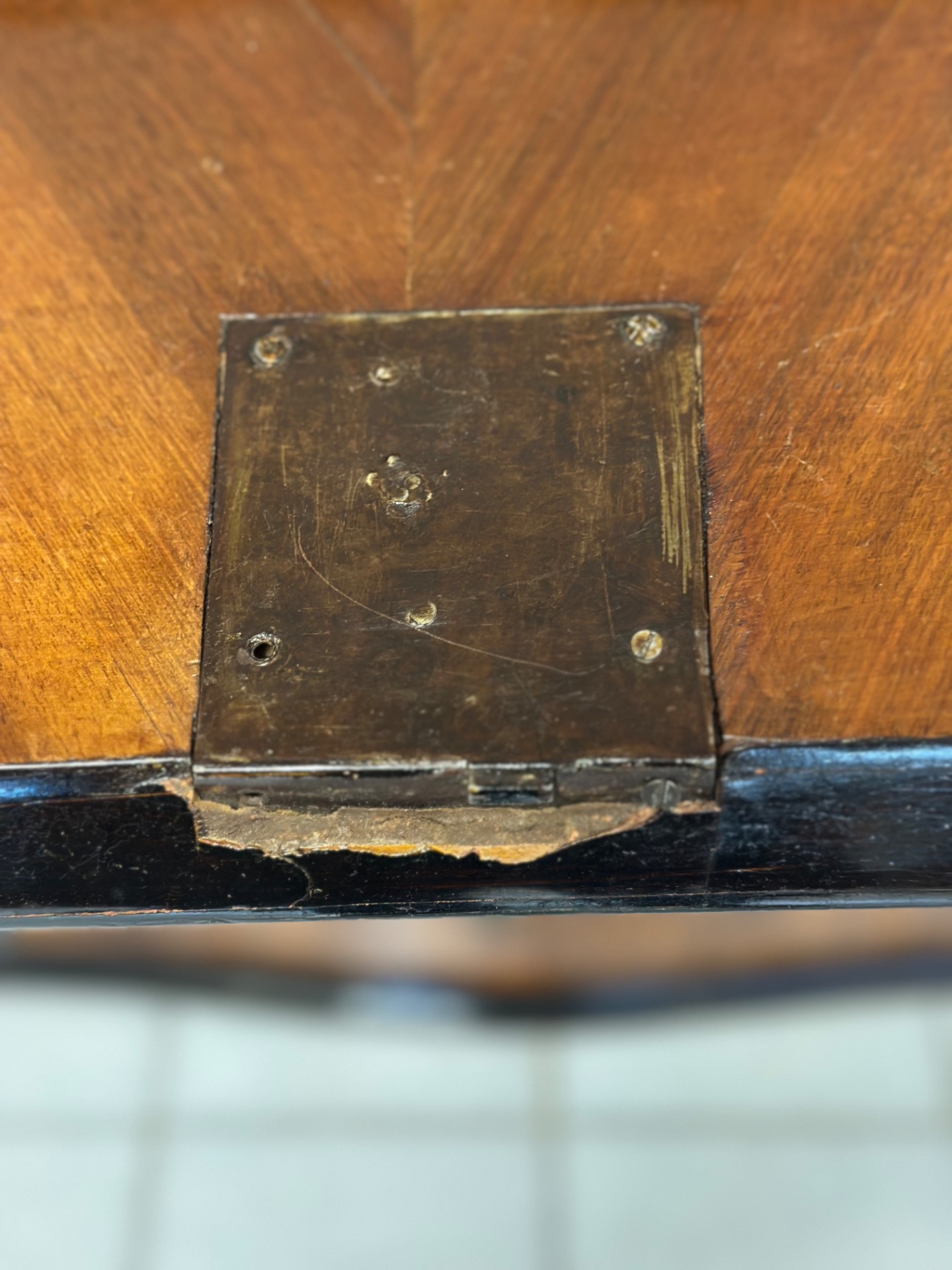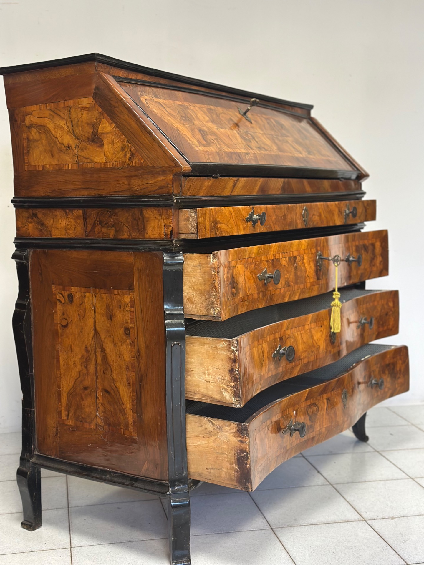 Ribalta lombarda milanese tutta lastronata in noce e radica di noce e legni vari con profili ebanizzati , fronte mosso con tre cassetti e un cassetto a mezza altezza , anta celante con sei cassettini