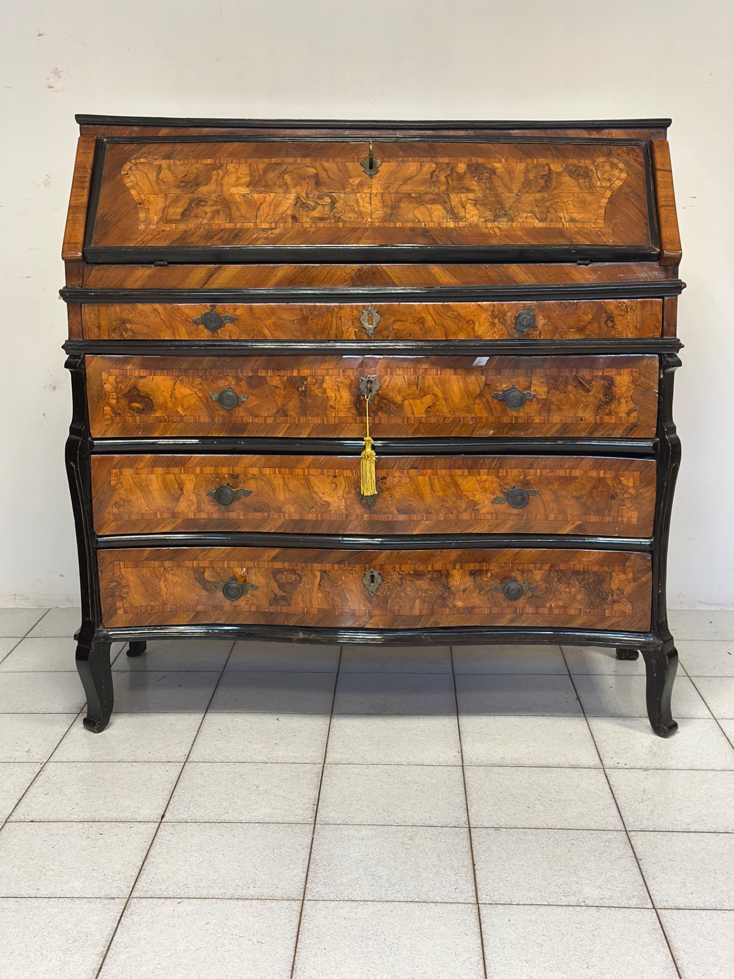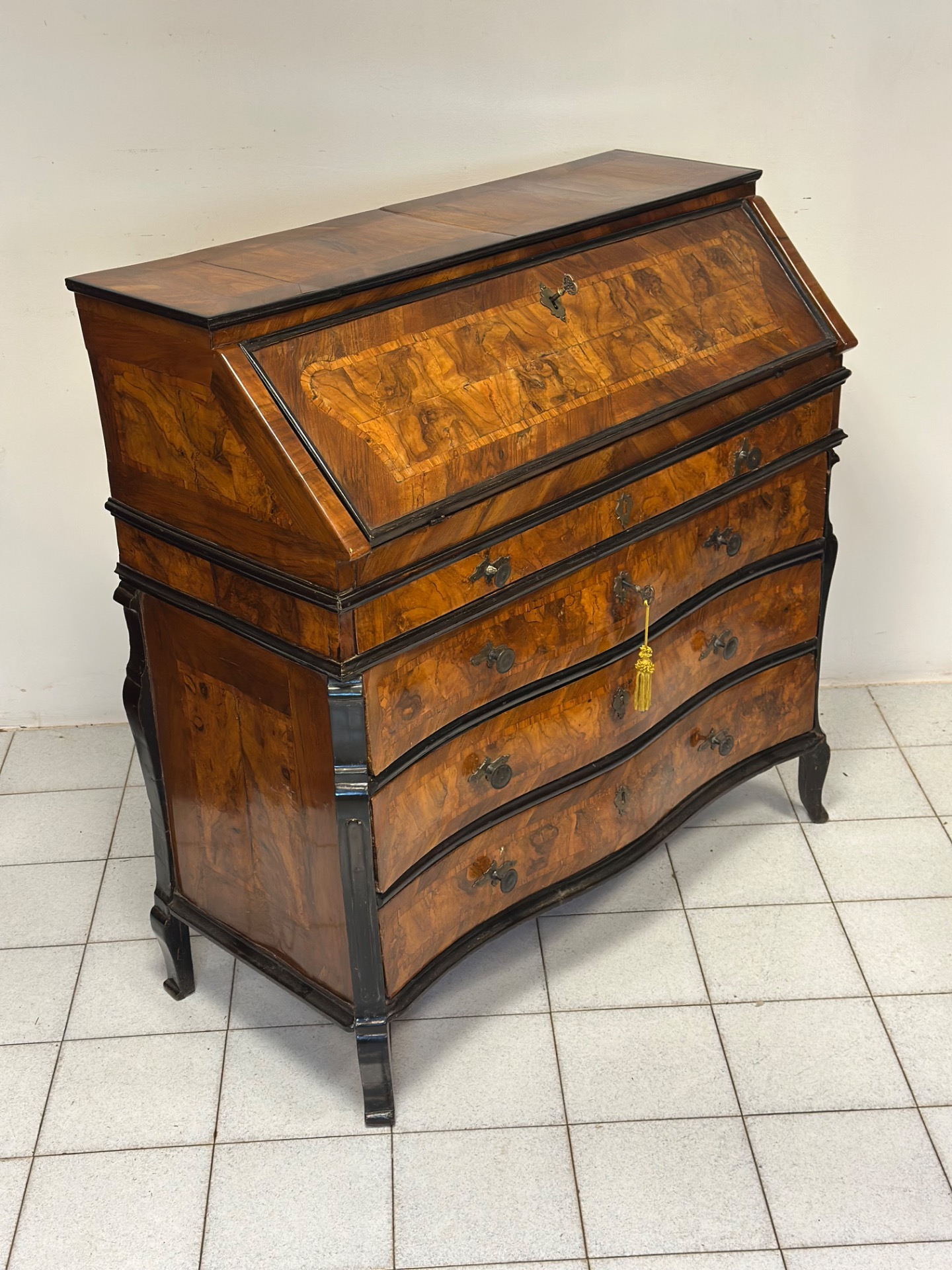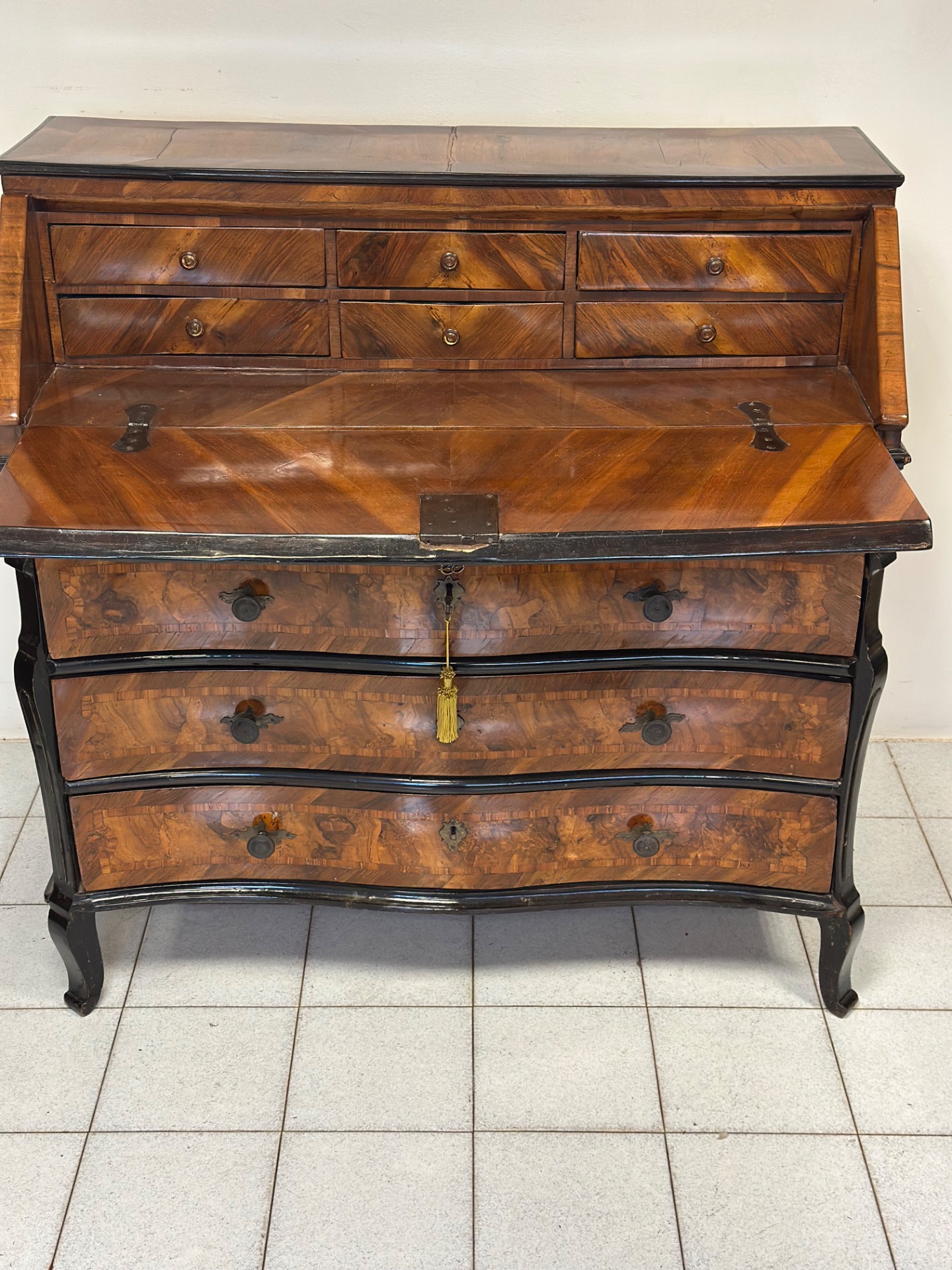 Ribalta lombarda milanese tutta lastronata in noce e radica di noce e legni vari con profili ebanizzati , fronte mosso con tre cassetti e un cassetto a mezza altezza , anta celante con sei cassettini Lombardia Milano pieno 700 Luigi XV misure : L 115 / H 113 / P 52 si certifica la sua autenticità si rilascia fattura di vendita spedizioni in tutta Europa non esitate a contattarci accettiamo pagamento pay pal visa Mastercard