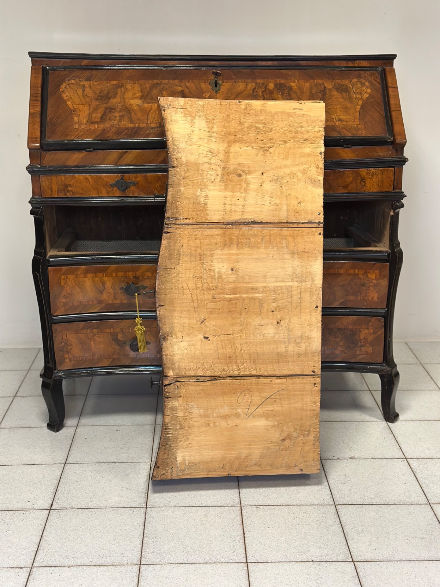 Ribalta lombarda milanese tutta lastronata in noce e radica di noce e legni vari con profili ebanizzati , fronte mosso con tre cassetti e un cassetto a mezza altezza , anta celante con sei cassettini Lombardia Milano pieno 700 Luigi XV misure : L 115 / H 113 / P 52 si certifica la sua...
