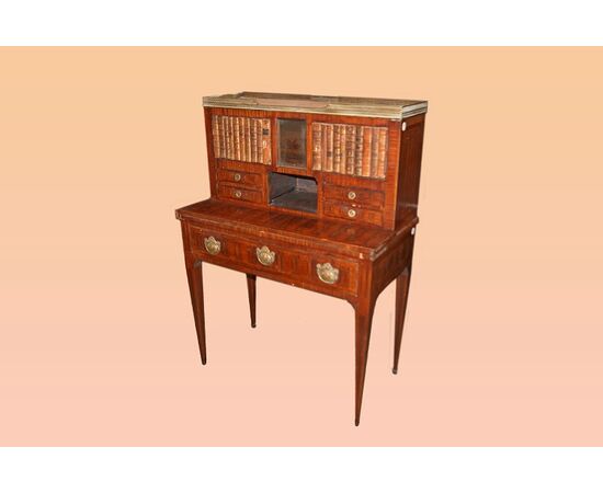 Stupendo scrittoio francese di inizio 1800, stile Luigi XVI, in legno di bois de violette. Presenta nella parte superiore alzatina con marmo perimetrato da ringhierina in ottone, cassettini, specchio e antine con libri finti in pelle; piano scrittoio a ribalta con piano in pelle e bronzi.