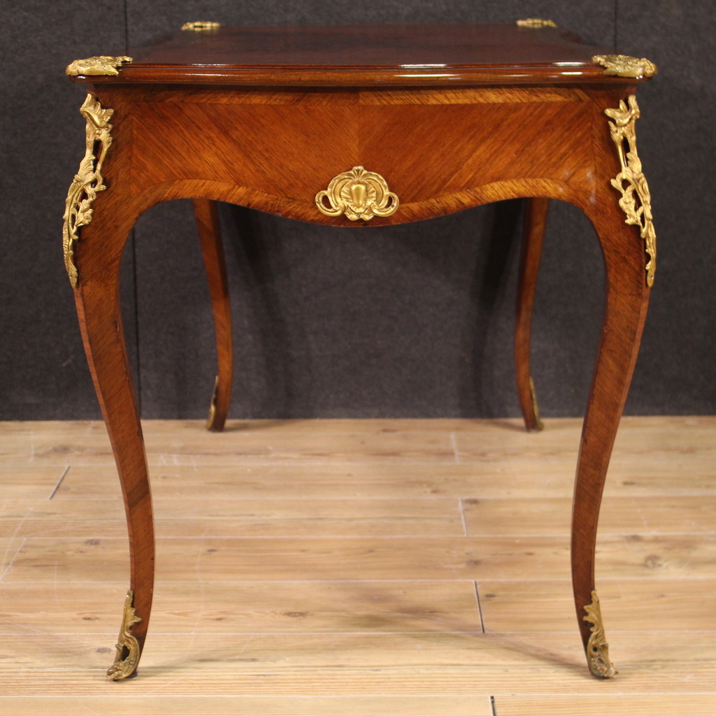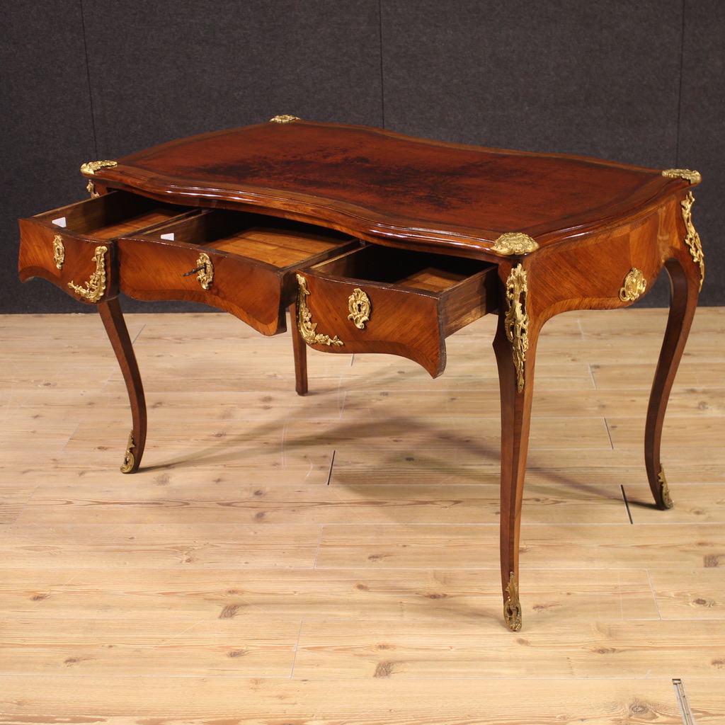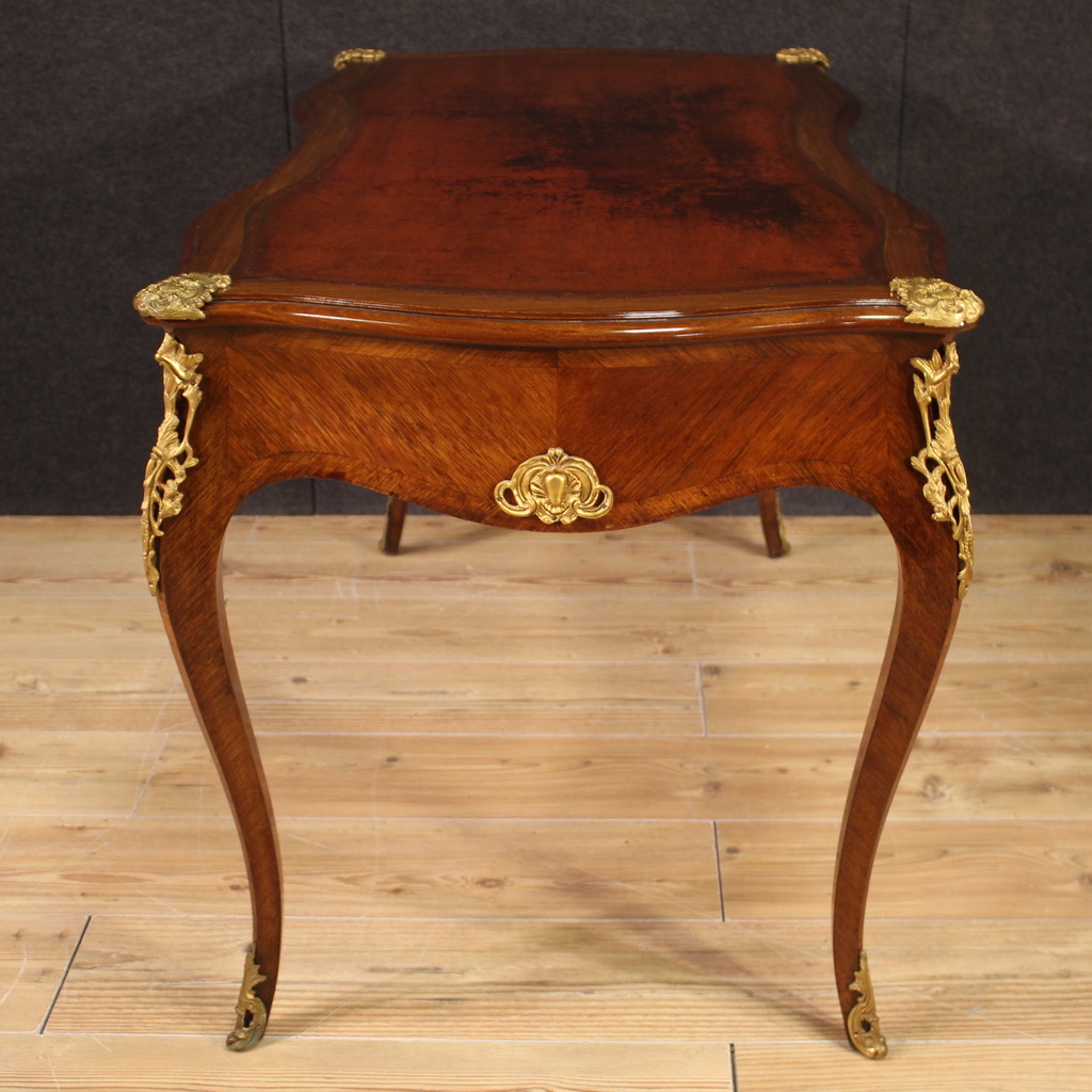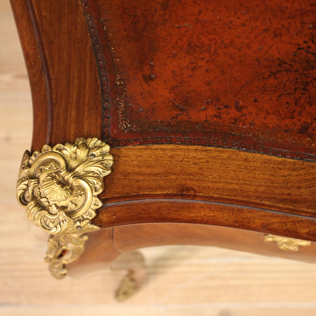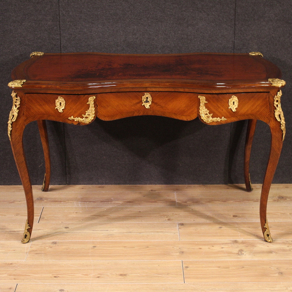 Scrittoio francese della fine del XIX secolo. Mobile Napoleone III, mosso e bombato, scolpito e impiallacciato in legno di mogano. Scrivania finita da centro arricchita da bronzo dorato e cesellato, di ottima qualità. Mobile completo di tre cassetti frontali di buona capacità, piano superiore ligneo in carattere rivestito in pelle con diversi segni di usura che donano ancor più fascino al mobile (vedi foto). Scrittoio di grande eleganza, ideale da inserire in un salone o studio, utile anche per uso professionale. Completo di una chiave funzionante, la serratura del cassetto centrale è mancante di molla (de revisionare). Serrature dei cassetti laterali perfettamente funzionanti. Mobile nel complesso in buono stato conservativo.