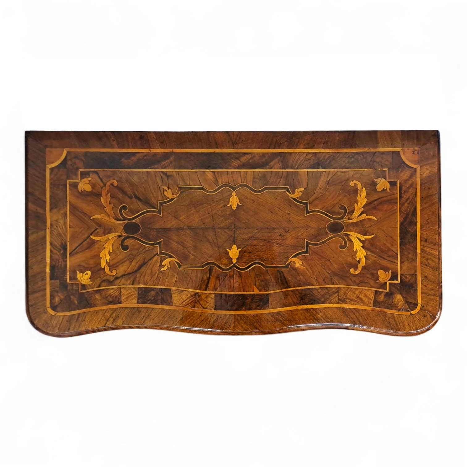 Piano: Il piano superiore è il fulcro decorativo del mobile, interamente lastronato ed intarsiato con motivo geometrico e vegetale. Una riserva centrale sagomata in noce dalle ricche venature è circondata da una cornice filettata e da motivi a voluta fogliacei in legno chiaro, creando un forte impatto visivo.