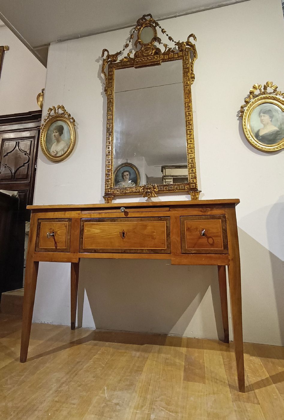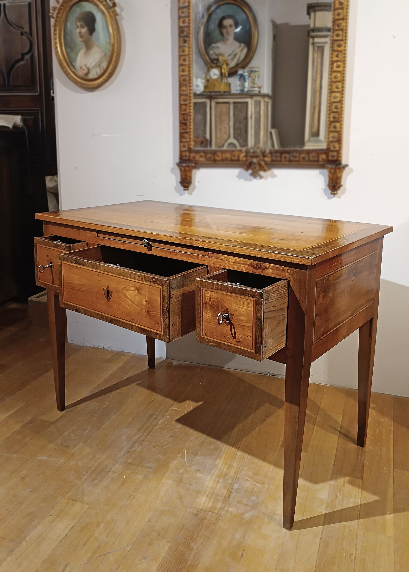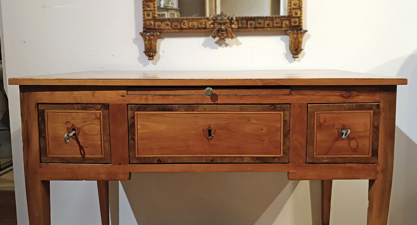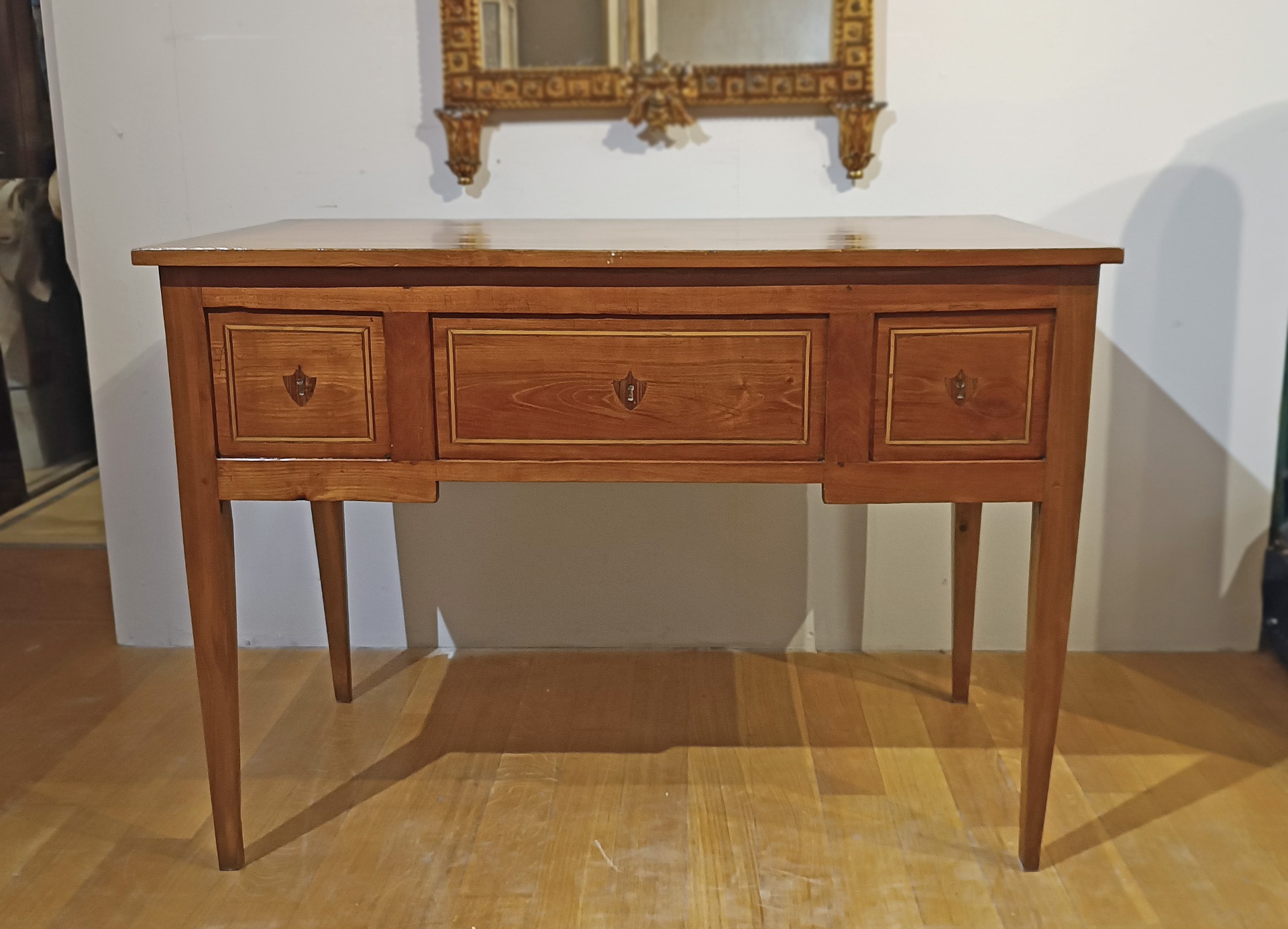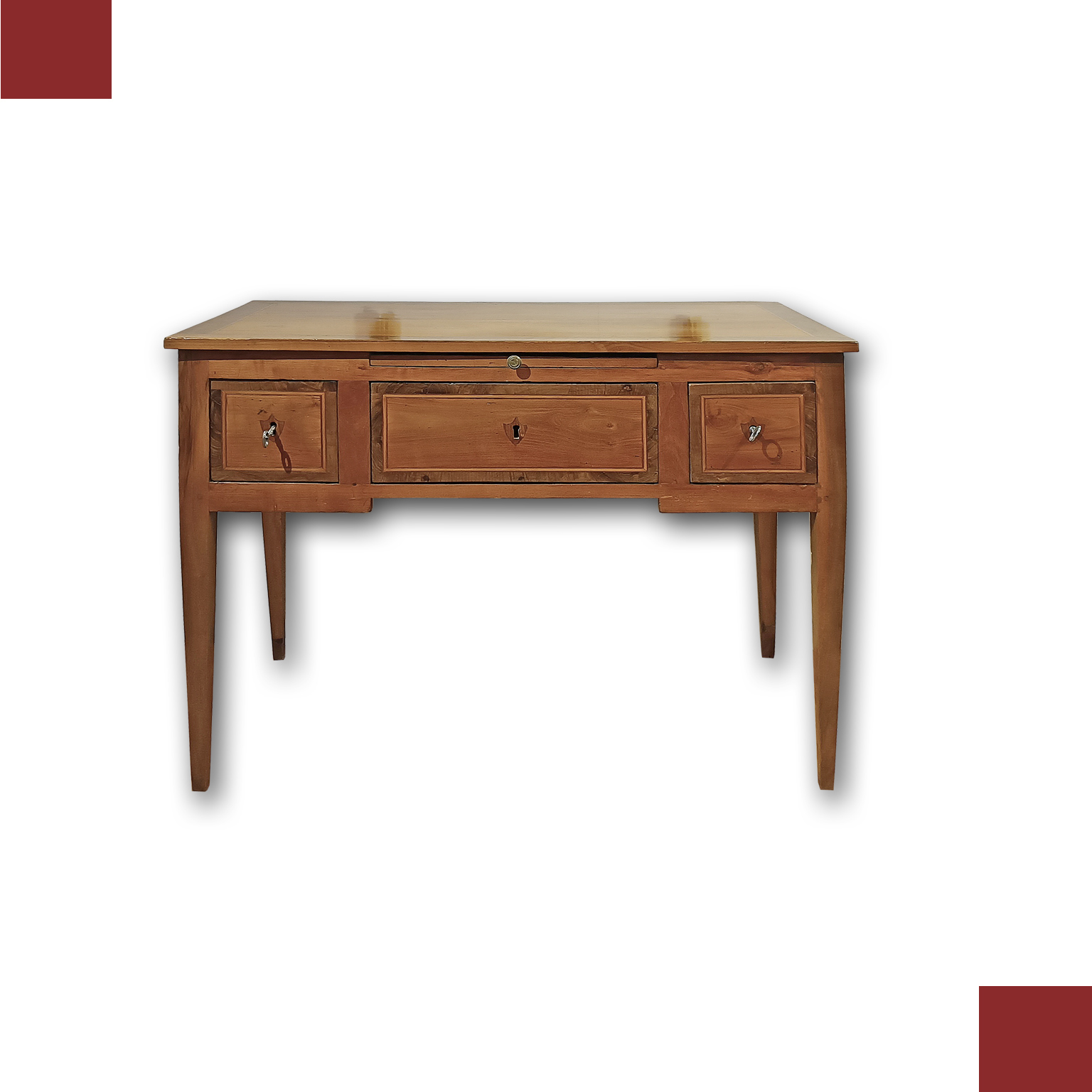 Elegante piccolo scrittoio da centro lastronato in legno di noce, con intarsi in legni di vari frutti. Lo scrittoio si distingue per le gambe troncopiramidali, tipiche del periodo, e presenta intarsi a filetti geometrici sul fronte, sul piano sui lati e sul retro. Il mobile dispone di tre cassetti sul fronte, ideali ed ergonomici per riporre oggetti e apribili con chiavi, mentre sul retro sono riproposti i tre cassetti però finti, consentendo di posizionare lo scrittoio anche al centro della stanza. È inoltre dotato di un piccolo piano estraibile, rivestito in tessuto verde. Si tratta di uno scrittoio di grande gusto ed eleganza, in grado di arredare con classe qualsiasi ambiente. Manifattura toscana del periodo neoclassico, intorno alla seconda metà del XVIII secolo. Misure: H x L x P 76 x 107 x 57cm
