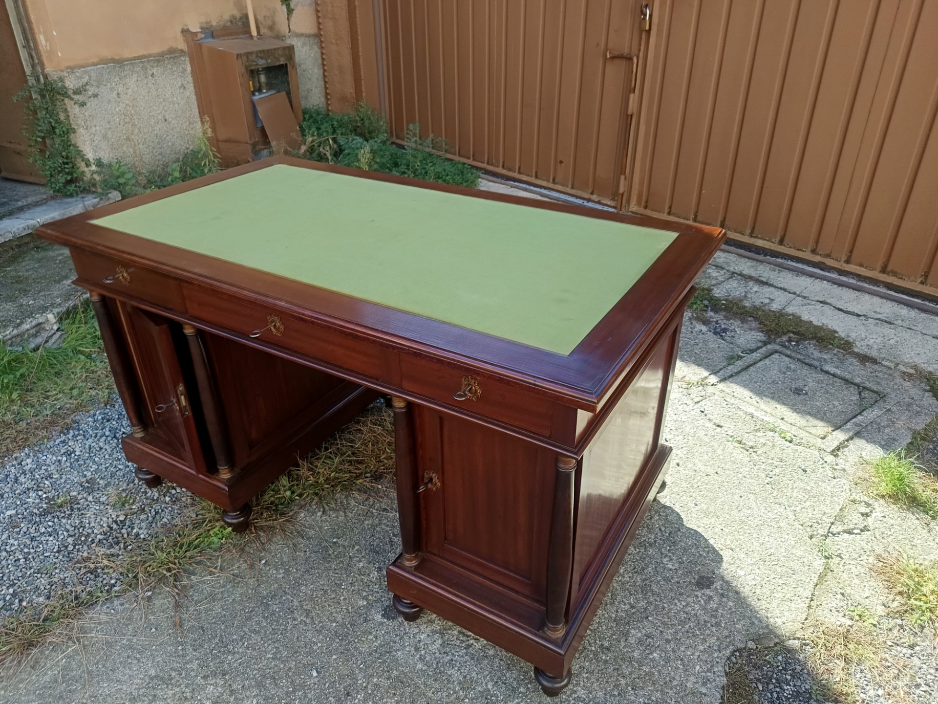 Scrivania italiana dei primi del Novecento di gusto Impero. Colonne e capitelli in ottone. Misure: cm 138 x 80 x 65