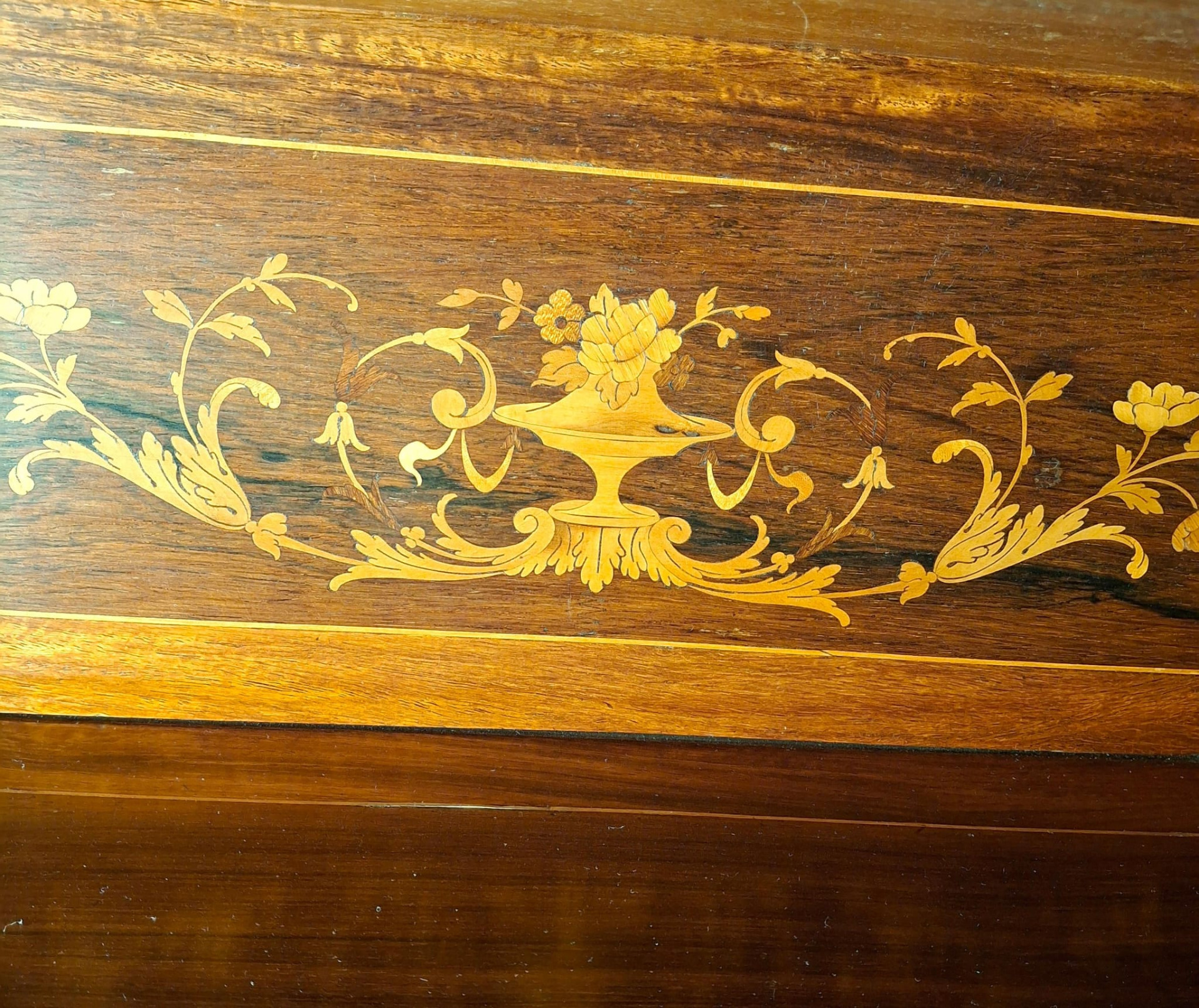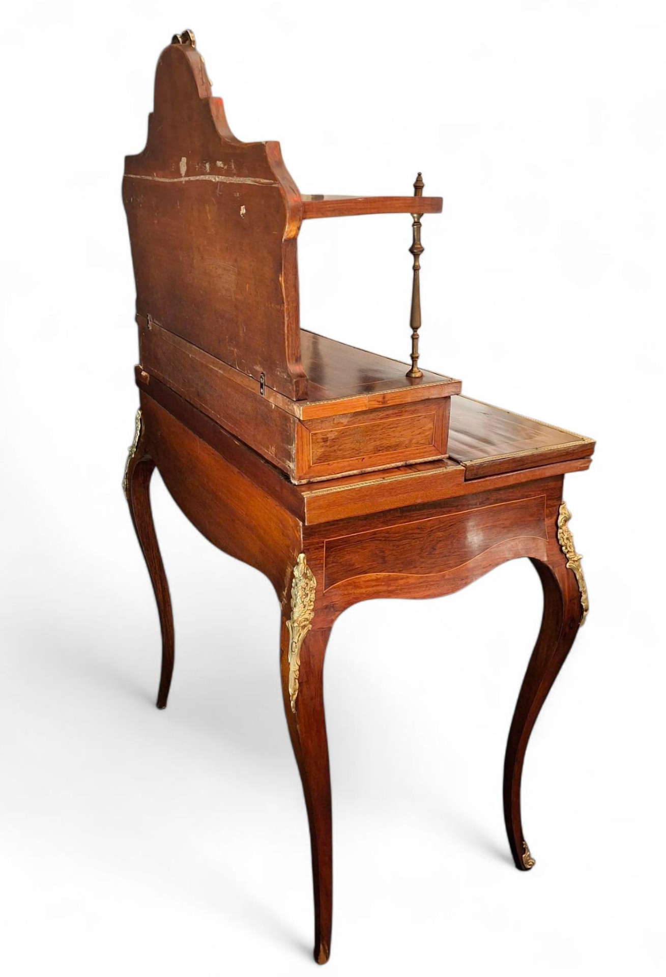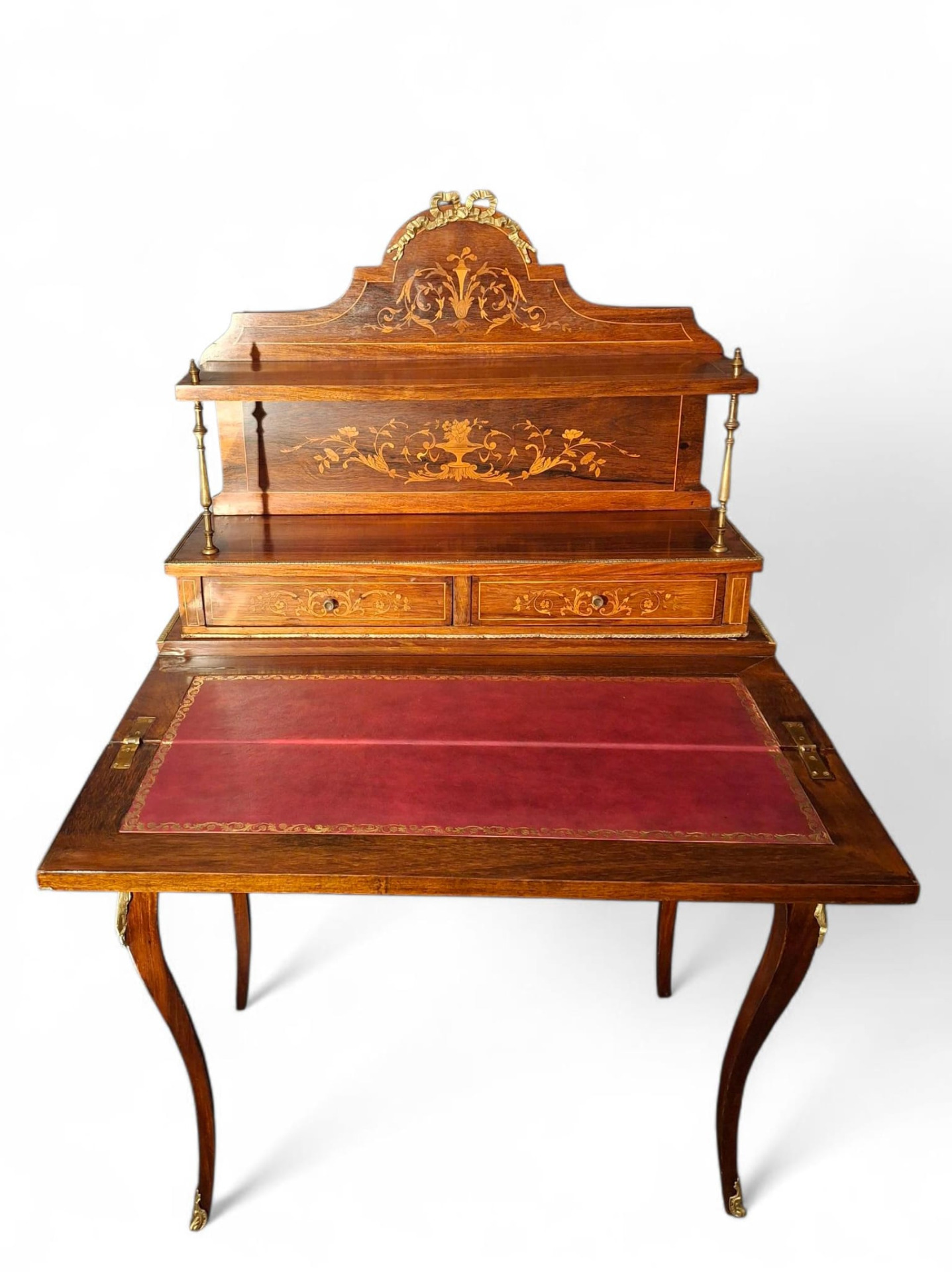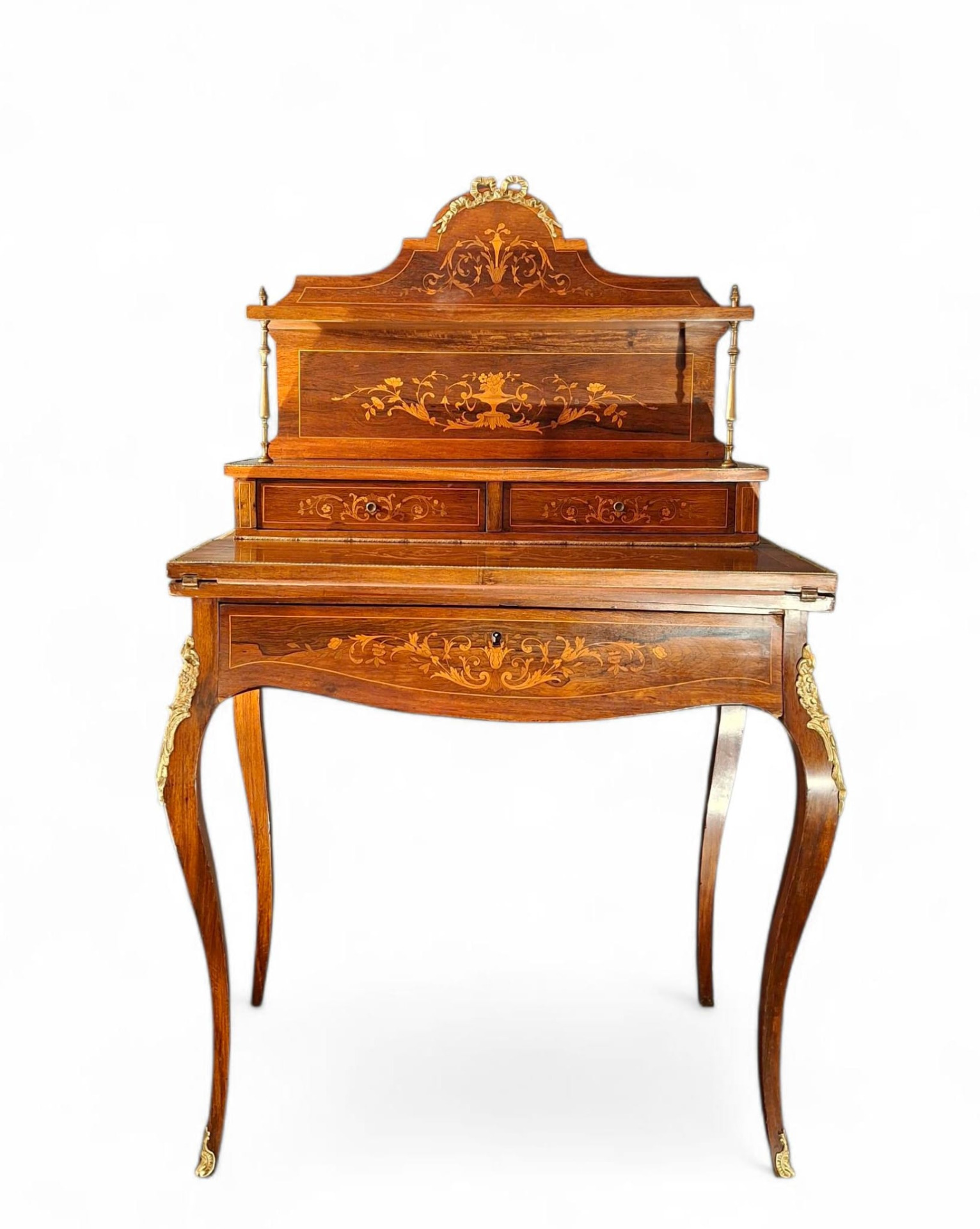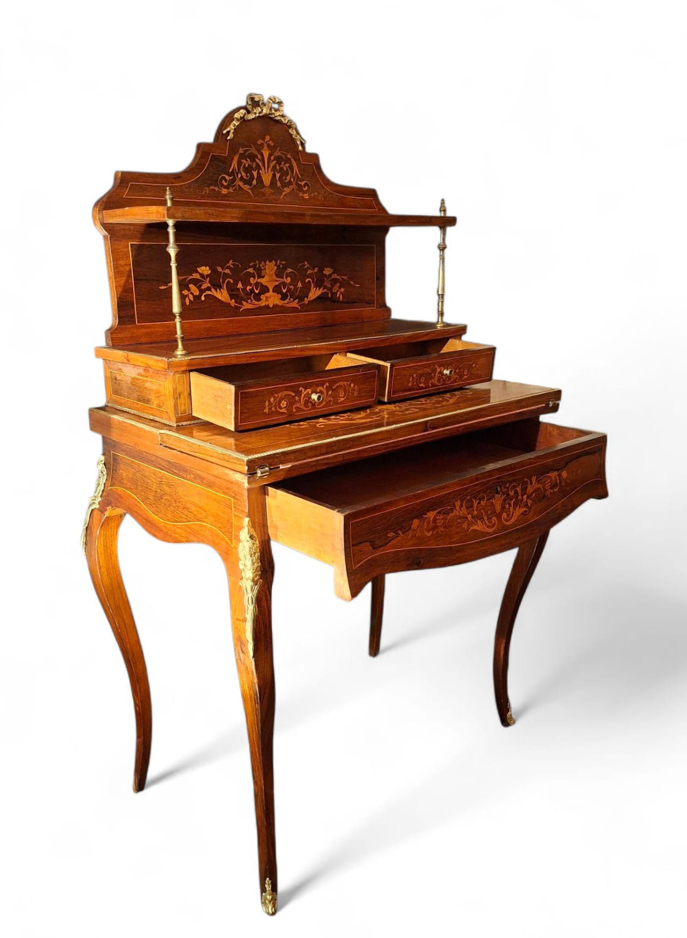 Scrittoio Bonheur du Jour finemente intarsiato di varie essenze, applicazioni e profilature in ottone, scrivania a ribalta con pelle all'interno, tre cassetti, ebanisteria francese, epoca Napoleone III, fine XIX secolo, massimo ingombro 83x50 cm, altezza 132 cm.
