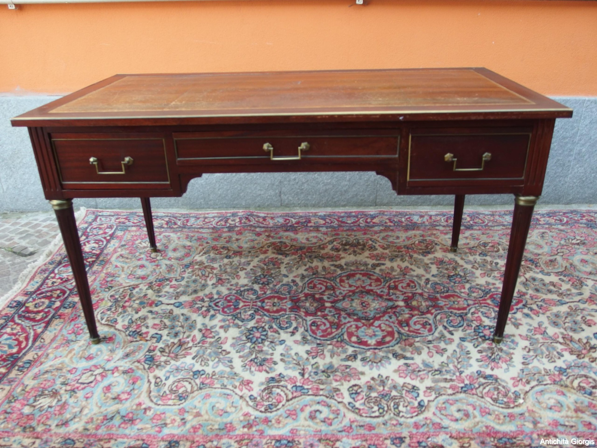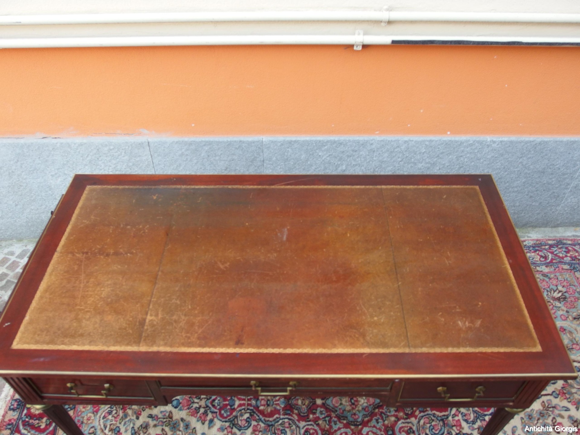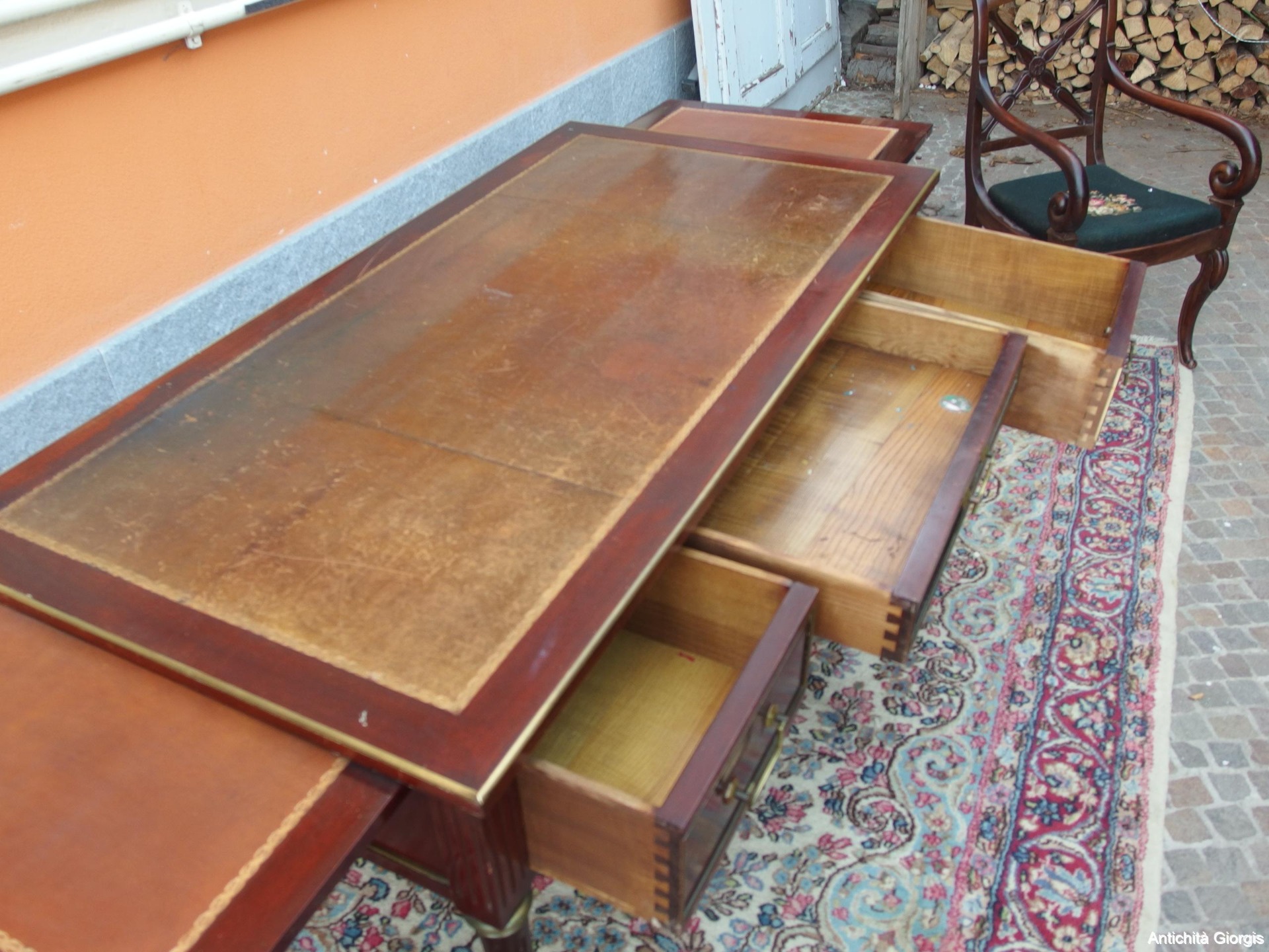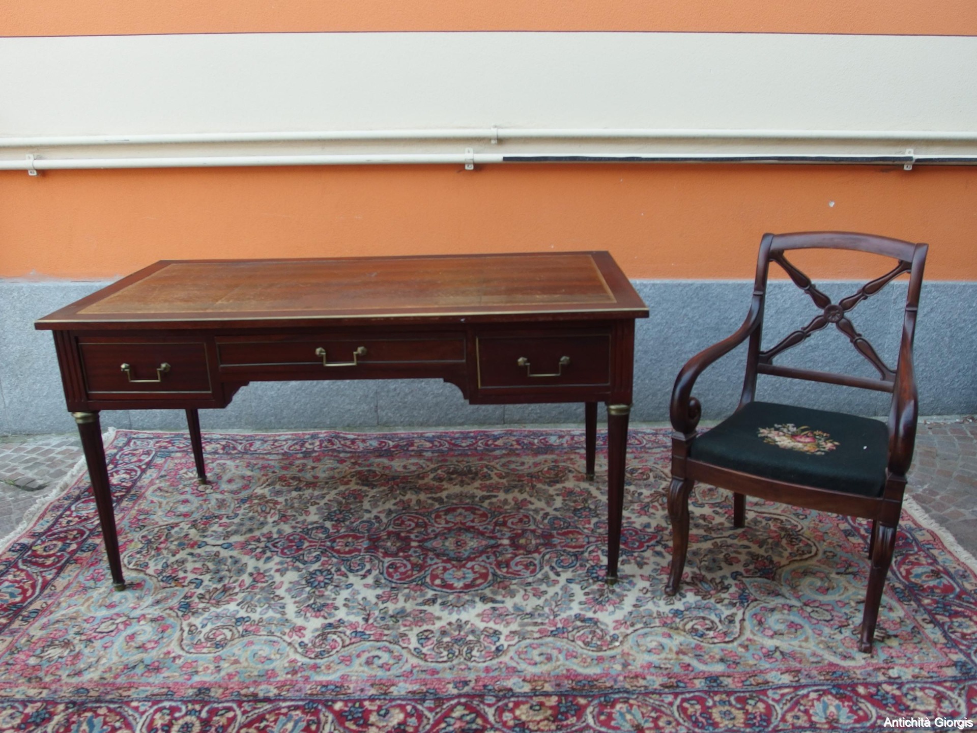 Bellissima scrivania da centro i mogano stile Napoleone III con ottoni epoca seconda metà 800 di origina francese, poltrona singola da scrivania stile Impero in mogano fine 800 francese.