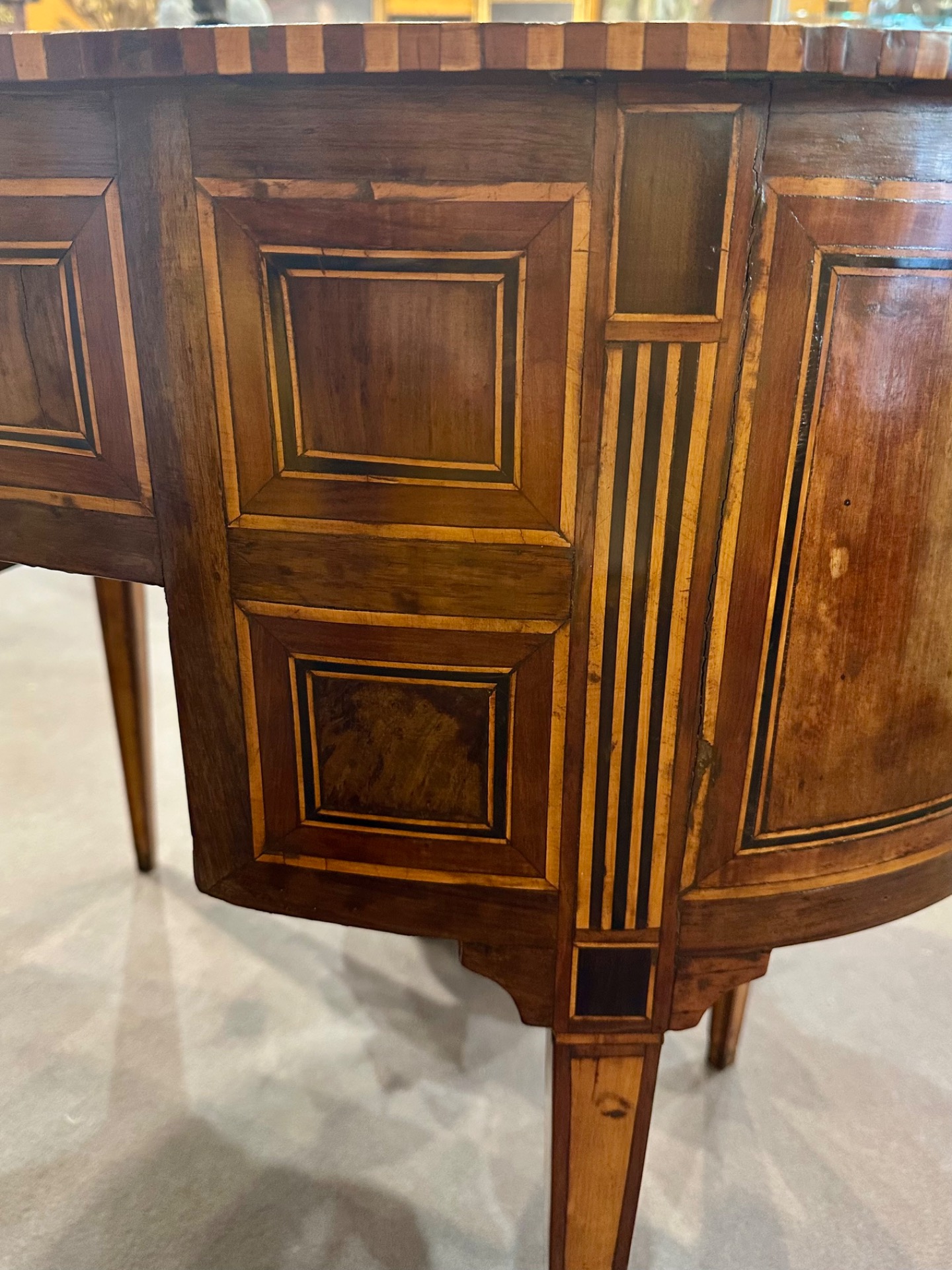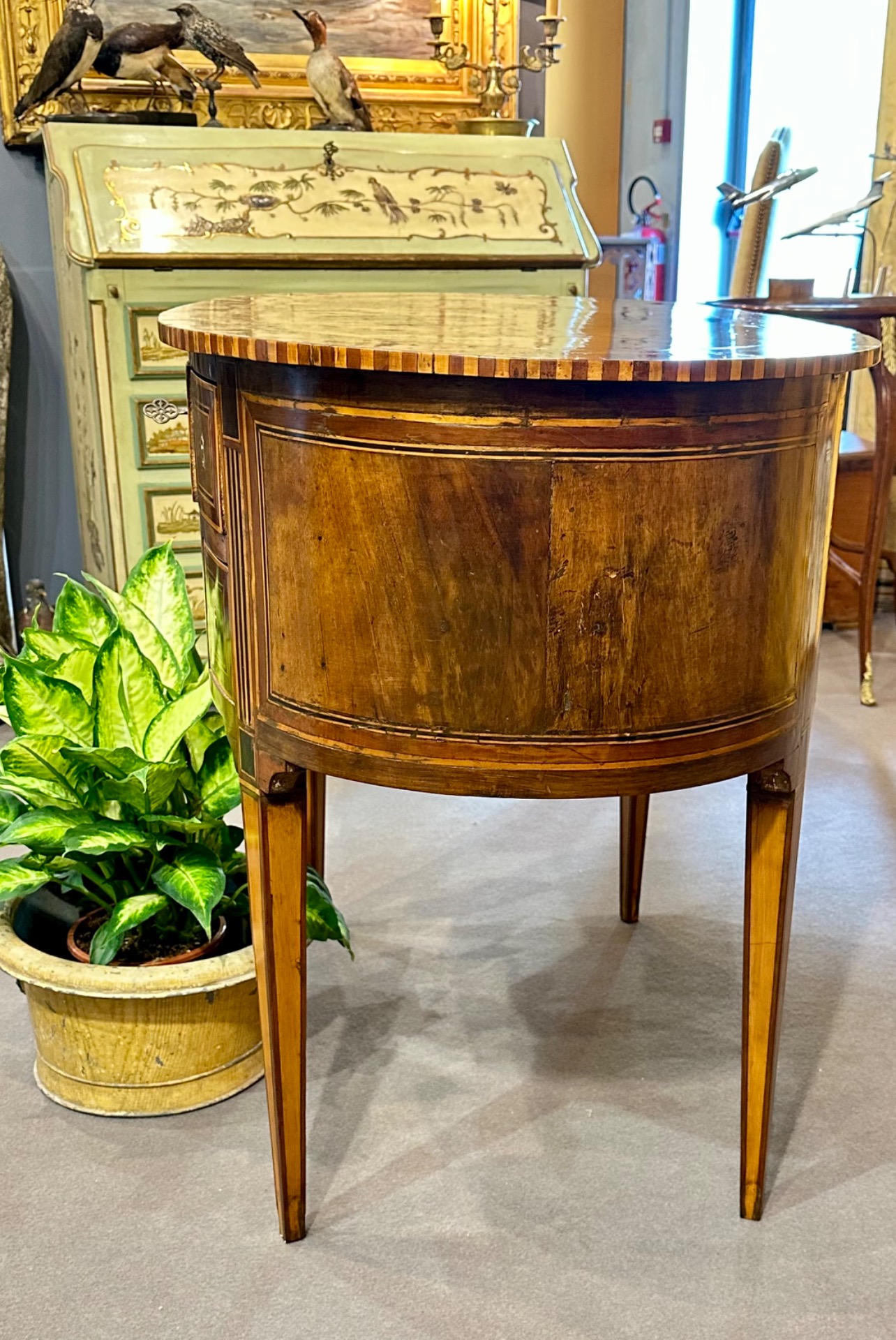 Raffinato ed elegante mobile ovale Luigi XVI, realizzato in legno lastronato di noce con filettature in bois de rose, acero e palissandro. Il piano presenta un’elegante bordura a intarsio geometrico che ne segue perfettamente la linea ovale.