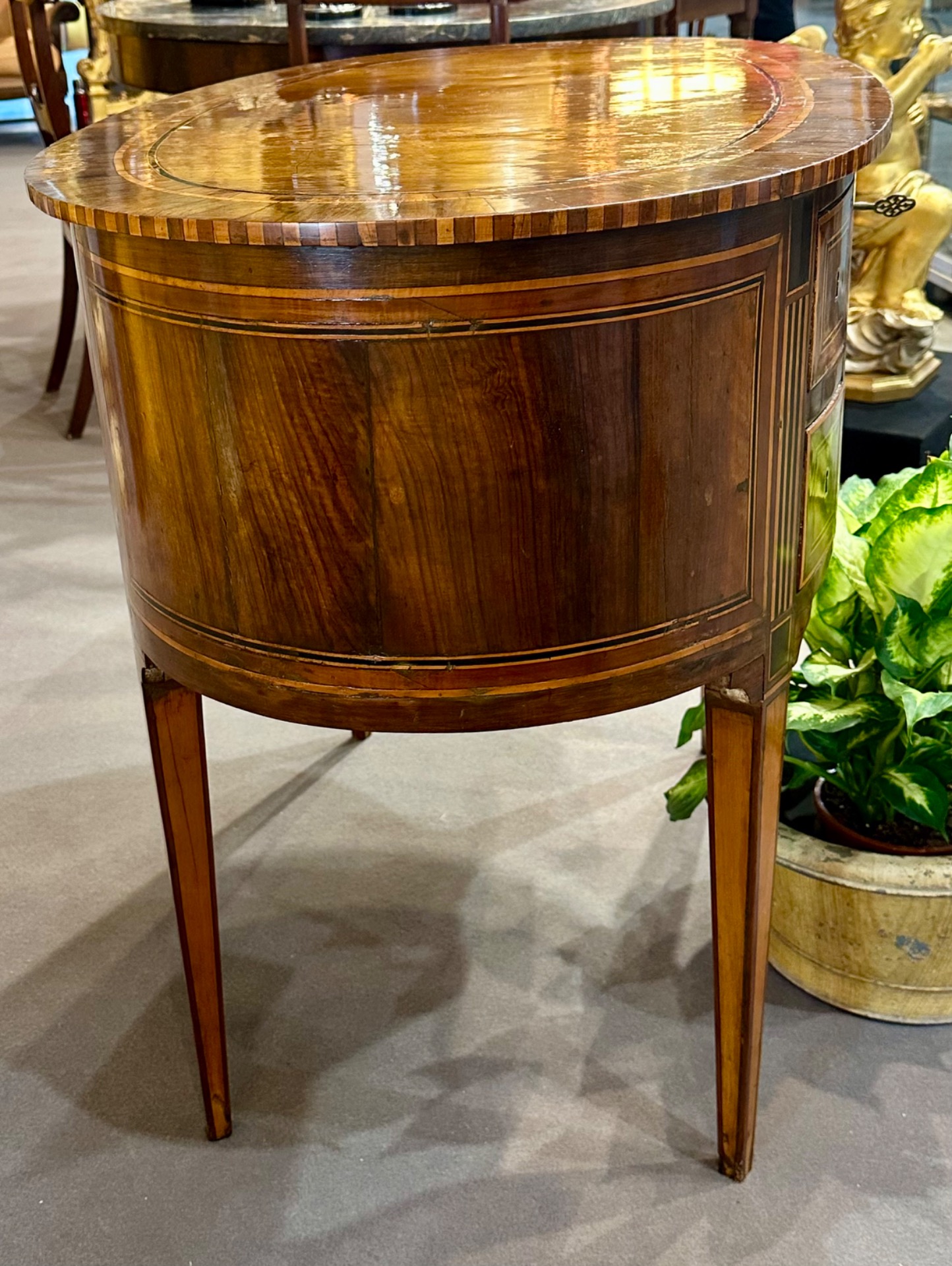 Scrittoio ovale lastronato in noce e bois de rose - Italia, epoca Luigi XVI. Raffinato ed elegante mobile ovale Luigi XVI, realizzato in legno lastronato di noce con filettature in bois de rose, acero e palissandro. Il piano presenta un’elegante bordura a intarsio geometrico che ne segue perfettamente la linea ovale. Il fronte, mosso e armonioso, è articolato in un cassetto centrale affiancato da due coppie di cassetti più piccoli, incorniciati da raffinati motivi a riserva e filettature contrastanti. Le gambe, alte e a sezione troncopiramidale decorate da filettature verticali, conferiscono leggerezza alla struttura pur mantenendo un notevole equilibrio formale. L’interno dei cassetti è in legno di pioppo, con serrature originali dell’epoca. La lucidatura a tampone mette in risalto la calda tonalità delle essenze e la patina antica del tempo. Epoca: fine XVIII secolo, Luigi XVI Provenienza: Italia Materiali: Noce, bois de rose, acero, palissandro Dimensioni: cm. 101,8 x 63,2 - altezza cm. 79 - altezza sotto cassetto centrale cm. 62,5. Condizione: Ottimo stato conservativo, con lievi segni d’uso coerenti con l’età. Mobile di grande eleganza e proporzione, ideale come scrittoio da salotto, console d’ingresso o raffinato complemento d’arredo per ambienti classici e contemporanei. Oggetto corredato da certificato d'autenticità. Questo articolo, come tutti i nostri oggetti, viene venduto accompagnato da certificato fotografico di autenticità e lecita provenienza. Tale documento identifica l'oggetto aggiungendo più valore all'articolo. Ci occupiamo del trasporto e organizziamo personalmente l'imballaggio e la spedizione delle opere d'arte in tutto il mondo. ???? Antichità DELMONTE ???? https://www.instagram.com/delmonteantichita/ CONTATTI: PER QUALSIASI INFORMAZIONE AGGIUNTIVA NON ESITATE A CONTATTARMI! Cell. Anna 338 4989679 EMAIL: annadelmonteantico@libero.it
