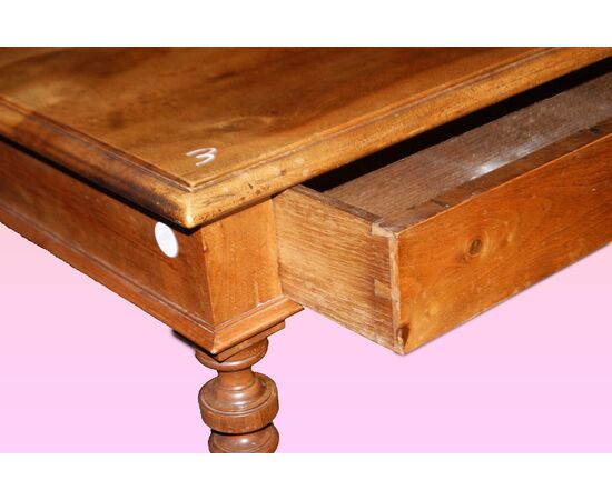 Tavolo scrittoio francese della seconda metà 1800 in legno di noce. Dalle dimensioni contenute presenta cassettino sotto piano con lavoro di intaglio; gambe riunite da crociera.