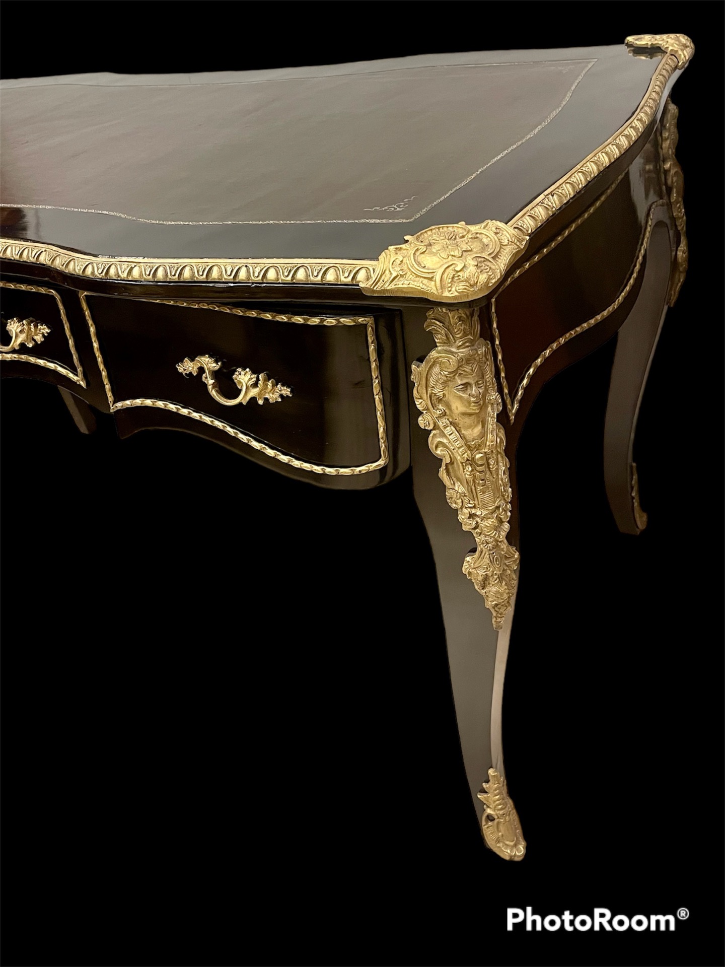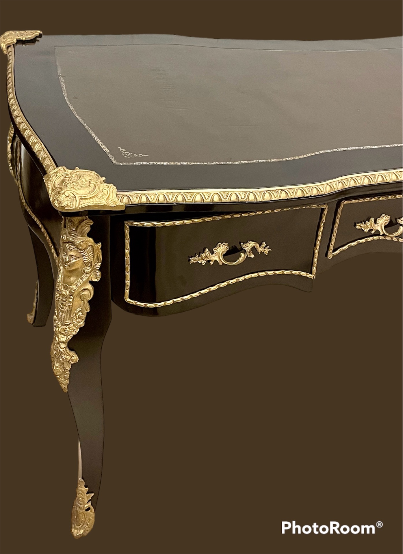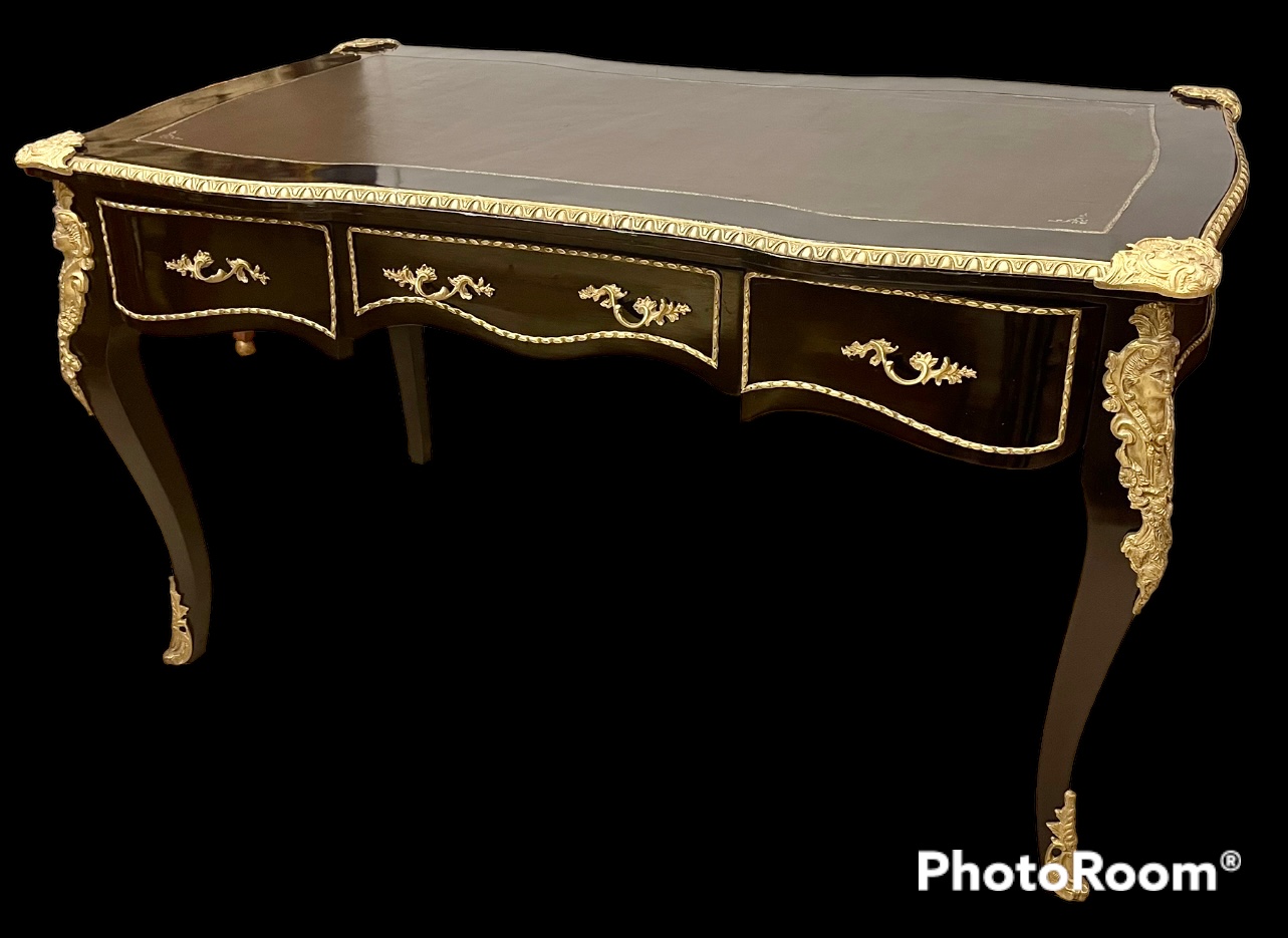 Scrittoio di stile XV ebanizzato con piano in pelle e bronzi misure 148x62