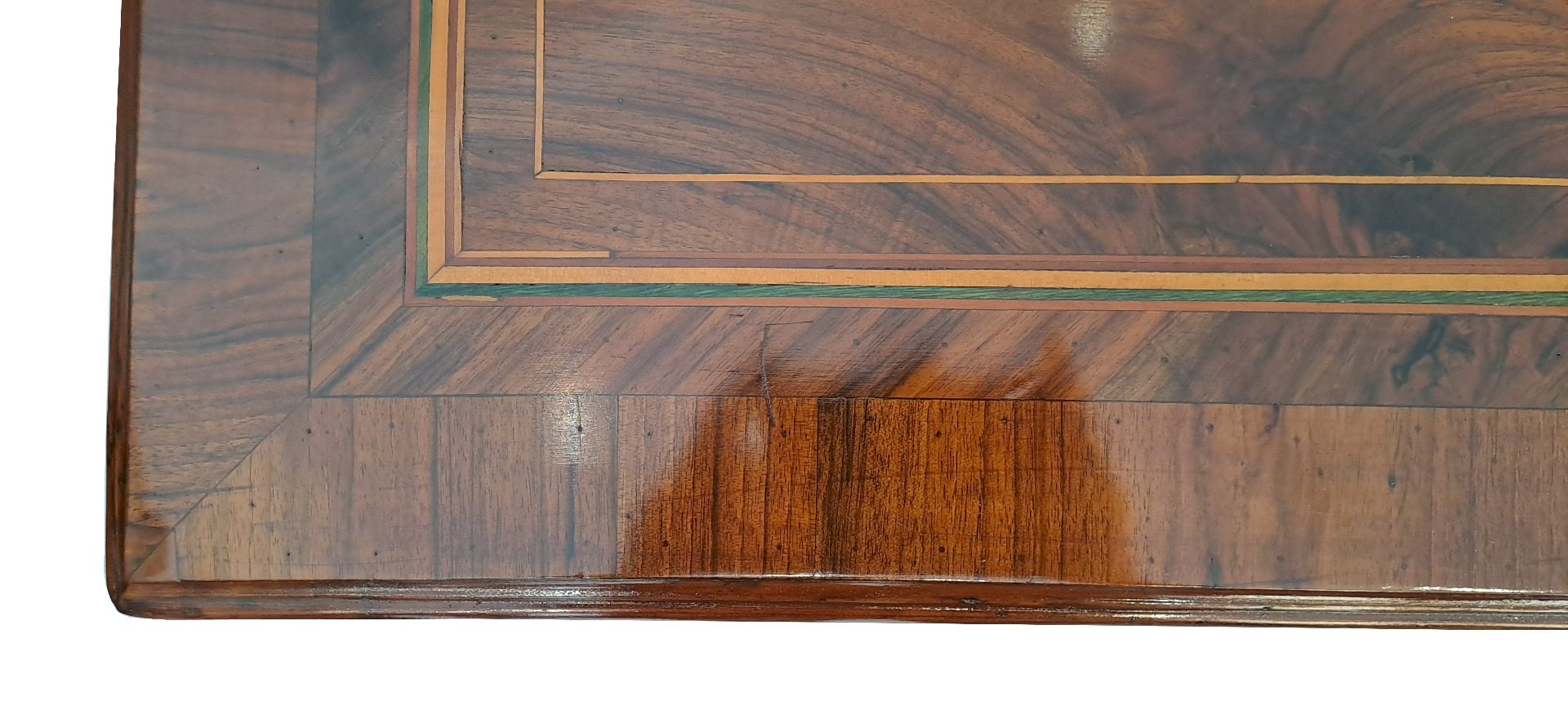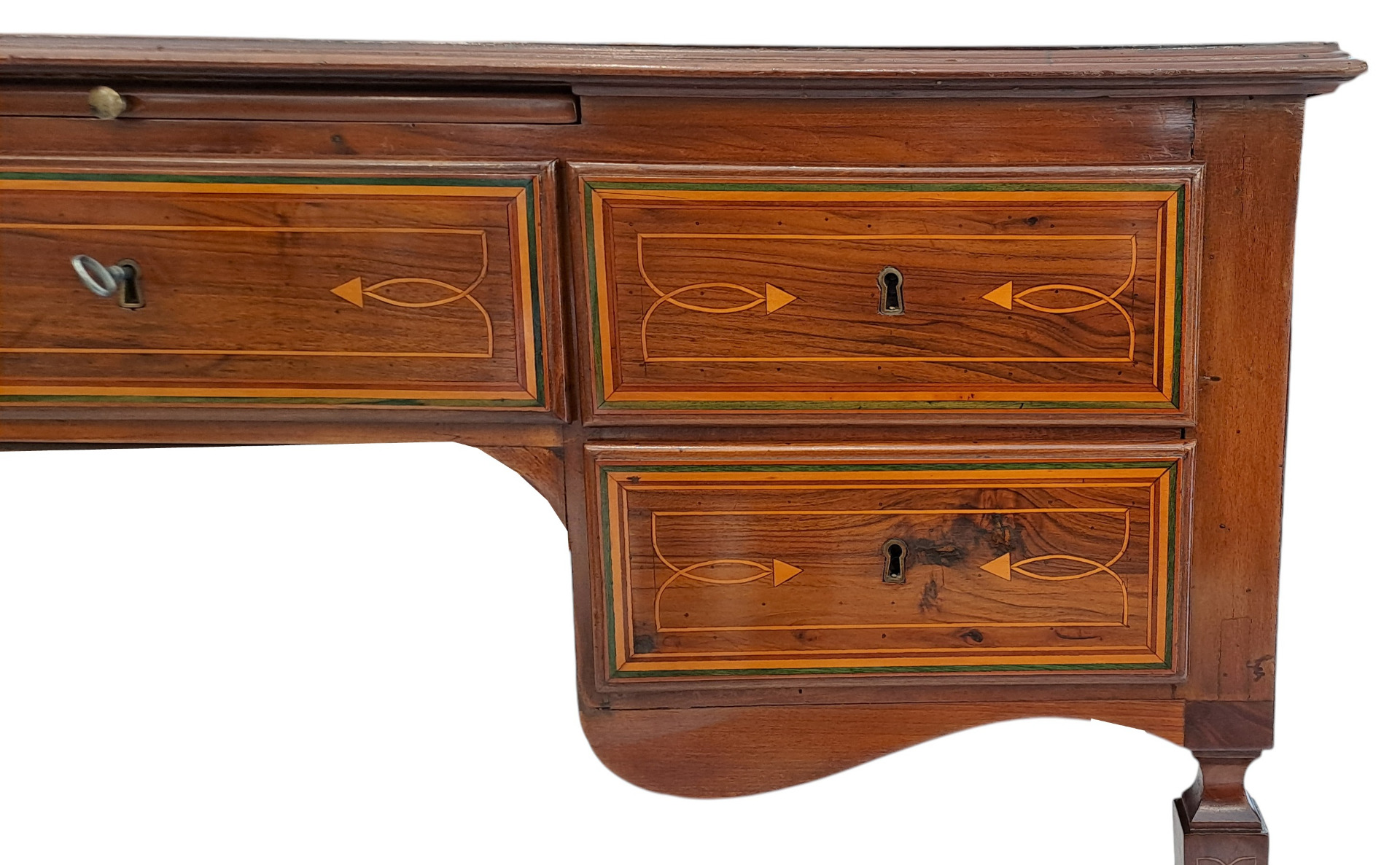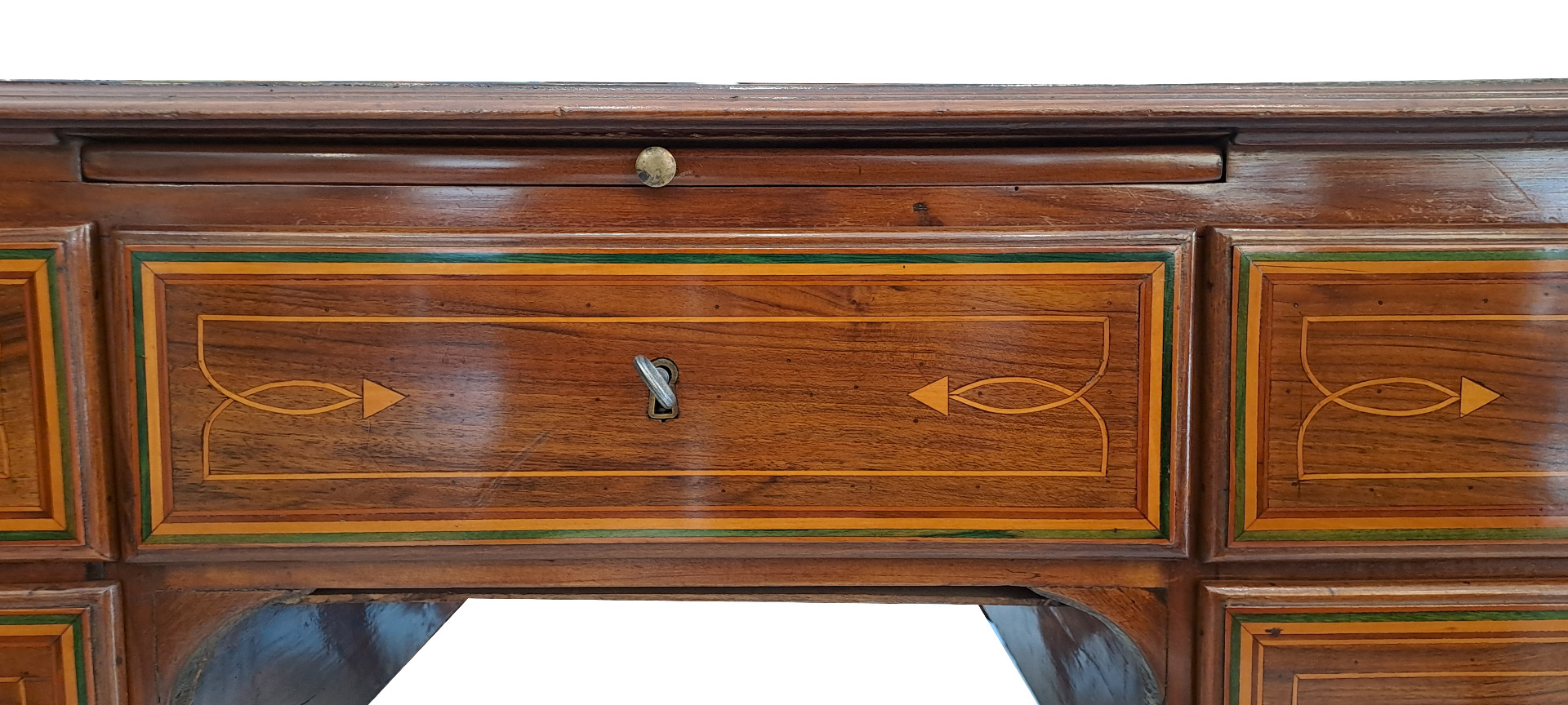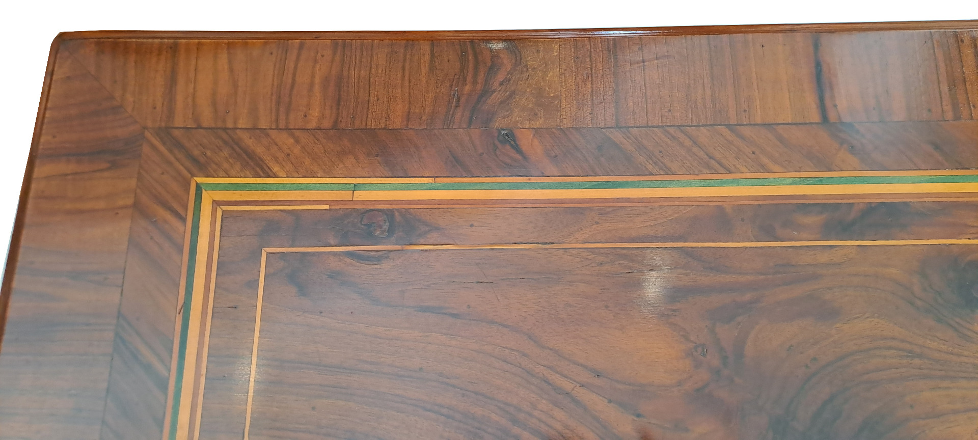 Decorazioni e Intarsi: La caratteristica più distintiva di questo scrittoio sono gli intarsi geometrici che adornano sia il piano che il fronte dei cassetti, e in particolare i fianchi del mobile. Questi intarsi creano un contrasto cromatico con il legno di noce più scuro, aggiungendo un tocco di eleganza e artigianalità.