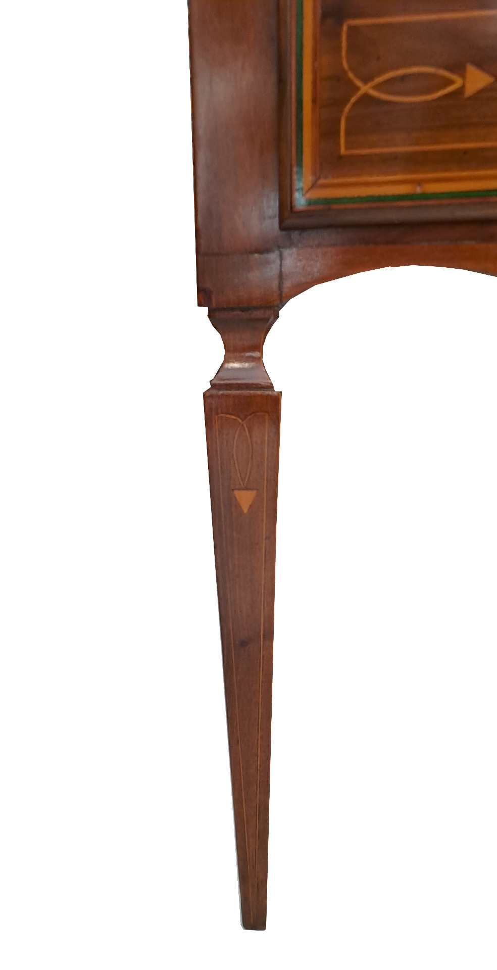 Stile: Lo stile complessivo suggerisce un'influenza del periodo Luigi XVI , ma con l'aggiunta di elementi decorativi tipici della fine dell'Ottocento, che spesso reinterpretava stili precedenti con un'enfasi sulla ricchezza dei materiali e degli intarsi.
