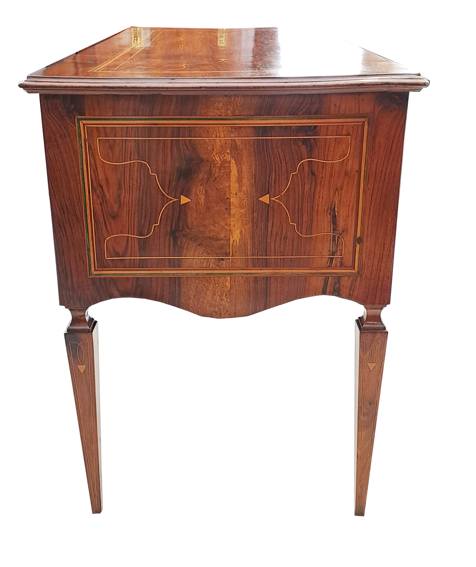 Struttura e Forma: Ha una forma rettangolare allungata, tipica degli scrittoi. La parte superiore presenta il piano a becco di civetta anch'esso intarsiato.