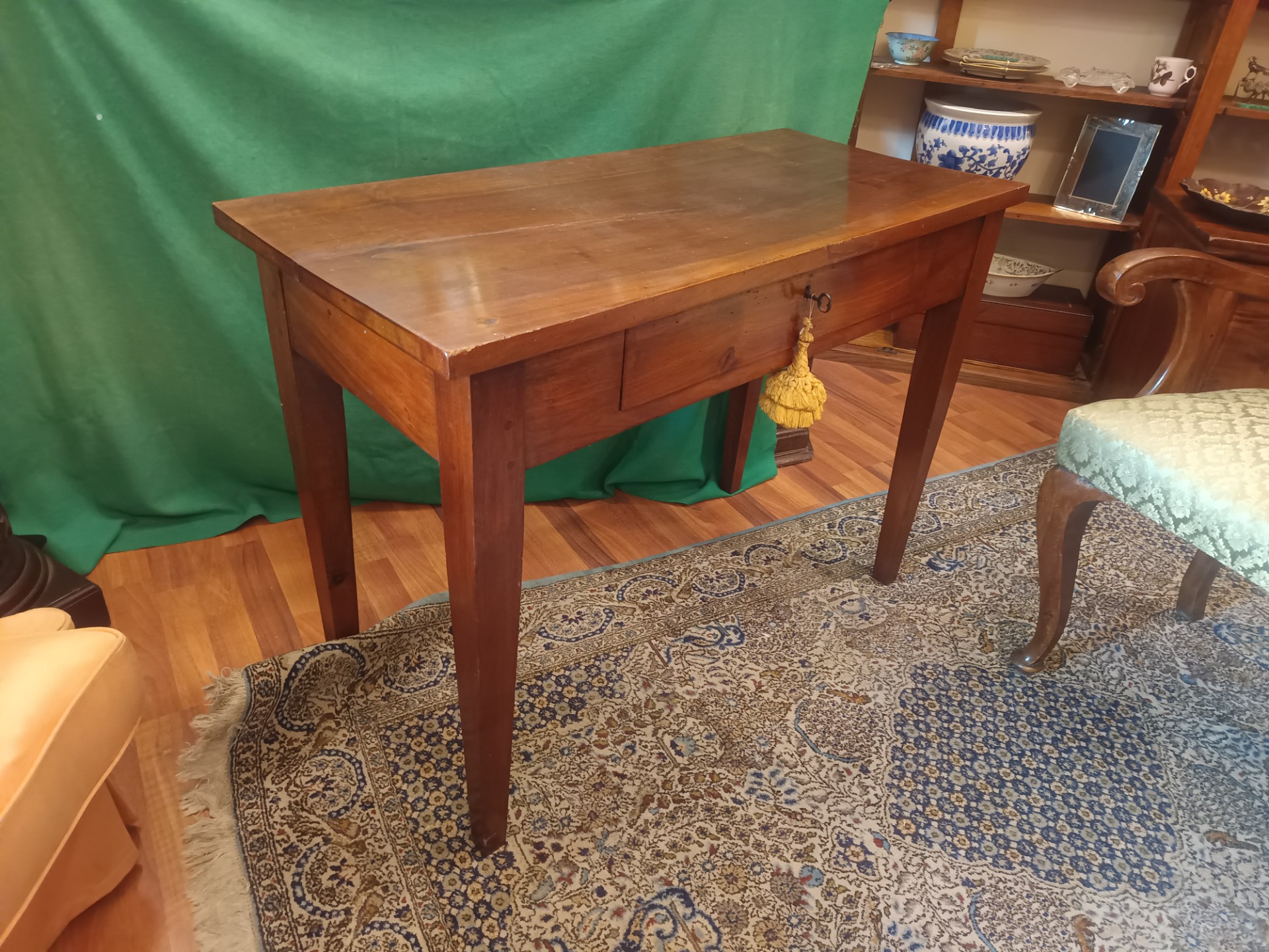 Scrittoio da centro in lastrone di noce con tre cassetti. Misure: cm 110 x 57 x 80 Il tavolo viene consegnato restaurato e rilucidato.
