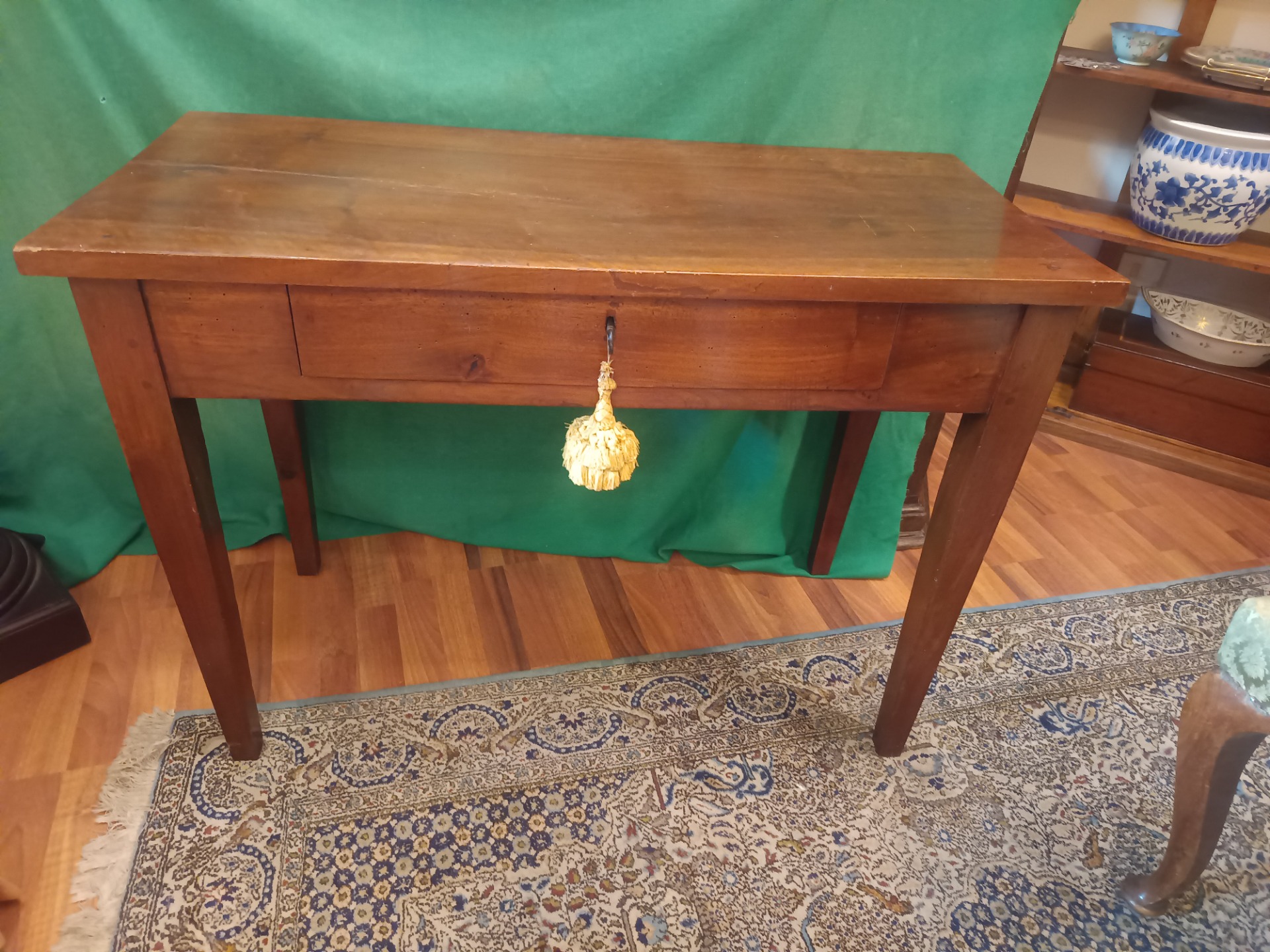 Scrittoio da centro in lastrone di noce con tre cassetti. Misure: cm 110 x 57 x 80 Il tavolo viene consegnato restaurato e rilucidato.
