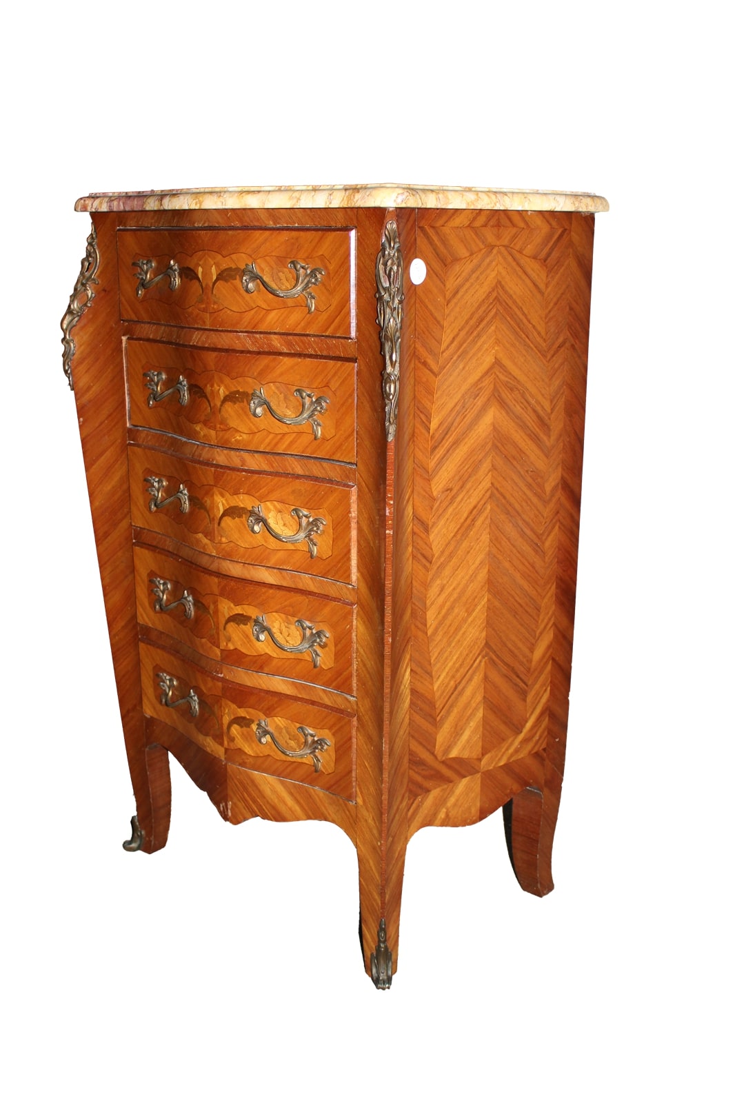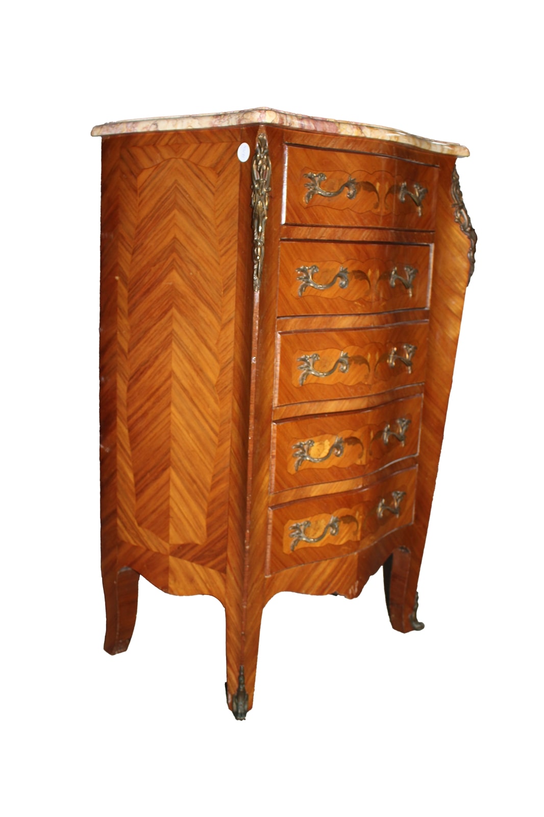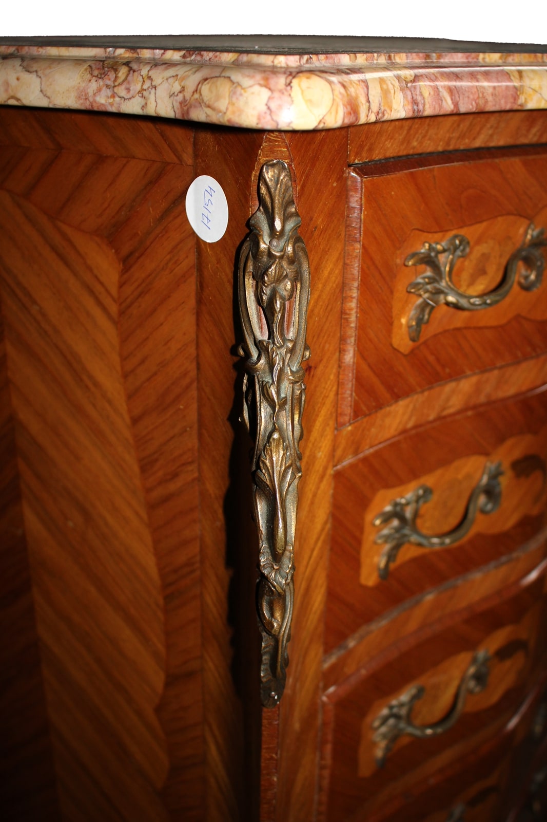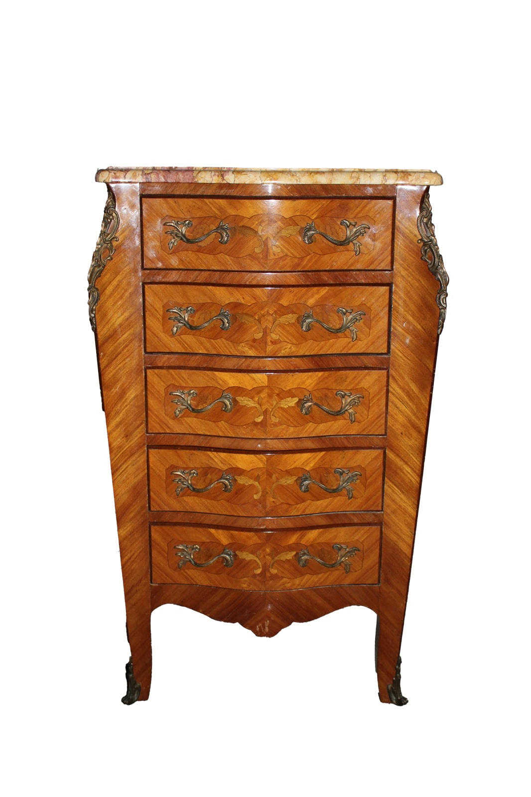 Elegante cinquino francese degli inizi del XX secolo, realizzato in pregiato bois de rose, impreziosito da raffinati intarsi floreali. Il mobile, dalle linee mosse e sinuose tipiche dello stile Luigi XV, presenta cinque cassetti con maniglie in bronzo cesellato e dorato a motivi rocaille. Gli angoli e i piedi sono arricchiti da applicazioni in bronzo finemente lavorato che ne sottolineano l’armonia e la ricercatezza delle forme.
