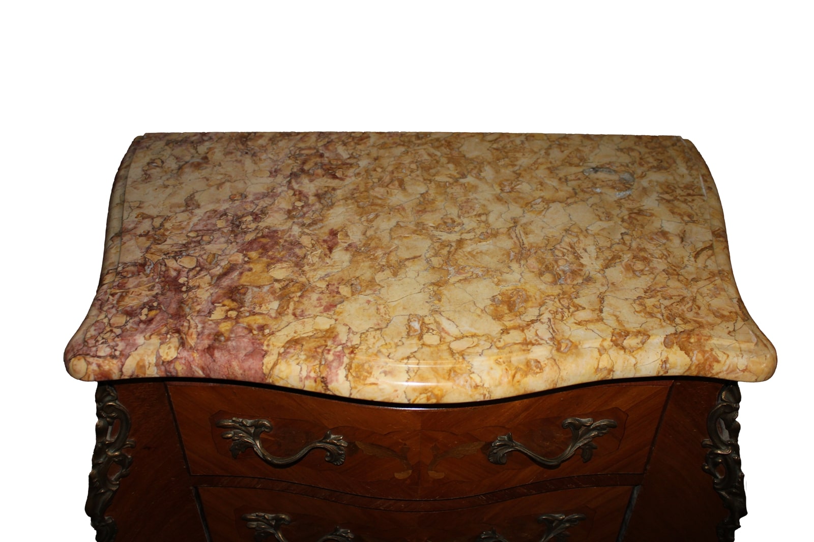Elegante cinquino francese degli inizi del XX secolo, realizzato in pregiato bois de rose, impreziosito da raffinati intarsi floreali. Il mobile, dalle linee mosse e sinuose tipiche dello stile Luigi XV, presenta cinque cassetti con maniglie in bronzo cesellato e dorato a motivi rocaille. Gli angoli e i piedi sono arricchiti da applicazioni in bronzo finemente lavorato che ne sottolineano l’armonia e la ricercatezza delle forme.