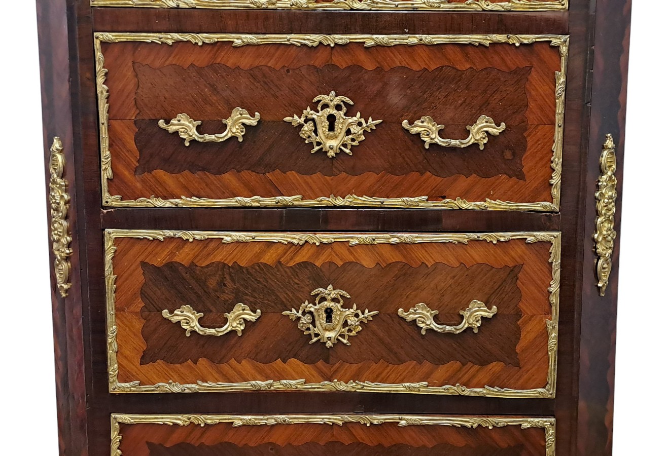 Raffinato secretaire interamente impiallacciato in bois de rose e palissandro.Il fronte presenta quattro cassetti e due, uniti, a formare la calatoia.