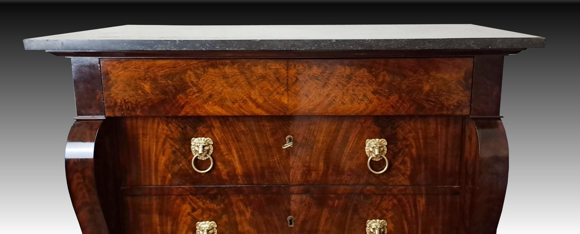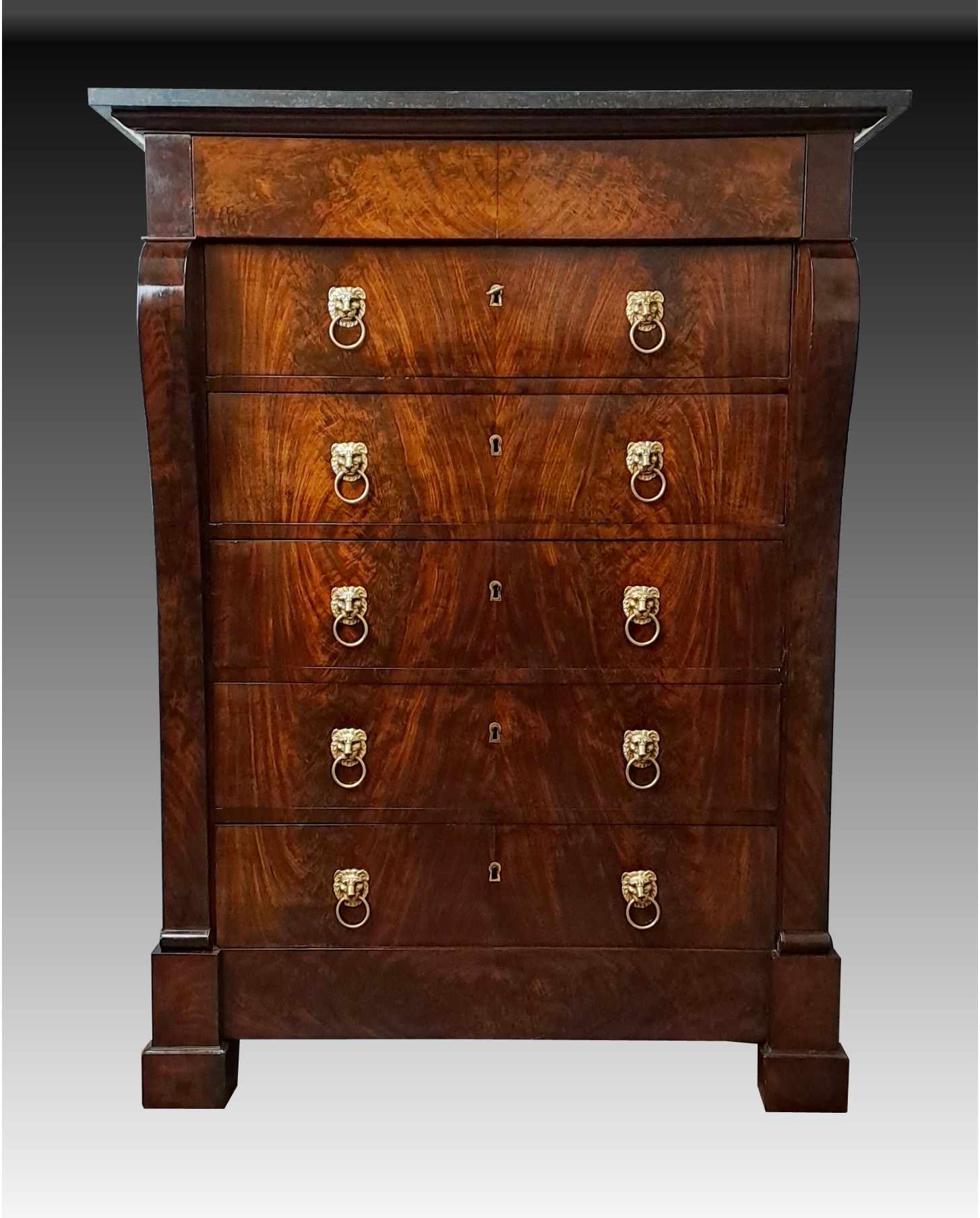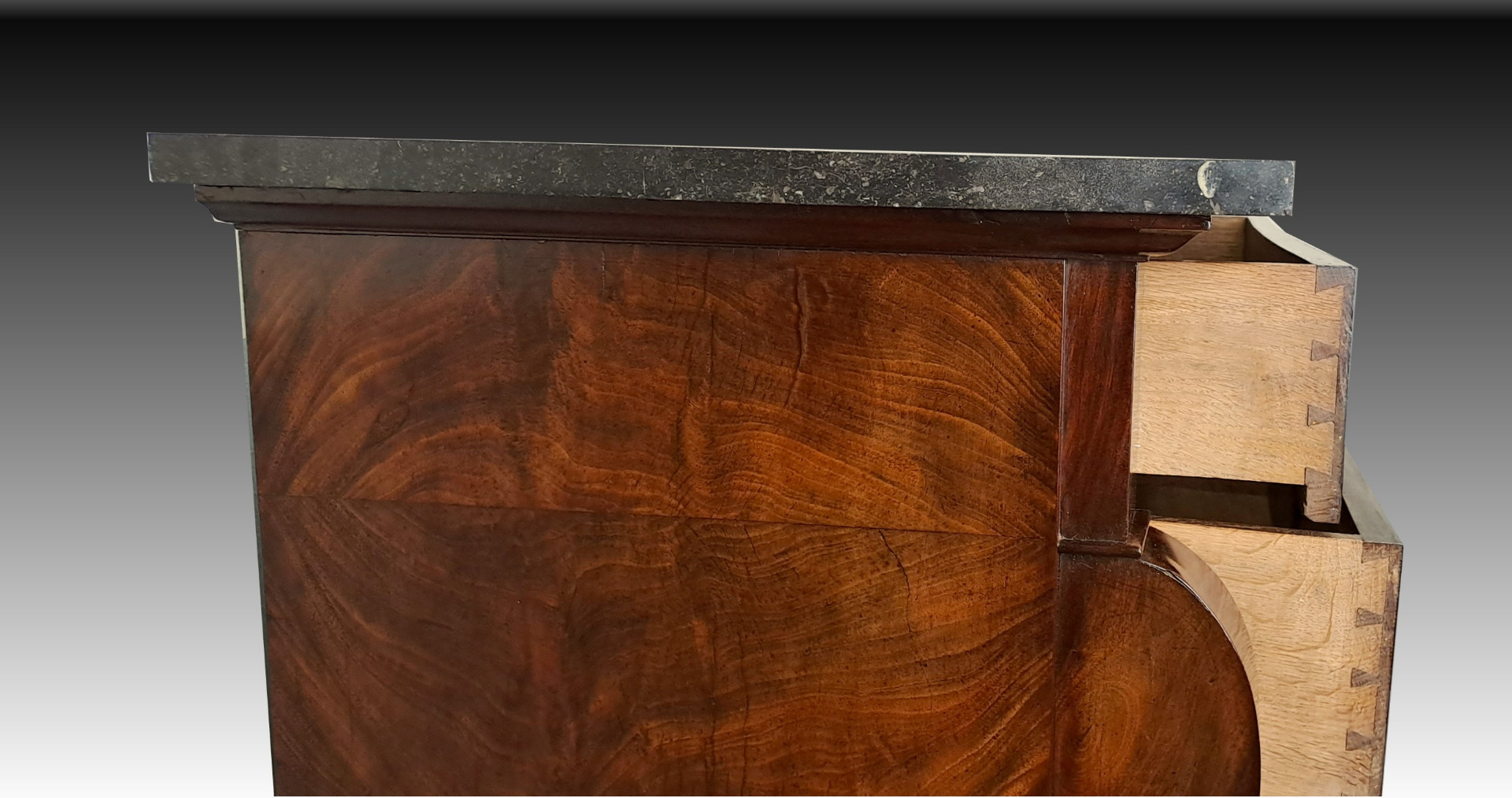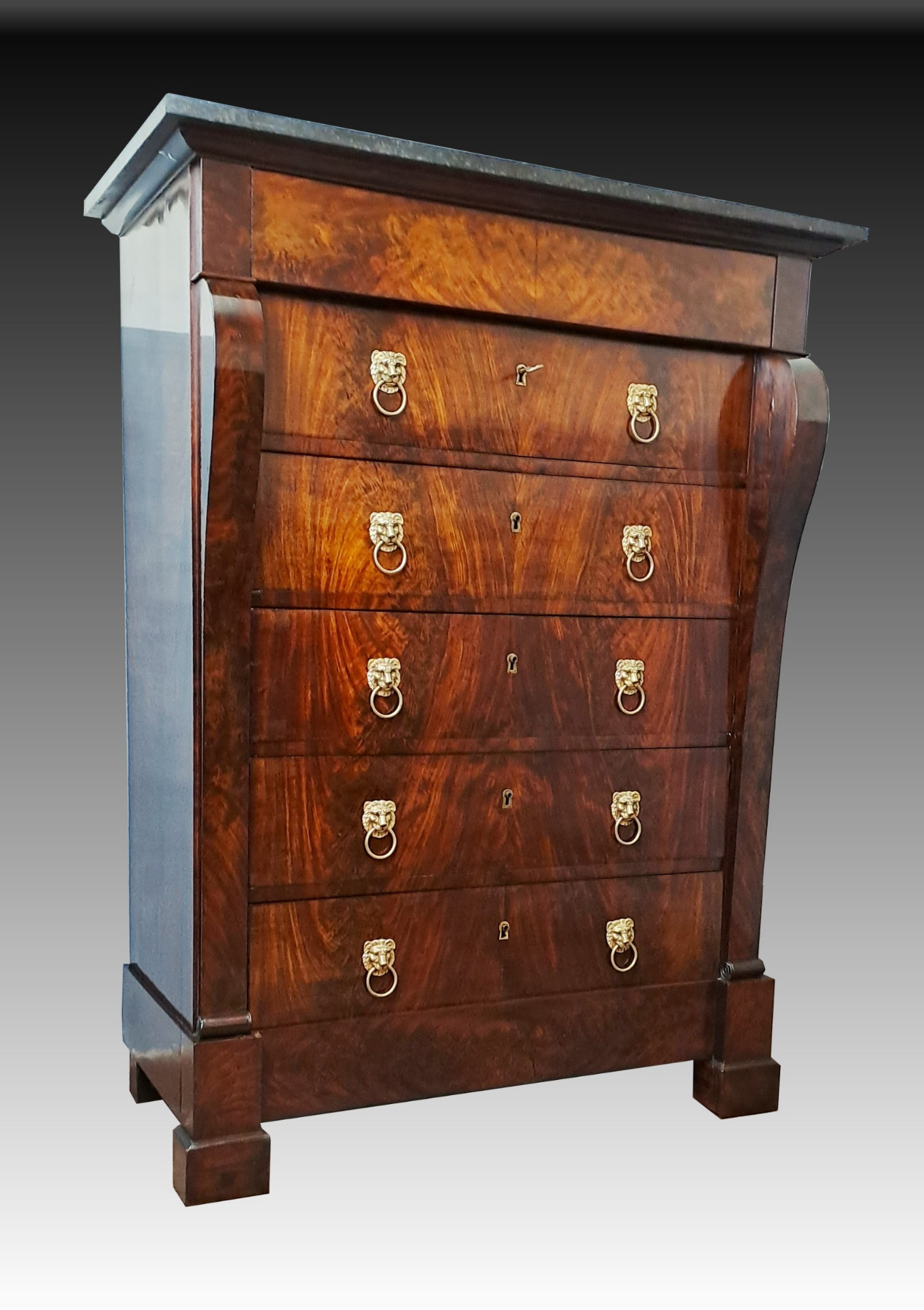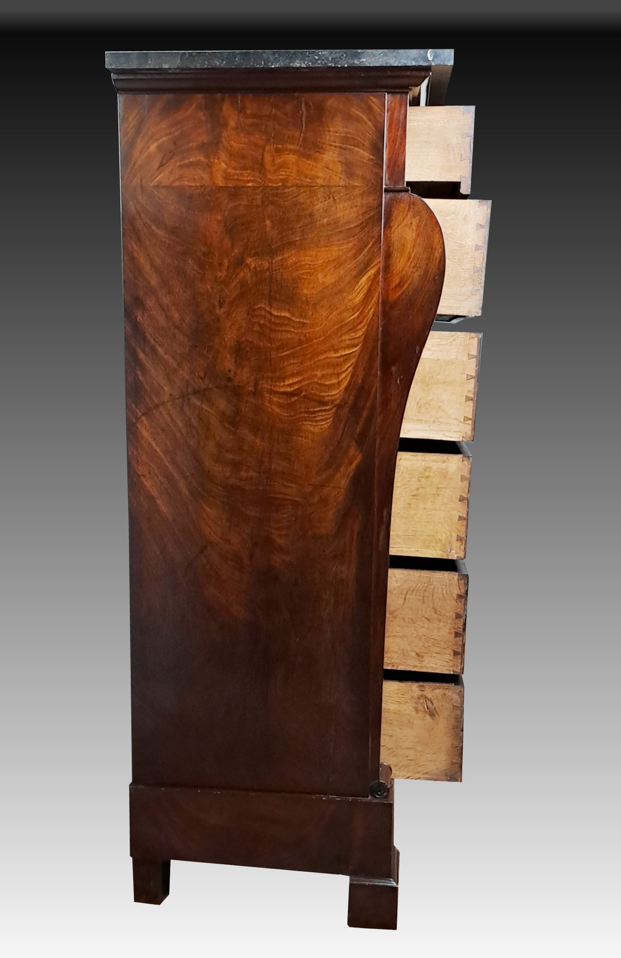 Settimanale impiallacciato in piuma di mogano.Il fronte si compone di cinque cassetti di ugual misura sovrastati da uno più piccolo ed aggetante, sotto al piano in marmo nero del Belgio.