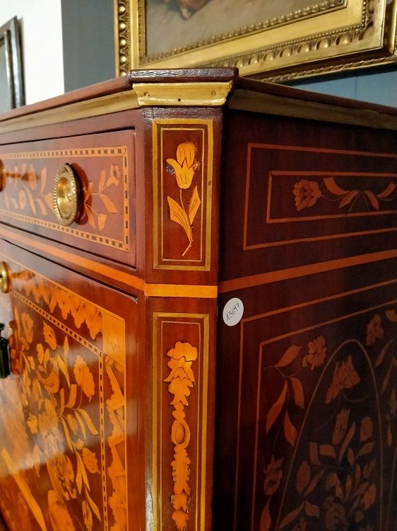Secretaire olandese della fine 1700   riccamente intarsiato , a  motivo floreale , da  vari legni policromi  su  fondo mogano . Presenta una bordatura sottopiano, maniglie e bocchette in metallo color oro. All'interno della ribalta presenti due vani a giorni, cassetti e segret anch'essi...