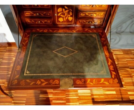 Secretaire olandese della fine 1700 riccamente intarsiato, a motivo floreale, da vari legni policromi su fondo mogano. Presenta una bordatura sottopiano, maniglie e bocchette in metallo color oro. All'interno della ribalta presenti due vani a giorni, cassetti e segret anch'essi intarsiati e piano in pelle verde con borso intarsiato.