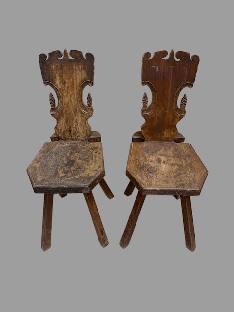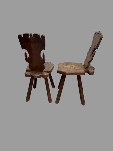 Coppia di sedie in noce finemente intagliate. Italia, XIX secolo. Misure: 49 x 39 H 93 cm.