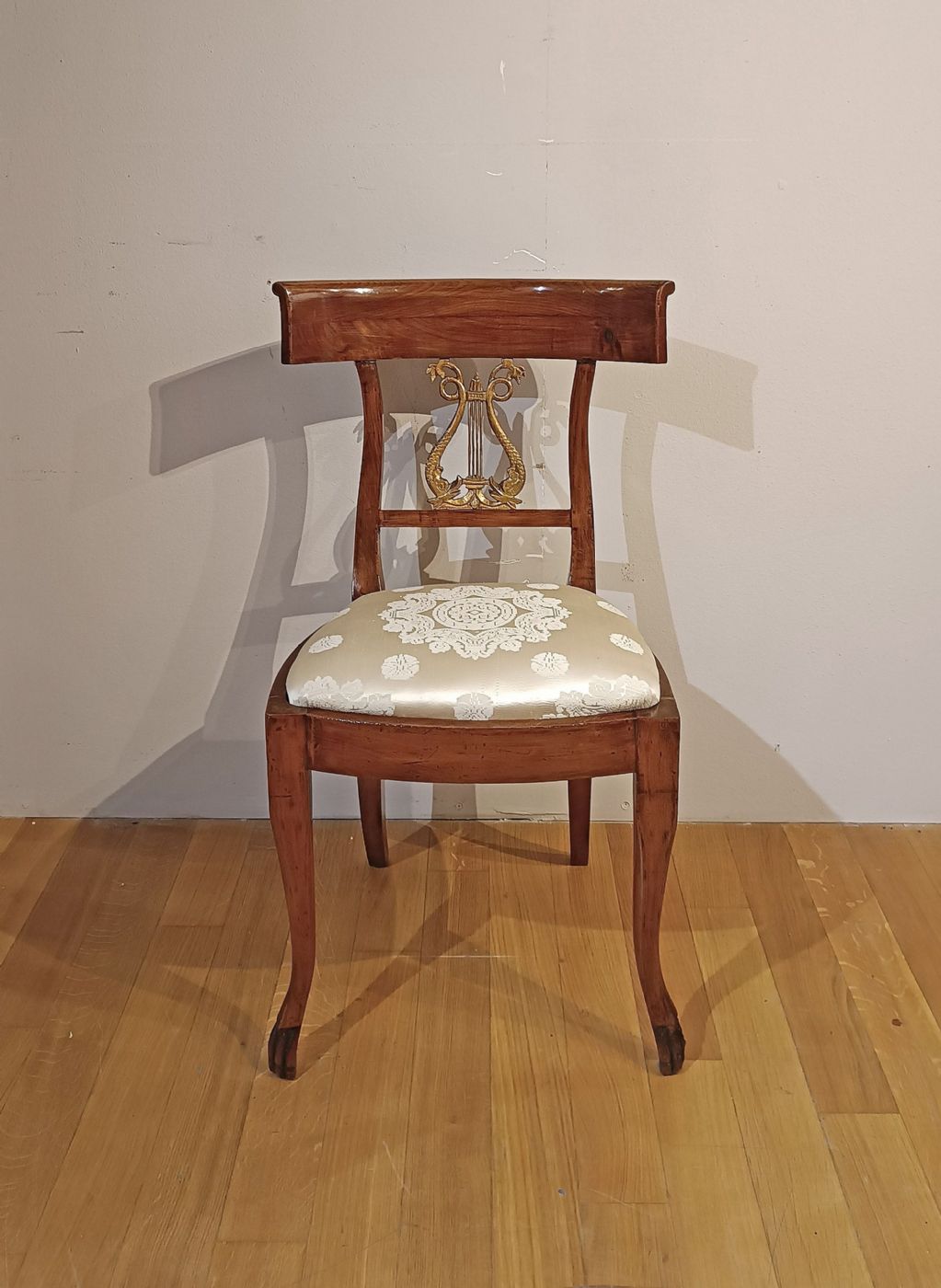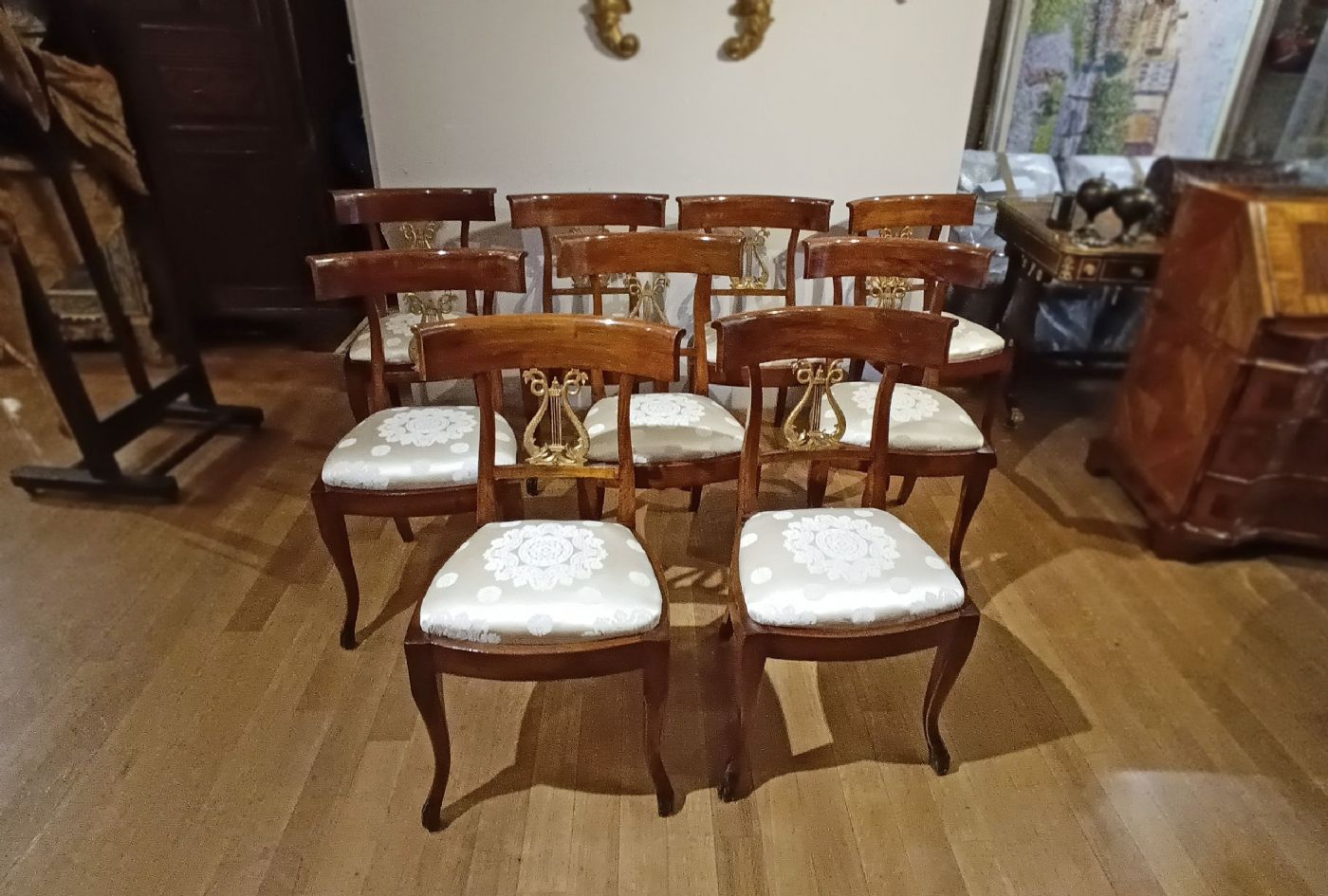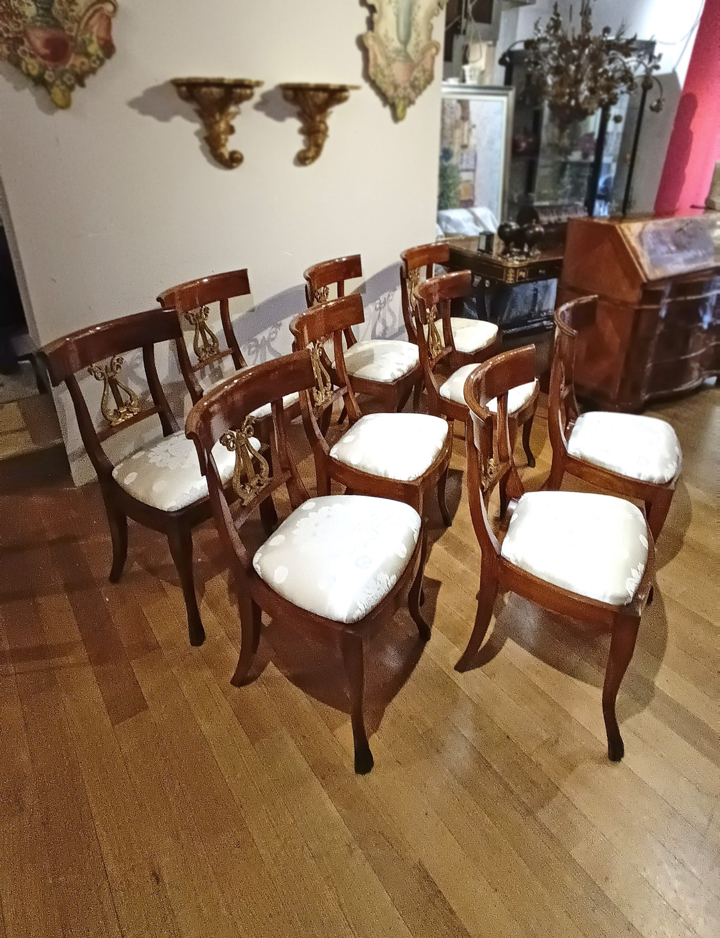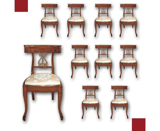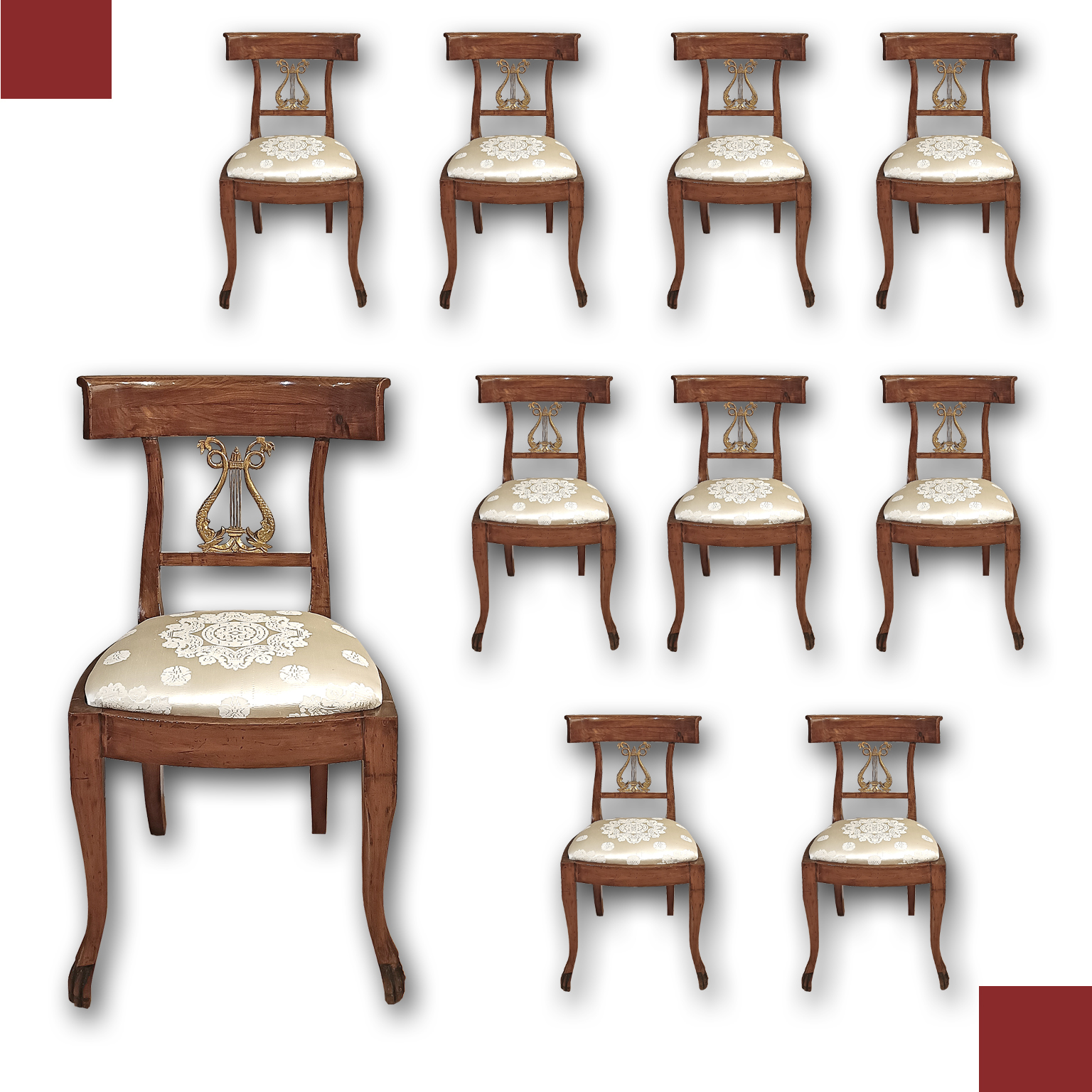Raffinate dieci sedie in legno di ciliegio massello, finemente intagliate. Le sedie presentano gambe leggermente ricurve sul fronte, con terminazioni ferine, e una cartella a forma di lira realizzata in legno di cirmolo, intagliata e dorata a foglia d’oro zecchino, che ne esalta ulteriormente la raffinatezza. Sono dotate di una seduta confortevole, con cuscino rivestito in tessuto dorato-argentato con decori floreali. Si tratta di un set di sedie di grande gusto ed eleganza, in grado di aggiungere un tocco di classe all’arredo di qualsiasi ambiente. Manifattura lucchese (Toscana, Italia), del periodo Impero, intorno ai primi del XIX secolo.
