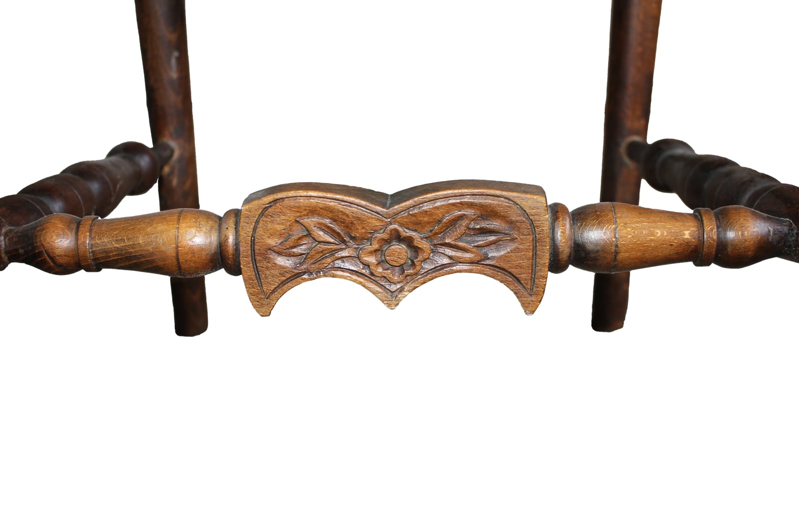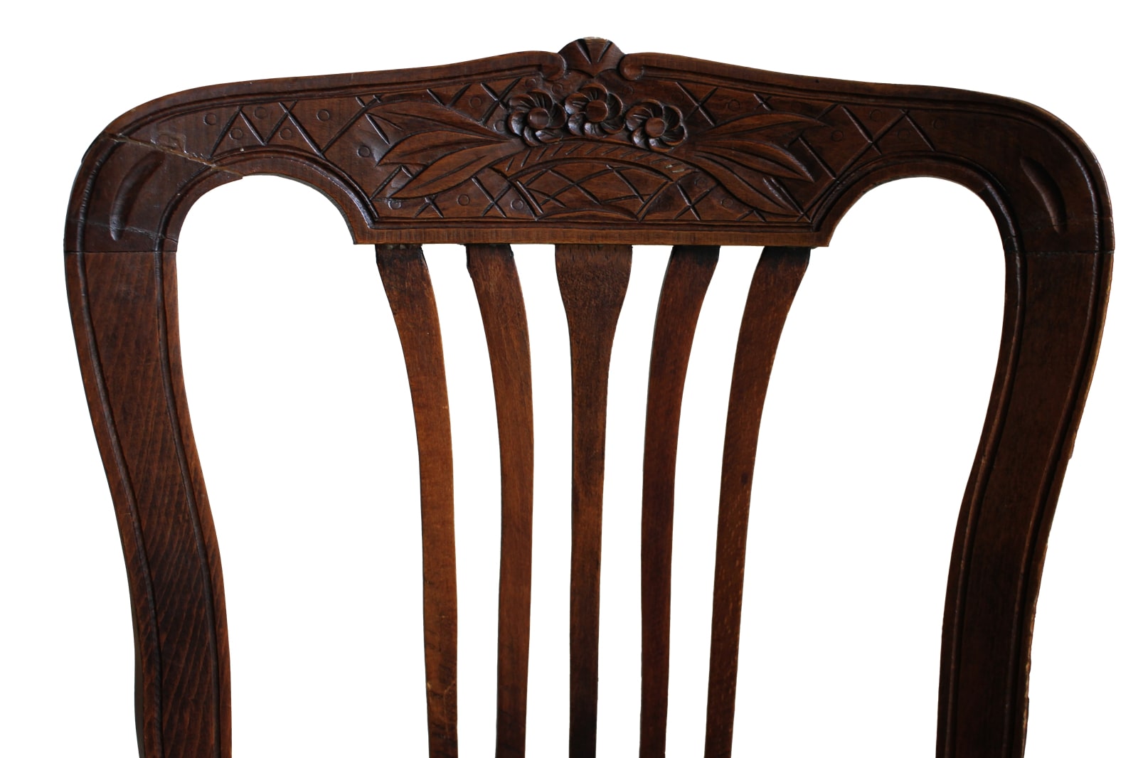 Gruppo di quattro sedie francesi di fine Ottocento in stile Provenzale, realizzate in pregiato legno di rovere, caratterizzate da eleganti motivi intagliati e da seduta in paglia di Vienna.
