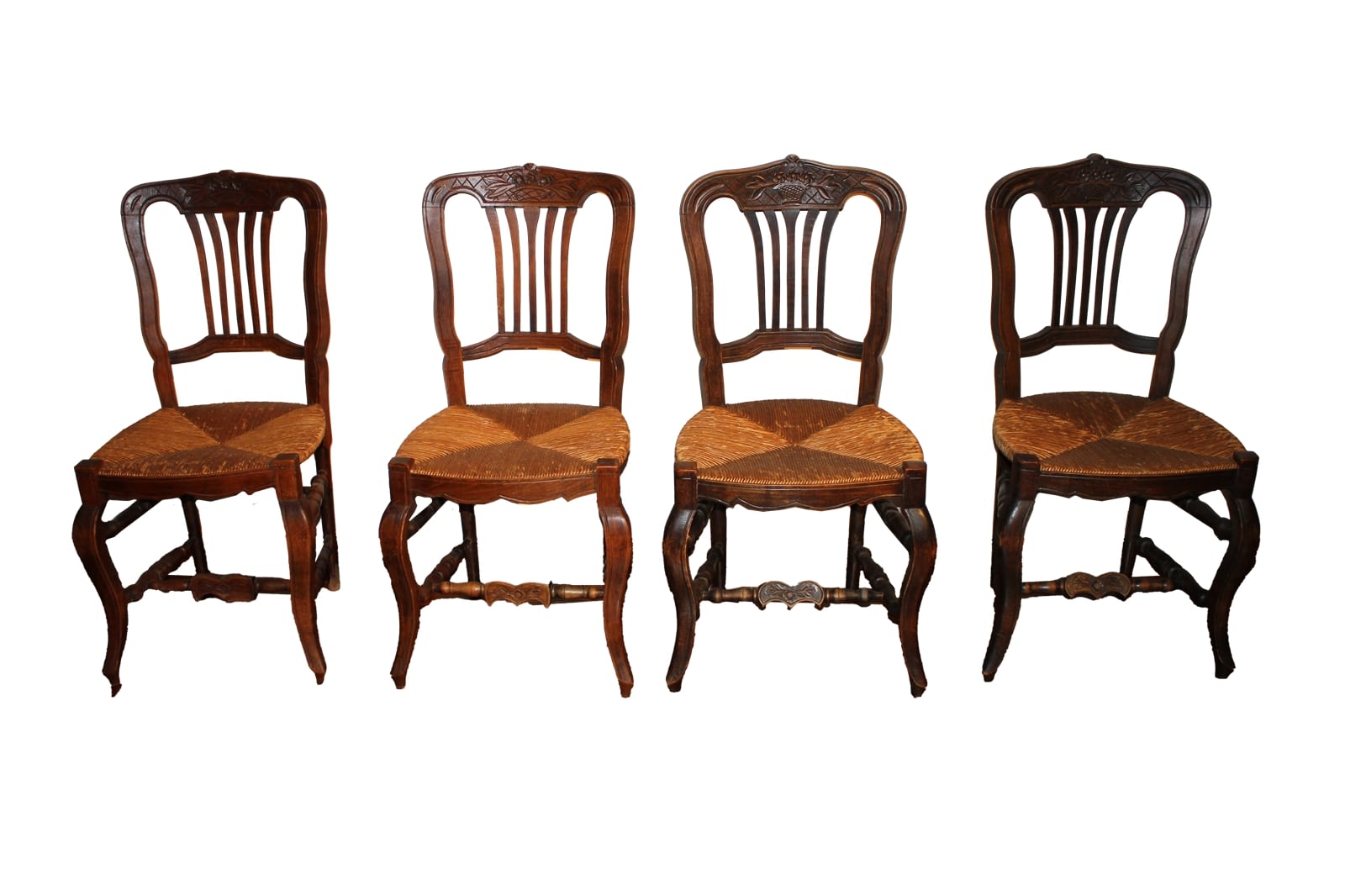 Gruppo di quattro sedie francesi di fine Ottocento in stile Provenzale, realizzate in pregiato legno di rovere, caratterizzate da eleganti motivi intagliati e da seduta in paglia di Vienna.
