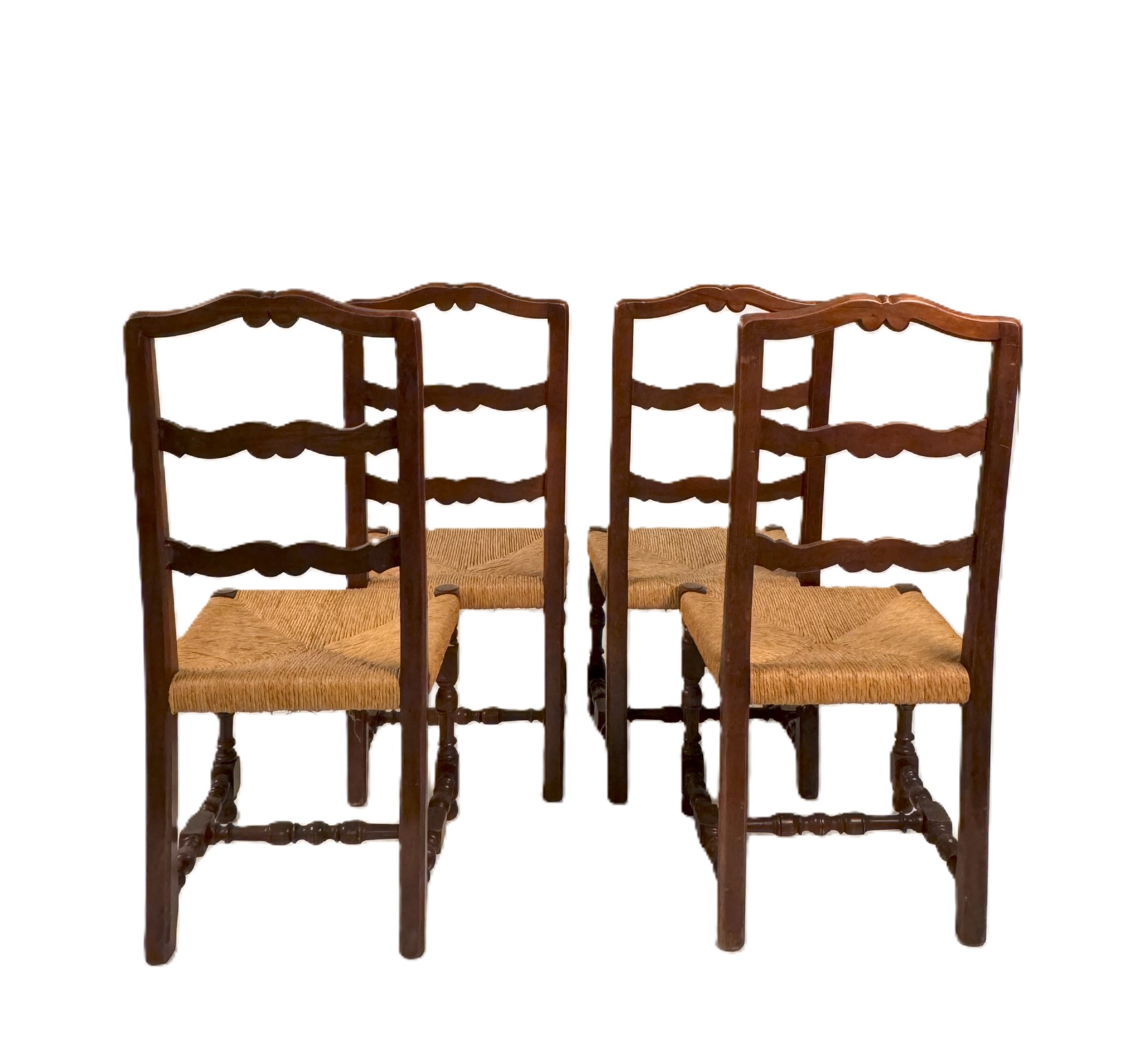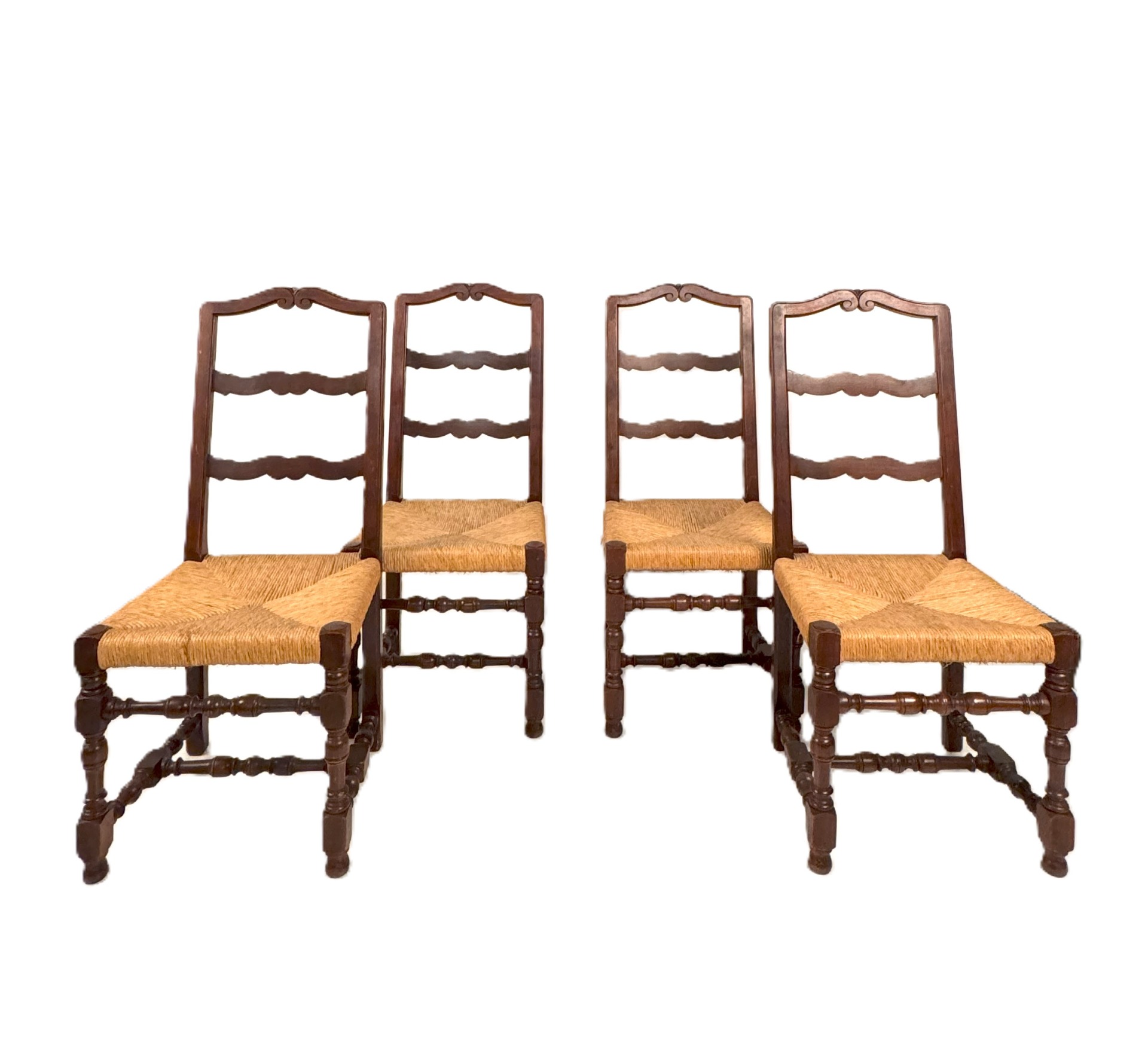 schienale a giorno con traverse sagomate, gambe anteriori e traverse a rocchetto, seduta in paglia intrecciata,