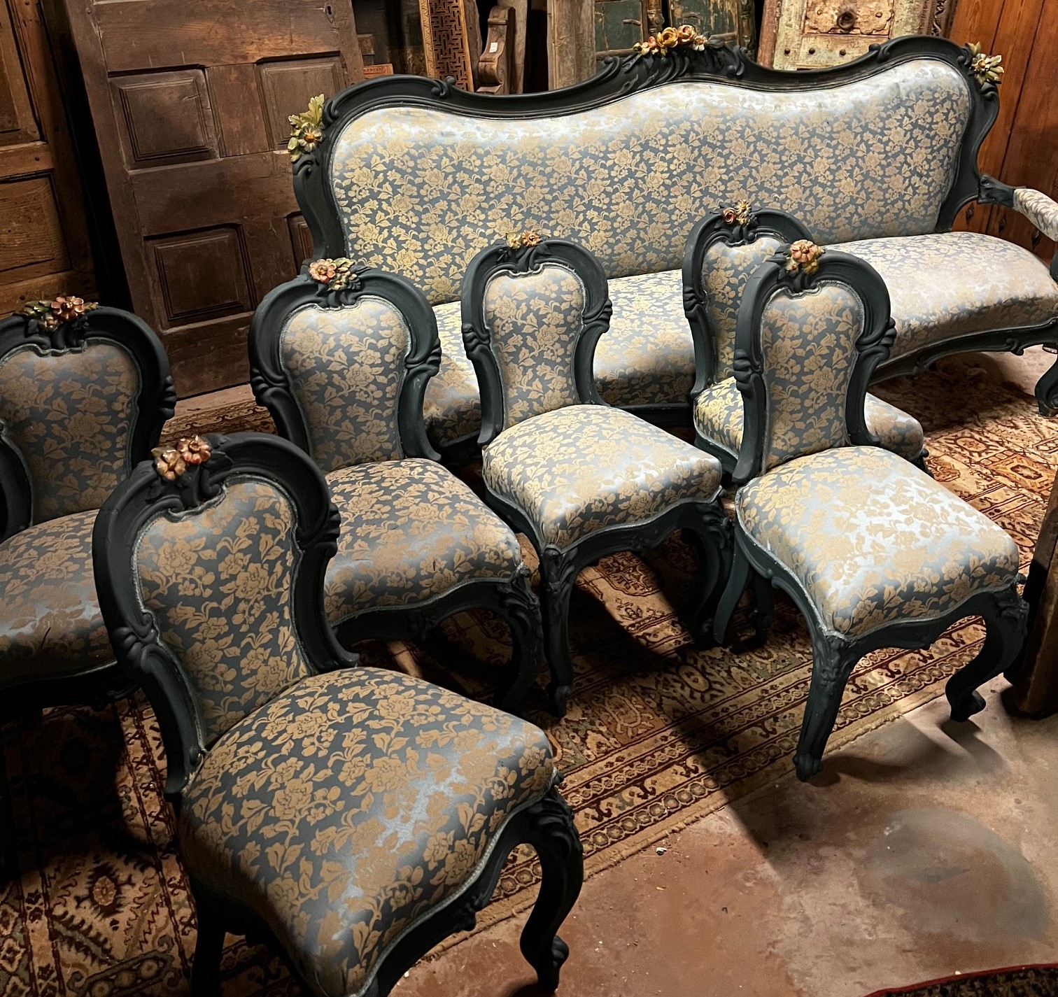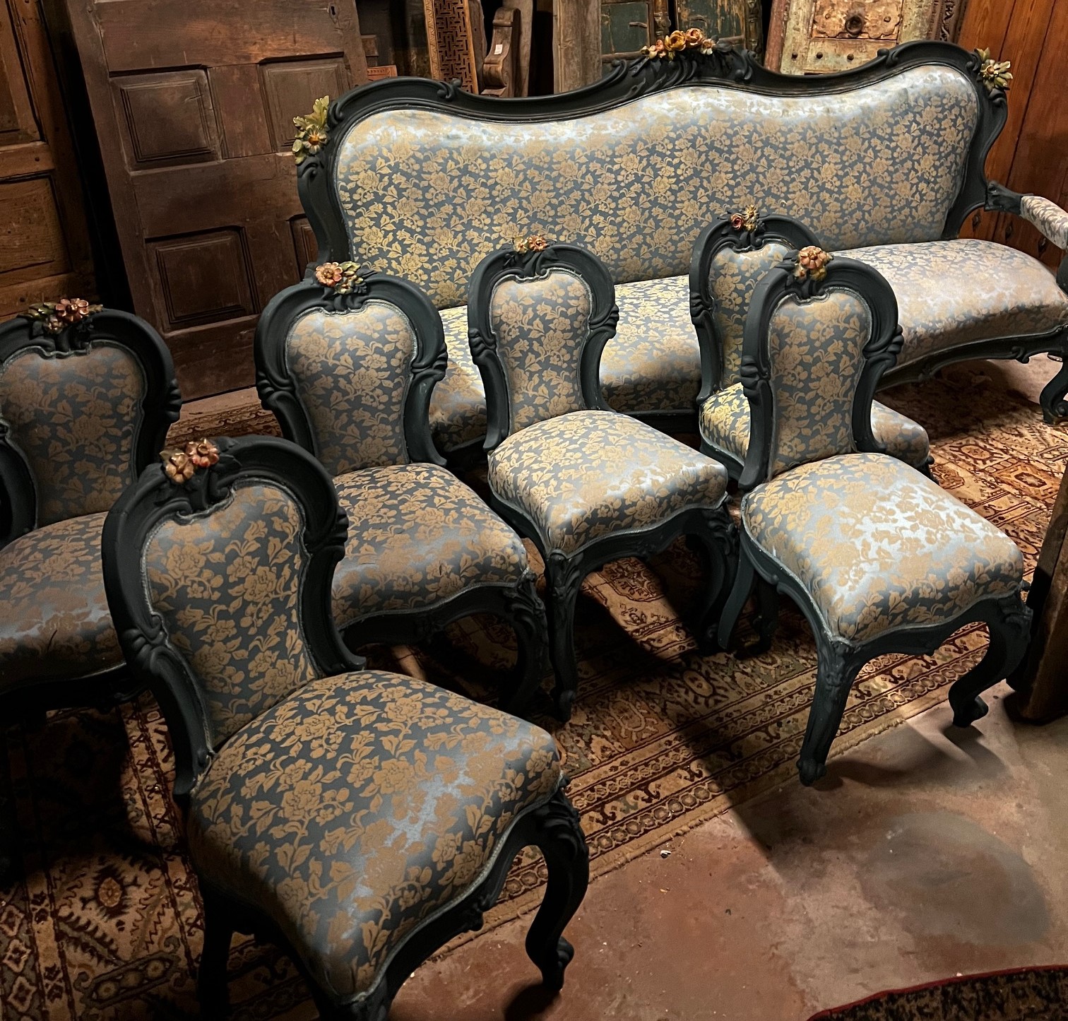 PANC131 - Salotto Liberty composto da 6 sedie, 2 poltrone, divano e consolle, epoca '900