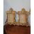 Incantevole coppia di piccole specchierine in legno di cirmolo, finemente intagliate e dorate con foglia d'oro. Le cornici sono ornate da eleganti girali vegetali che culminano in una cimasa decorata con motivi fitomorfi, così come anche la base è anch’essa fitomorfa, una decorazione che dona...