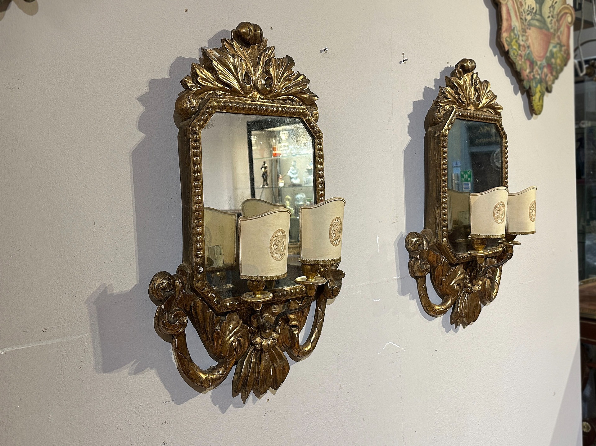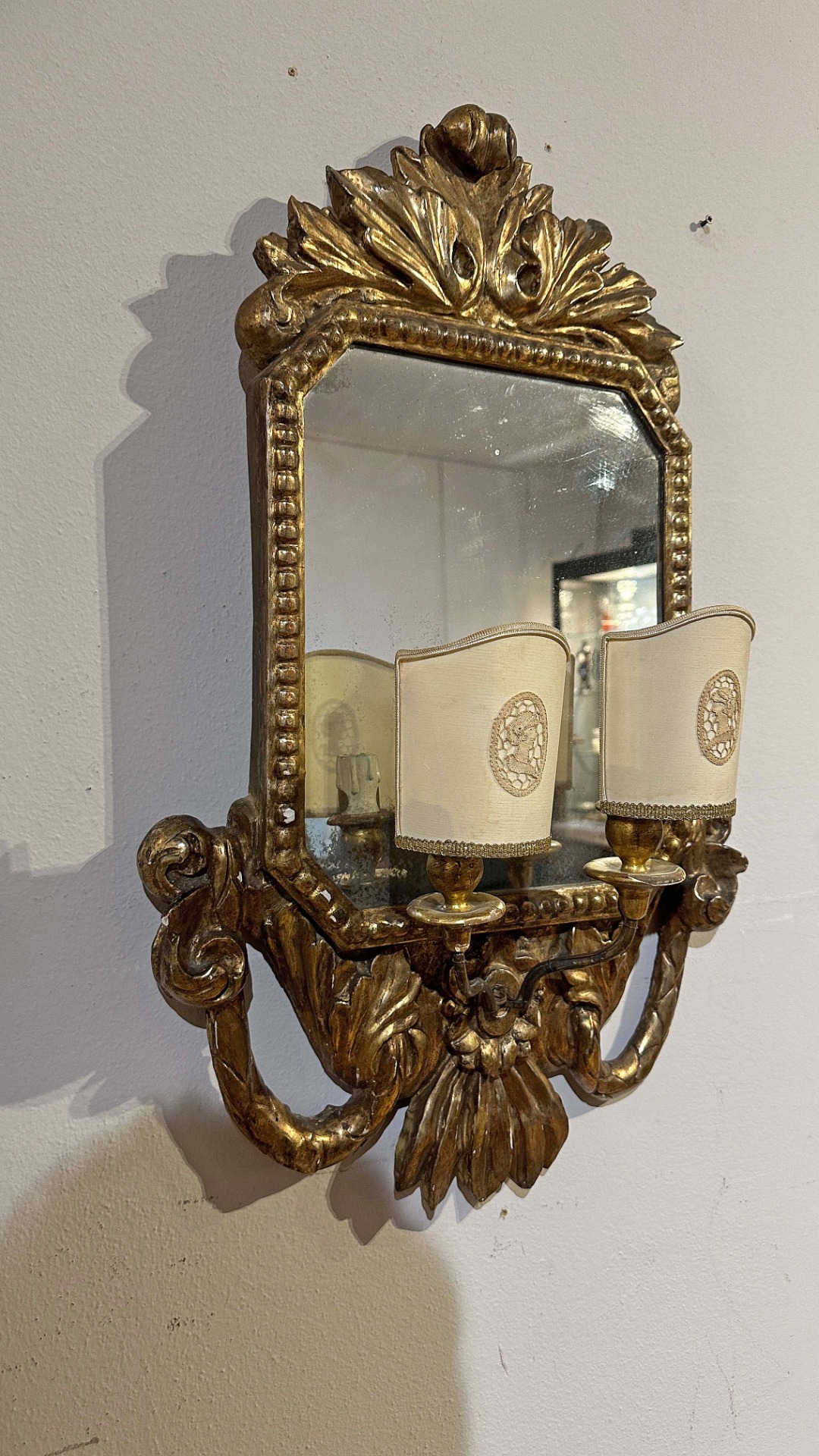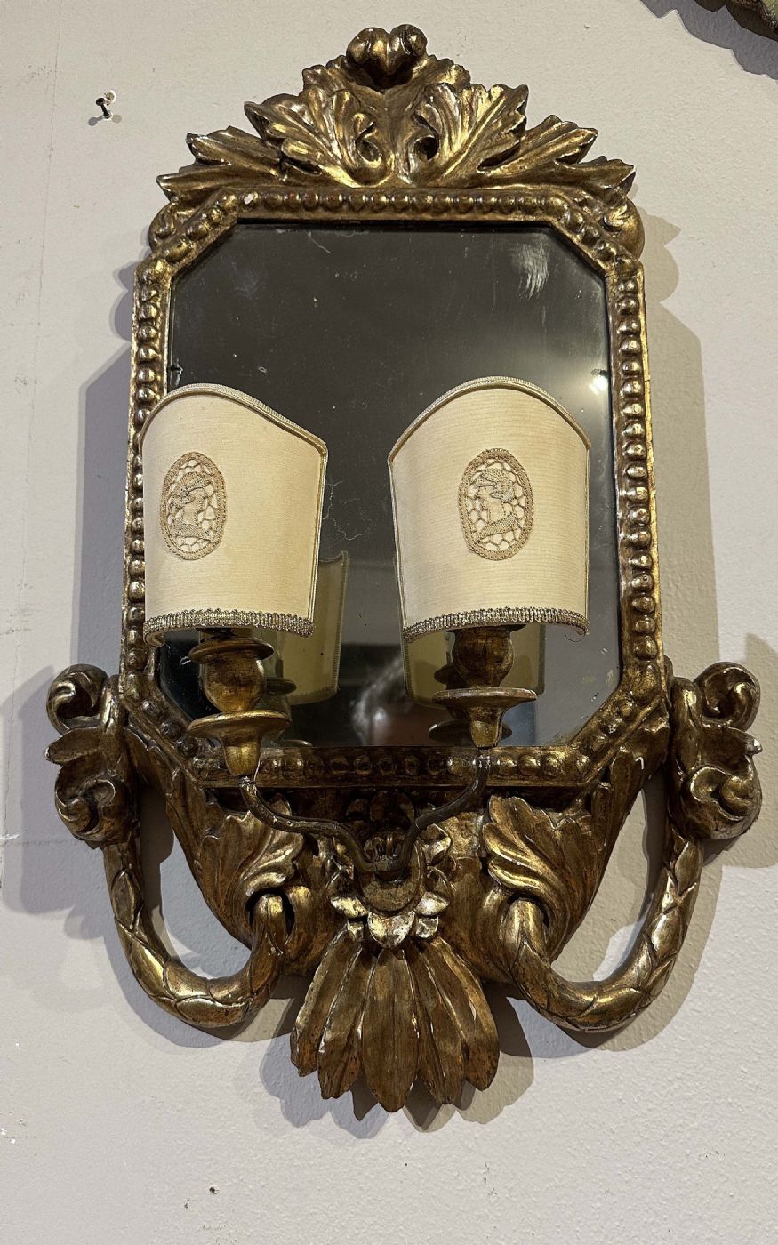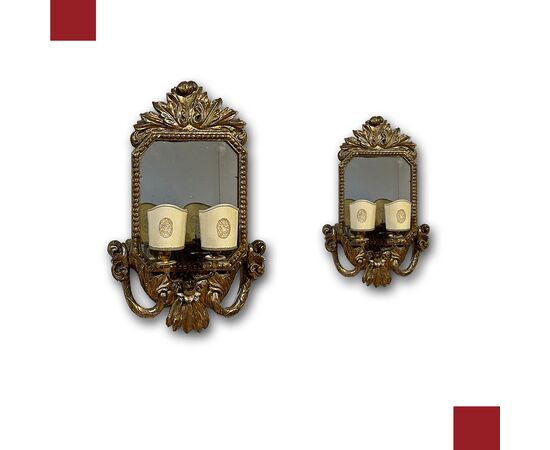 Raffinata coppia di specchi in legno di cirmolo intagliato e dorato a foglia d’oro zecchino, ciascuno dotato di due luci. La cornice si distingue per motivi geometrici ai lati dello specchio, mentre nella parte inferiore presenta intrecci e motivi fitomorfi, infine la cimasa è decorata da una corona fitomorfa a palmetta. Gli specchi sono in ottime condizioni, entrambi elettrificati e pronti all’uso, e sono completi di quattro paralumi caratterizzati al centro da un ricamo raffigurante un volto di donna di profilo. Si tratta di una coppia di ventoline di grande gusto e raffinatezza, capaci di arredare con classe ed eleganza qualsiasi ambiente. Manifattura toscana del periodo Carlo X, intorno alla prima metà del XIX secolo. Misure: H x L x P 70 x 43 x 16cm