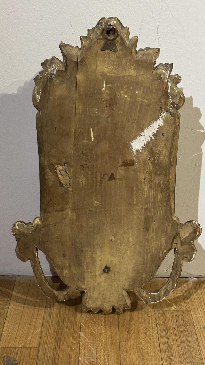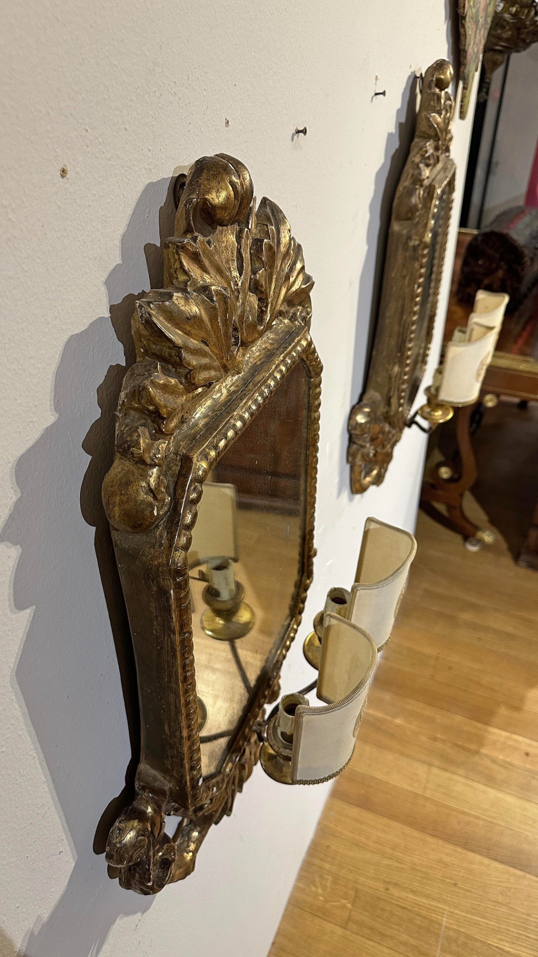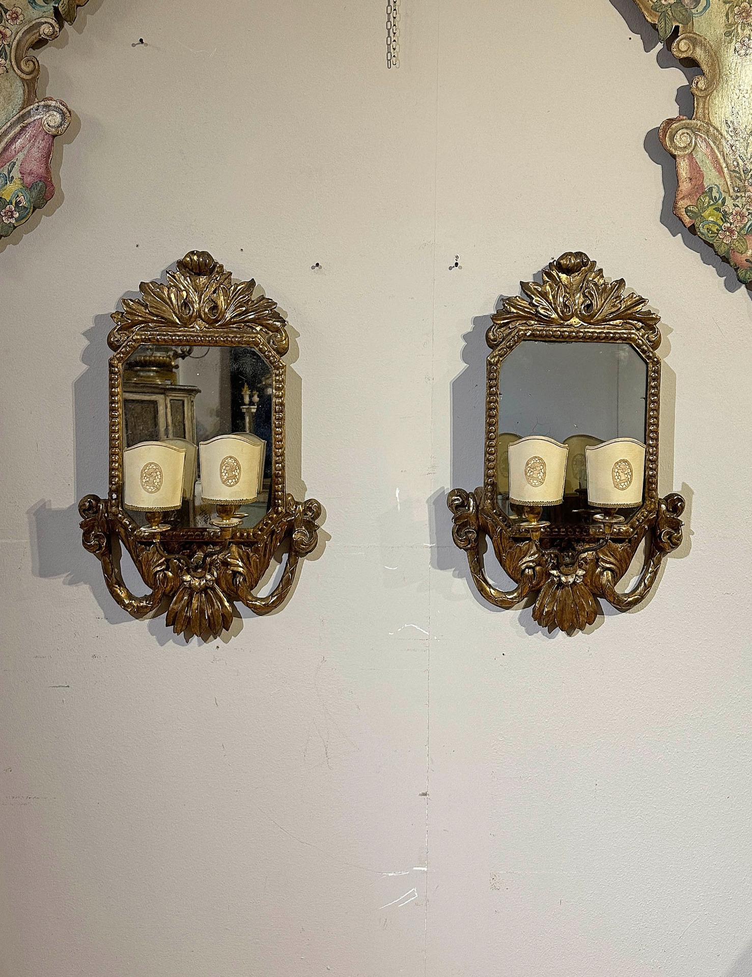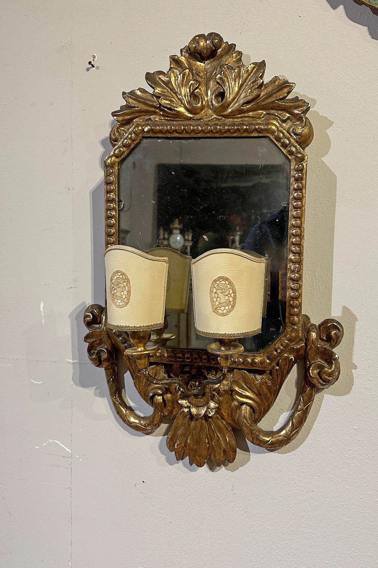 Raffinata coppia di specchi in legno di cirmolo intagliato e dorato a foglia d’oro zecchino, ciascuno dotato di due luci. La cornice si distingue per motivi geometrici ai lati dello specchio, mentre nella parte inferiore presenta intrecci e motivi fitomorfi, infine la cimasa è decorata da una corona fitomorfa a palmetta. Gli specchi sono in ottime condizioni, entrambi elettrificati e pronti all’uso, e sono completi di quattro paralumi caratterizzati al centro da un ricamo raffigurante un volto di donna di profilo. Si tratta di una coppia di ventoline di grande gusto e raffinatezza, capaci di arredare con classe ed eleganza qualsiasi ambiente. Manifattura toscana del periodo Carlo X, intorno alla prima metà del XIX secolo. Misure: H x L x P 70 x 43 x 16cm