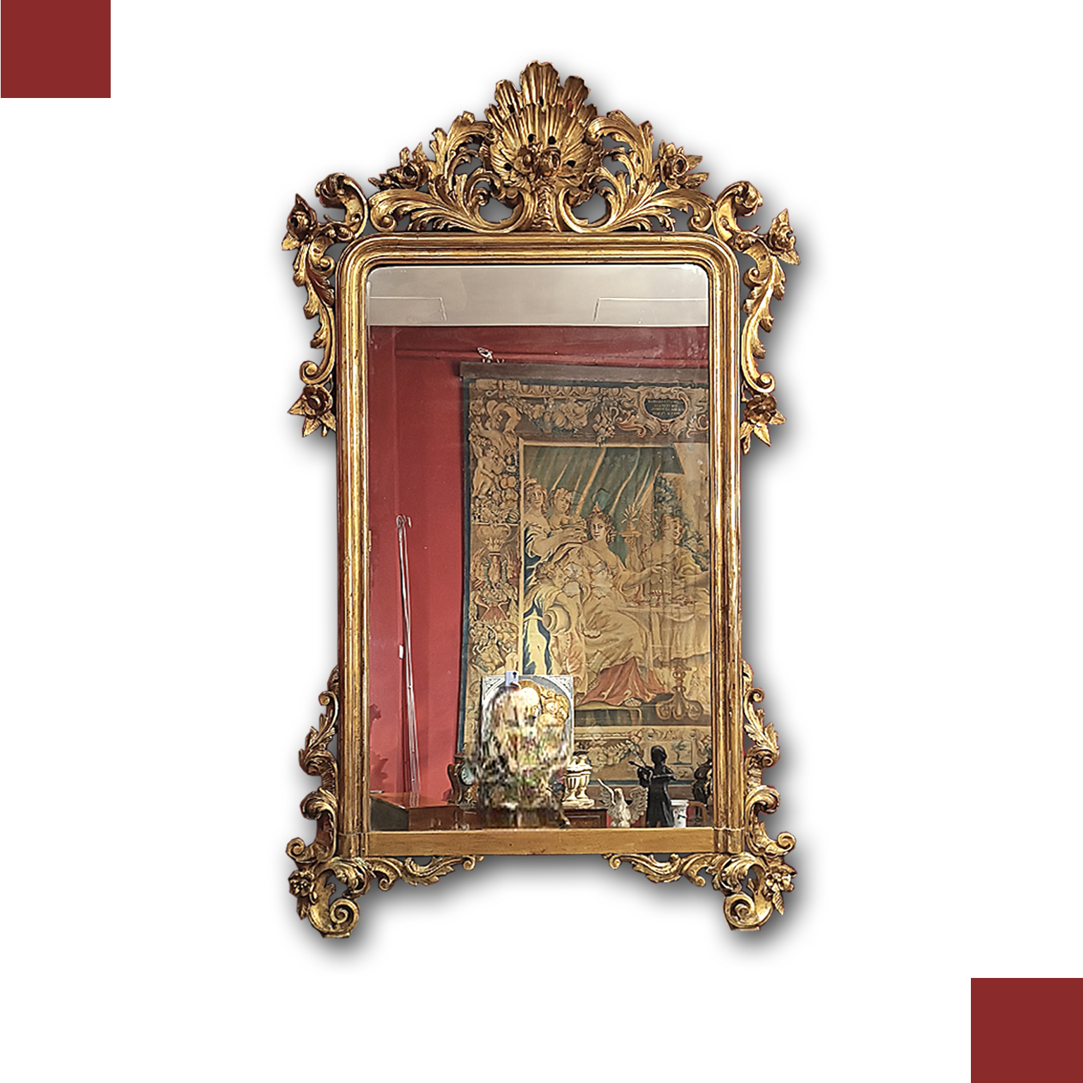Elegante specchiera di grandi dimensioni in legno di cirmolo, intagliata e dorata a foglia d'oro zecchino. La cornice si presenta ornata da decorazioni nella parte superiore e inferiore, caratterizzate da grandi riccioli e intrecci vegetali che ne accentuano l'eleganza, culminando in una cimasa terminante con una foglia a forma di conchiglia. Lo specchio, infine, si trova in ottimo stato di conservazione. Si tratta di una specchiera di grande gusto ed eleganza, capace di arredare con classe e raffinatezza qualsiasi ambiente. Manifattura italiana del periodo Luigi Filippo, intorno alla prima metà del XIX secolo. Misure: H x L x P 265 x 149 x 5cm