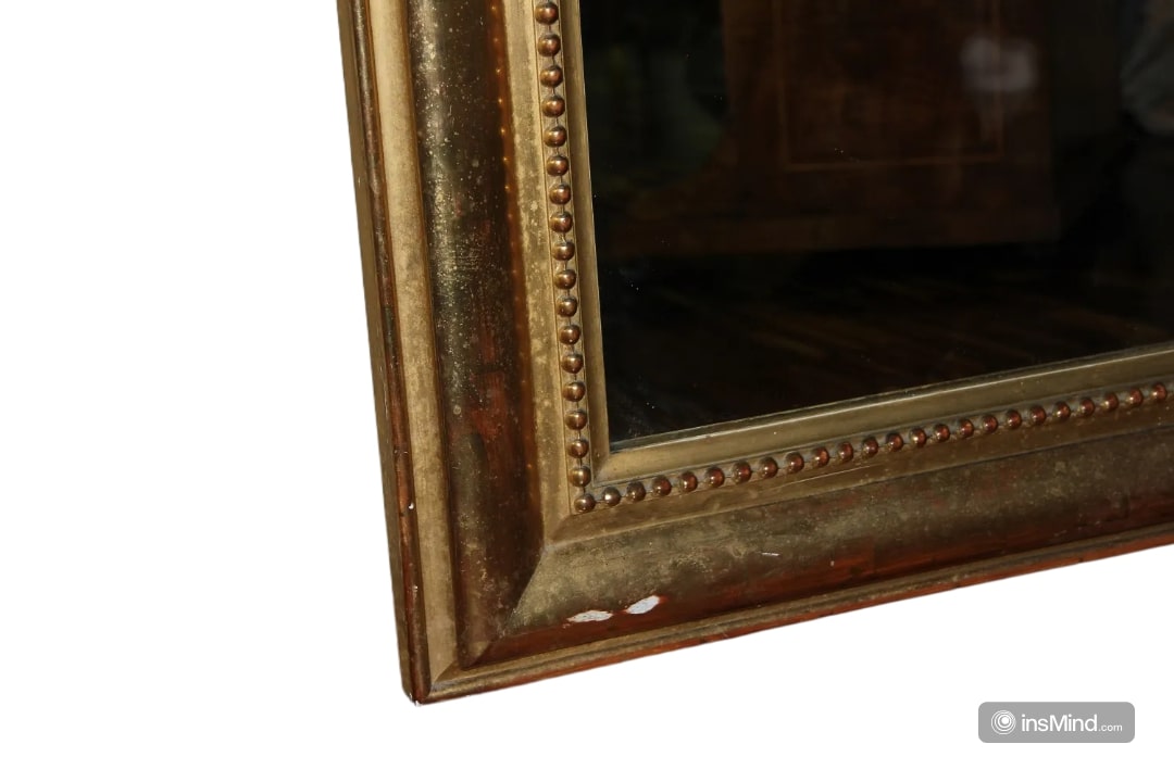 Grande specchiera francese della seconda metà del 1800, stile Luigi XVI, in legno dorato foglia oro. Presenta ricca cimasa nel corpo superiore e perlinatura lungo tutta cornice.