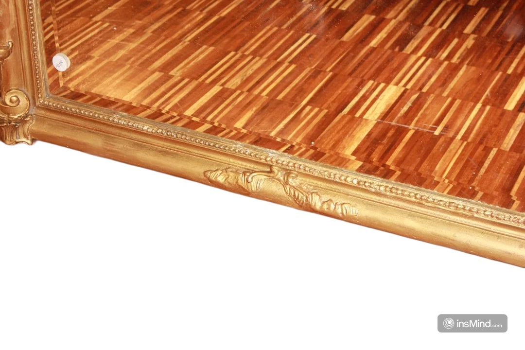 Bellissima grande specchiera francese della seconda metà del 1800, stile Luigi XV, in legno dorato foglia oro. Presenta ricca cimasa nel corpo superiore e fregi lungo la cornice dorata.