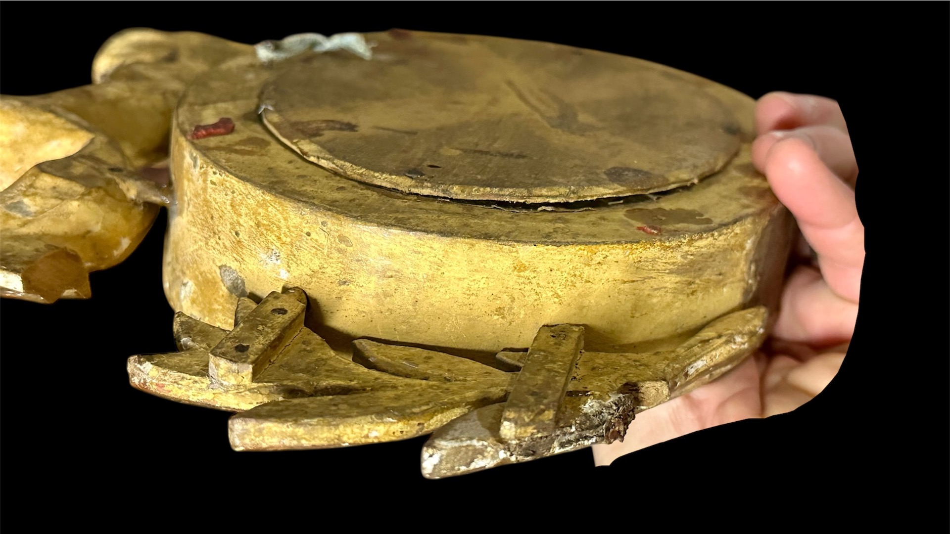 La doratura a foglia, in parte consumata dal tempo, conferisce alla superficie un affascinante effetto vissuto.