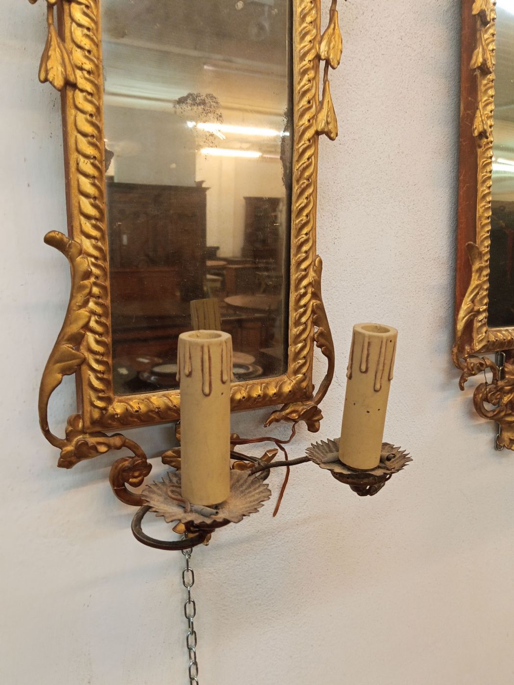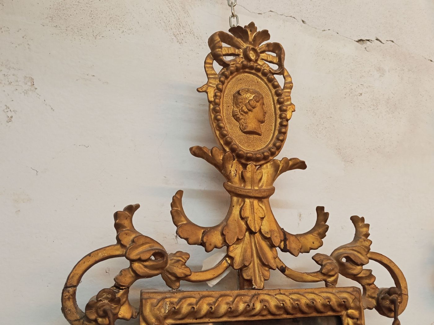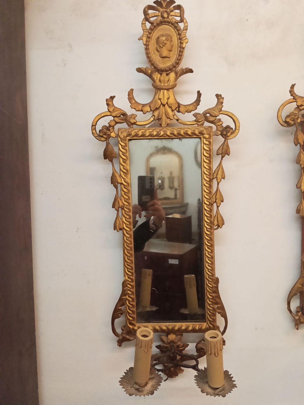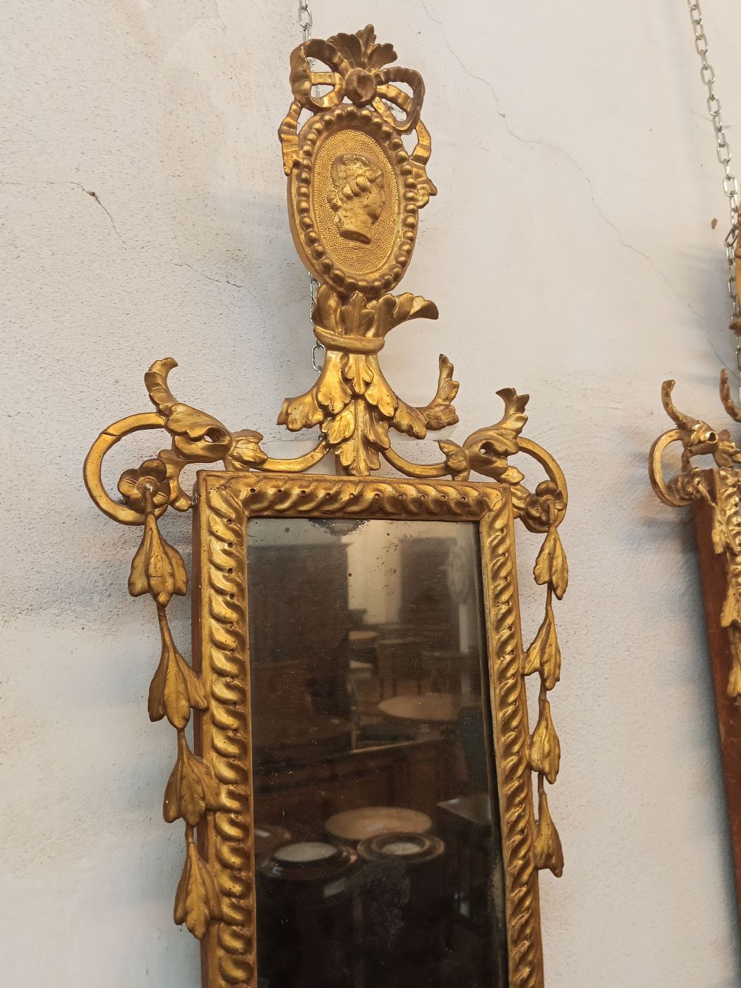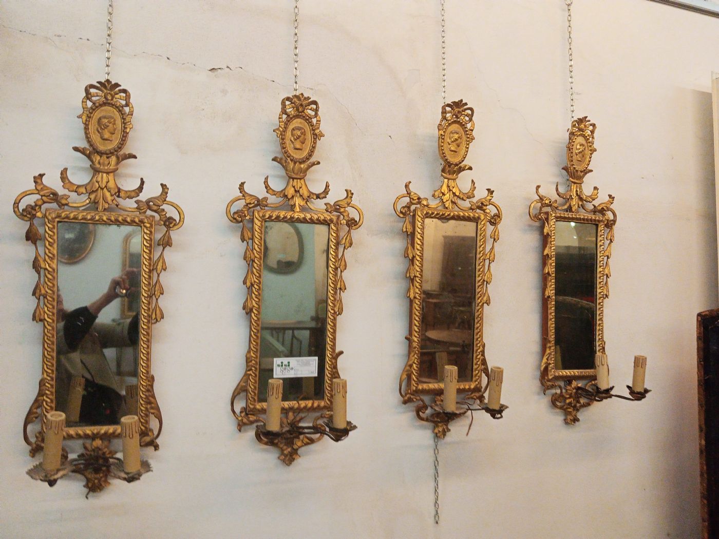 Serie di 4 specchierine in legno dorato con foglie intagliate e cameo con fiocco per cimasa.Le specchierine presentano anche possibilità di luci. Dimensione di ciascuna :28x88h.